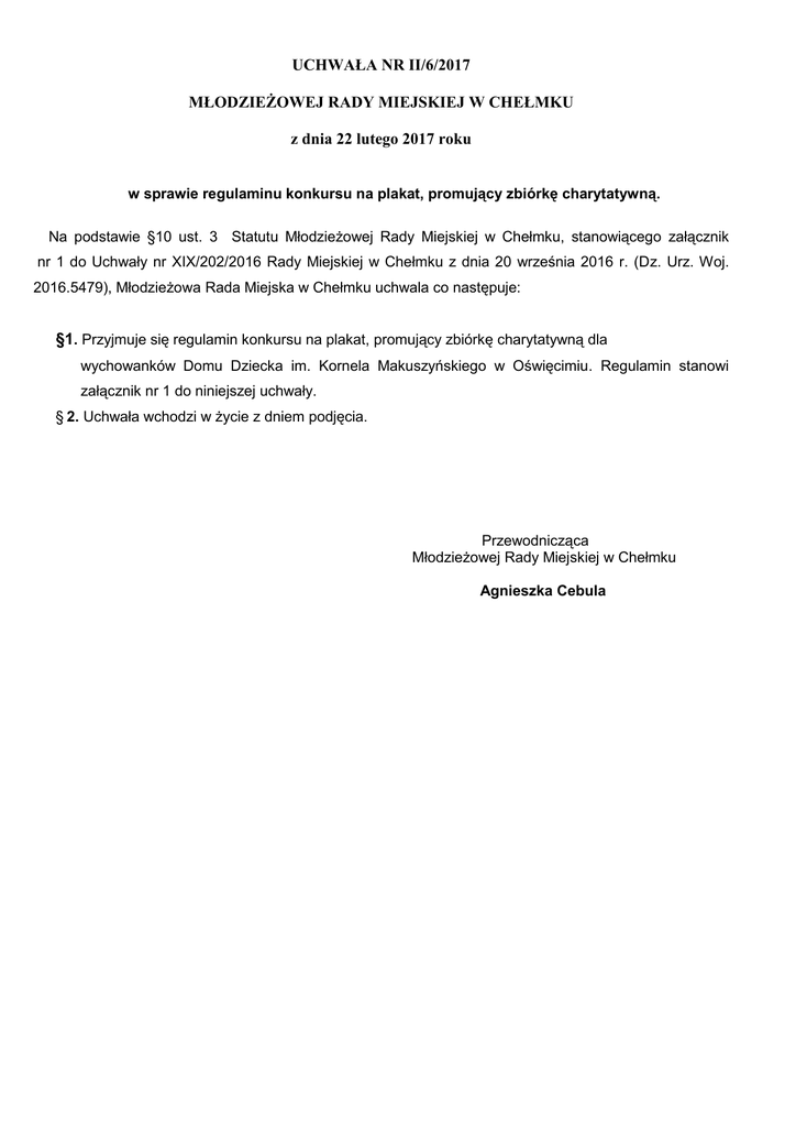 UCHWAŁA NR II/6/2017 MŁODZIEŻOWEJ RADY MIEJSKIEJ W CHEŁMKU z dnia 22 lutego 2017 roku w sprawie regulaminu konkursu na plakat, promujący zbiórkę charytatywną. Na podstawie §10 ust. 3 Statutu Młodzieżowej Rady Miejskiej w Chełmku, stanowiącego załącznik nr 1 do Uchwały nr XIX/202/2016 Rady Miejskiej w Chełmku z dnia 20 września 2016 r. (Dz. Urz. Woj. 2016.5479), Młodzieżowa Rada Miejska w Chełmku uchwala co następuje: §1. Przyjmuje się regulamin konkursu na plakat, promujący zbiórkę charytatywną dla wychowanków Domu Dziecka im. Kornela Makuszyńskiego w Oświęcimiu. Regulamin stanowi załącznik nr 1 do niniejszej uchwały. § 2. Uchwała wchodzi w życie z dniem podjęcia. Przewodnicząca Młodzieżowej Rady Miejskiej w Chełmku Agnieszka Cebula Załącznik Nr 1 do Uchwały Nr II/6/2017 Młodzieżowej Rady Miejskiej w Chełmku z dnia 22 lutego 2017 r. REGULAMIN Konkursu na plakat promujący zbiórkę charytatywną dla wychowanków Domu Dziecka im. Kornela Makuszyńskiego w Oświęcimiu Postanowienia ogólne 1. Organizatorem konkursu jest Młodzieżowa Rada Miejska w Chełmku. 2. Konkurs skierowany jest do uczniów przedszkoli, szkół podstawowych i gimnazjum z terenu Gminy Chełmek. 3. Przedmiotem konkursu jest wykonanie plakatu promującego zbiórkę charytatywną dla wychowanków Domu Dziecka im. Kornela Makuszyńskiego w Oświęcimiu. Cele konkursu 1. Celem konkursu jest zachęcenie młodych ludzi do rozwoju zainteresowań plastyczno-artystycznych. 2. Pośrednim celem konkursu jest także promowanie zbiórki charytatywnej, o której mowa w postanowieniach ogólnych. Wymogi techniczne i formalne dotyczące plakatu 1. Prace mogą zostać wykonane dowolną techniką plastyczną lub komputerową. 2. Rozmiar plakatu to: A4 lub A3. 3. Konkurs rozpoczyna się 27 lutego i zakończy 7 marca 2017 roku o godzinie 15:30. Prace przekazane po terminie, tzn. 7 marca 2017 roku nie zostaną uwzględnione. 4. Do konkursu mogą być zgłaszane wyłącznie plakaty autorstwa uczestnika, nienaruszające praw autorskich osób trzecich. 5. Prace należy składać do dyrektorów poszczególnych szkół, którzy później przekażą je do komisji konkursowej. 6. Wszystkie prace zgłoszone na konkurs oraz prawa autorskie przechodzą na własność organizatora. 7. Udział w konkursie jest jednoznaczny z akceptacją regulaminu. 8. Na rewersie pracy musi znaleźć się imię i nazwisko autora oraz nazwa szkoły. 9. Elementy, które muszą znaleźć się na plakacie: - Nazwa zbiórki: „Zbiórka charytatywna dla wychowanków Domu Dziecka im. Kornela Makuszyńskiego w Oświęcimiu. - Elementy zbiórki: Zbierane są prezenty, które zostaną przekazane przed świętami Wielkanocnymi, w szczególności: słodycze, żywność z długim terminem ważności (np. płatki kukurydziane), kosmetyki (np. żele pod prysznic, dezodoranty w kulce, szampony dla dzieci, balsamy do ciała), zabawki, sprzęt sportowy, bidony do picia oraz parasolki dla dzieci. - Termin zbiórki: Zbiórka rozpoczyna się 13 marca 2017 roku a kończy 5 kwietnia 2017 roku. Ocena przekazanych prac 1. Oceny przekazanych prac dokonają członkowie Młodzieżowej Rady Miejskiej w Chełmku podczas spotkania w pierwszej połowie marca. 2. Wyniki konkursu zostaną przekazane do dyrektorów poszczególnych szkół oraz zostaną umieszczone na stronie internetowej www.chelmek.pl w zakładce Młodzieżowa Rada Miejska, informatorze gminnym „Echo Chełmka”, lokalnych mediach oraz mediach społecznościowych. 3. Nagrody dla laureatów zostaną przekazane podczas sesji Młodzieżowej Rady Miejskiej w Chełmku. Laureaci o terminie spotkania zostaną poinformowani. Postanowienia końcowe 1. Organizator konkursu zastrzega sobie możliwość zmian w regulaminie. 2. Organizator zastrzega również możliwość modyfikowania wyłonionych prac bez naruszania głównej koncepcji plakatu. 3. Regulamin zostanie umieszczony na stronie internetowej www.chelmek.pl w zakładce Młodzieżowa Rada Miejska oraz w mediach społecznościowych.