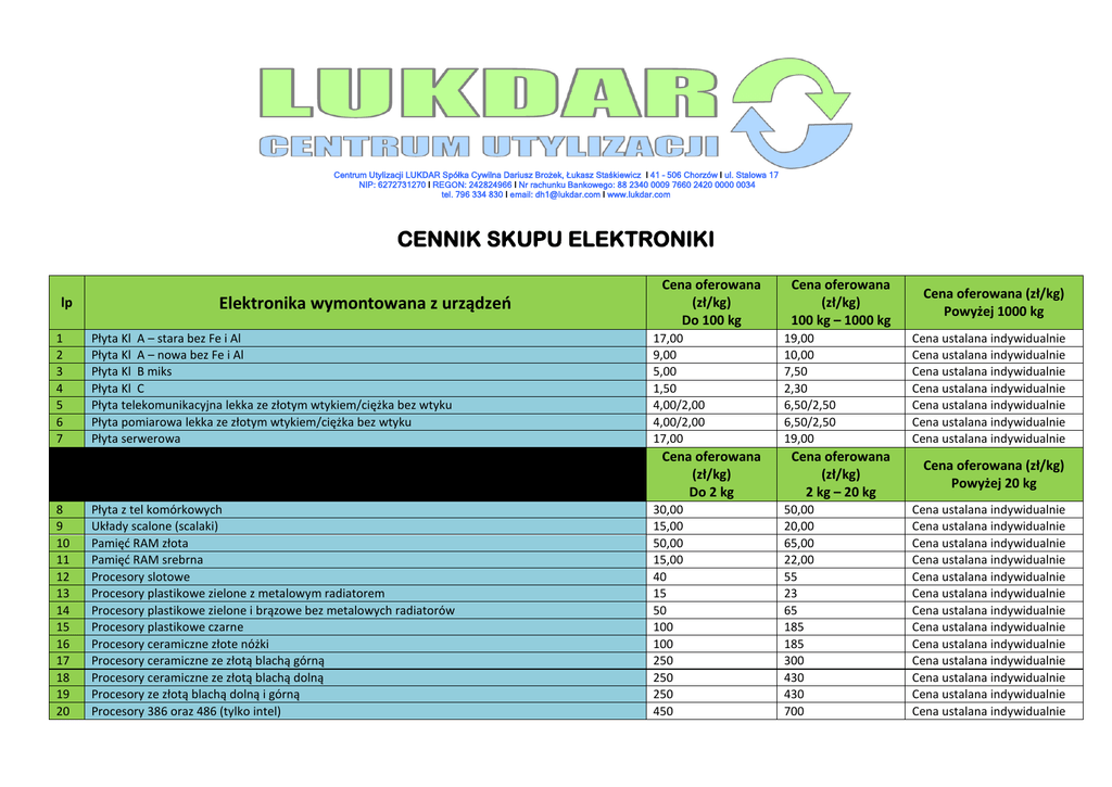 Centrum Utylizacji LUKDAR Spółka Cywilna Dariusz Brożek, Łukasz Staśkiewicz I 41 – 506 Chorzów I ul. Stalowa 17 NIP: 6272731270 I REGON: 242824966 I Nr rachunku Bankowego: 88 2340 0009 7660 2420 0000 0034 tel. 796 334 830 I email: [email protected] I www.lukdar.com CENNIK SKUPU ELEKTRONIKI lp 1 2 3 4 5 6 7 Elektronika wymontowana z urządzeo Płyta Kl A – stara bez Fe i Al Płyta Kl A – nowa bez Fe i Al Płyta Kl B miks Płyta Kl C Płyta telekomunikacyjna lekka ze złotym wtykiem/ciężka bez wtyku Płyta pomiarowa lekka ze złotym wtykiem/ciężka bez wtyku Płyta serwerowa Cena oferowana (zł/kg) Do 100 kg 17,00 9,00 5,00 1,50 4,00/2,00 4,00/2,00 17,00 Cena oferowana (zł/kg) Do 2 kg 8 9 10 11 12 13 14 15 16 17 18 19 20 Płyta z tel komórkowych Układy scalone (scalaki) Pamięd RAM złota Pamięd RAM srebrna Procesory slotowe Procesory plastikowe zielone z metalowym radiatorem Procesory plastikowe zielone i brązowe bez metalowych radiatorów Procesory plastikowe czarne Procesory ceramiczne złote nóżki Procesory ceramiczne ze złotą blachą górną Procesory ceramiczne ze złotą blachą dolną Procesory ze złotą blachą dolną i górną Procesory 386 oraz 486 (tylko intel) 30,00 15,00 50,00 15,00 40 15 50 100 100 250 250 250 450 Cena oferowana (zł/kg) 100 kg – 1000 kg 19,00 10,00 7,50 2,30 6,50/2,50 6,50/2,50 19,00 Cena oferowana (zł/kg) 2 kg – 20 kg 50,00 20,00 65,00 22,00 55 23 65 185 185 300 430 430 700 Cena oferowana (zł/kg) Powyżej 1000 kg Cena ustalana indywidualnie Cena ustalana indywidualnie Cena ustalana indywidualnie Cena ustalana indywidualnie Cena ustalana indywidualnie Cena ustalana indywidualnie Cena ustalana indywidualnie Cena oferowana (zł/kg) Powyżej 20 kg Cena ustalana indywidualnie Cena ustalana indywidualnie Cena ustalana indywidualnie Cena ustalana indywidualnie Cena ustalana indywidualnie Cena ustalana indywidualnie Cena ustalana indywidualnie Cena ustalana indywidualnie Cena ustalana indywidualnie Cena ustalana indywidualnie Cena ustalana indywidualnie Cena ustalana indywidualnie Cena ustalana indywidualnie 21 22 23 24 25 26 27 28 29 30 31 33 33 34 35 36 37 38 39 40 41 42 43 44 Napędy FDD, CD-ROM i DVD Zasilacze komputerowe bez kabla / z kablem Dyski twarde Ładowarki do laptopów i telefonów miks Cewki odchylające z kineskopów Transformatory Cu (za wyłączeniem transformatorów od świetlówek – dławików) Transformatory Cu ze świetlówek - dławiki Wirniki Silniczki małe (ksera, drukarki itp.) Silniki w obudowie Al Silniki w obudowie Fe Baterie Akumulatory Kable RTV AGD, Taśmy komputerowe, internetowe Kable ekranowe (pętle indukcyjne) Kabel – wiązki z zasilaczy Wtyczki lekkie (z taśm) Wtyczki ciężkie sygnałowe Chłodnice Al bez zanieczyszczeo Chodnice Cu bez zanieczyszczeo Sprężarki z lodówek bez oleju ABS szary (tylko z monitorów i telewizorów) ABS czarny (tylko z monitorów i telewizorów) ABS mix kolor Cena oferowana (zł/kg) Do 100 kg Cena oferowana (zł/kg) 100 kg – 1000 kg Cena oferowana (zł/kg) Powyżej 1000 kg 0,90 0,90/ 1,00 4,50 0,70 5,00 1,50 0,80 1,50 1,00 1,00 1,00 0,30 1,50 2,50 9,00 4,50 4,00 2,50 2,00 11,00 1,00 0,50 0,20 Nie przyjmujemy do odwołania 1,20 1,10/ 1,60 5,30 0,90 5,40 2,30 1,10 2,20 1,30 1,30 1,30 0,75 1,80 3,50 11,50 6,50 5,50 3,50 2,50 14,00 1,20 0,80 0,40 Nie przyjmujemy do odwołania Cena ustalana indywidualnie Cena ustalana indywidualnie Cena ustalana indywidualnie Cena ustalana indywidualnie Cena ustalana indywidualnie Cena ustalana indywidualnie Cena ustalana indywidualnie Cena ustalana indywidualnie Cena ustalana indywidualnie Cena ustalana indywidualnie Cena ustalana indywidualnie Cena ustalana indywidualnie Cena ustalana indywidualnie Cena ustalana indywidualnie Cena ustalana indywidualnie Cena ustalana indywidualnie Cena ustalana indywidualnie Cena ustalana indywidualnie Cena ustalana indywidualnie Cena ustalana indywidualnie Cena ustalana indywidualnie Cena ustalana indywidualnie Cena ustalana indywidualnie Nie przyjmujemy do odwołania CENNIK SKUPU ZSEiE lp 1 2 3 4 5 6 7 8 9 10 Zużyty sprzęt elektryczny i elektroniczny kompletny Laptopy, komputery, serwery, zasilacze UPS Monitory CRT Telewizory CRT w plastikowej obudowie Telewizory CRT w drewnianej obudowie Telewizory i monitory LCD Elektronarzędzia Sprzęt drukujący – kserokopiarki, drukarki, skanery, faxy Wielkogabarytowe AGD - sprzęt chłodniczy, pralki, zmywarki itp. Małogabarytowe AGD – roboty kuchenne, odkurzacze itp. / sprzęt audiowizualny – hi-fi, video itp. Myszki i klawiatury Cena oferowana (zł/kg) Do 100 kg nieodpłatnie nieodpłatnie nieodpłatnie nieodpłatnie nieodpłatnie nieodpłatnie nieodpłatnie nieodpłatnie nieodpłatnie nieodpłatnie Cena oferowana (zł/kg) 100 kg – 1000 kg 1,30 0,60 0,30 0,20 0,20 0,90 0,30 0,30 0,10 0,01 Cena oferowana (zł/kg) Powyżej 1000 kg 1,50 0,65 0,35 0,25 0,30 1,00 0,35 0,40 0,20 0,05 *Zużyty sprzęt elektryczny i elektroniczny zdekompletowany do indywidualnej wyceny Odpady, za których utylizację płaci Przekazujący: lp 1 2 3 4 5 Zużyty sprzęt elektryczny i elektroniczny Wielkogabarytowe AGD - sprzęt chłodniczy (bez agregatu) Wielkogabarytowe AGD - sprzęt chłodniczy (chłodziarki amoniakowe) Monitory, telewizory CRT bez elektroniki (kineskop w plastikowej obudowie) Świetlówki Zużyte tonery Wysokość opłaty (zł/kg) Do 100 kg 0,10 100 zł/szt 0,25 1,00 1,00 Wysokość opłaty (zł/kg) 100 kg – 1000 kg 0,10 100 zł/szt 0,25 1,00 1,00 Wysokość opłaty (zł/kg) Powyżej 1000 kg 0,10 100 zł/szt 0,25 1,00 1,00 Warunki szczegółowe skupu odpadów elektronicznych: płytki elektroniczne typu płyty główne komputerowe powinny byd oczyszczone z baterii i radiatorów aluminiowych oraz elementów stalowych. W przypadku kiedy zanieczyszczenia takie nie będą usunięte cena jest obniżana od 10% do 30% w stosunku do wartości cennikowej płytki z telefonów komórkowych powinny byd przygotowane bez blach, plastiku itp. W przypadku kiedy z