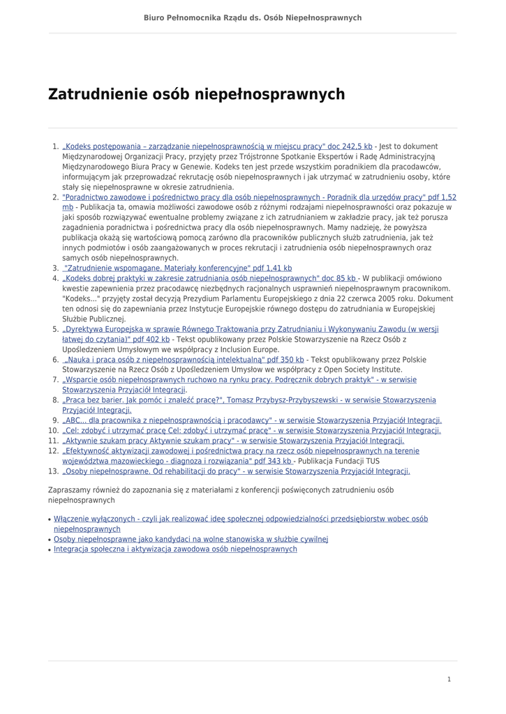 Biuro Pełnomocnika Rządu ds. Osób Niepełnosprawnych Zatrudnienie osób niepełnosprawnych 1. „Kodeks postępowania – zarządzanie niepełnosprawnością w miejscu pracy" doc 242,5 kb - Jest to dokument Międzynarodowej Organizacji Pracy, przyjęty przez Trójstronne Spotkanie Ekspertów i Radę Administracyjną Międzynarodowego Biura Pracy w Genewie. Kodeks ten jest przede wszystkim poradnikiem dla pracodawców, informującym jak przeprowadzać rekrutację osób niepełnosprawnych i jak utrzymać w zatrudnieniu osoby, które stały się niepełnosprawne w okresie zatrudnienia. 2. "Poradnictwo zawodowe i pośrednictwo pracy dla osób niepełnosprawnych - Poradnik dla urzędów pracy" pdf 1,52 mb - Publikacja ta, omawia możliwości zawodowe osób z różnymi rodzajami niepełnosprawności oraz pokazuje w jaki sposób rozwiązywać ewentualne problemy związane z ich zatrudnianiem w zakładzie pracy, jak też porusza zagadnienia poradnictwa i pośrednictwa pracy dla osób niepełnosprawnych. Mamy nadzieję, że powyższa publikacja okażą się wartościową pomocą zarówno dla pracowników publicznych służb zatrudnienia, jak też innych podmiotów i osób zaangażowanych w proces rekrutacji i zatrudnienia osób niepełnosprawnych oraz samych osób niepełnosprawnych. 3. "Zatrudnienie wspomagane. Materiały konferencyjne" pdf 1,41 kb 4. „Kodeks dobrej praktyki w zakresie zatrudniania osób niepełnosprawnych" doc 85 kb - W publikacji omówiono kwestie zapewnienia przez pracodawcę niezbędnych racjonalnych usprawnień niepełnosprawnym pracownikom. "Kodeks..." przyjęty został decyzją Prezydium Parlamentu Europejskiego z dnia 22 czerwca 2005 roku. Dokument ten odnosi się do zapewniania przez Instytucje Europejskie równego dostępu do zatrudniania w Europejskiej Służbie Publicznej. 5. „Dyrektywa Europejska w sprawie Równego Traktowania przy Zatrudnianiu i Wykonywaniu Zawodu (w wersji łatwej do czytania)" pdf 402 kb - Tekst opublikowany przez Polskie Stowarzyszenie na Rzecz Osób z Upośledzeniem Umysłowym we współpracy z Inclusion Europe. 6. „Nauka i praca osób z niepełnosprawnością intelektualną" pdf 350 kb - Tekst opublikowany przez Polskie Stowarzyszenie na Rzecz Osób z Upośledzeniem Umysłow we współpracy z Open Society Institute. 7. „Wsparcie osób niepełnosprawnych ruchowo na rynku pracy. Podręcznik dobrych praktyk" - w serwisie Stowarzyszenia Przyjaciół Integracji. 8. „Praca bez barier. Jak pomóc i znaleźć pracę?", Tomasz Przybysz-Przybyszewski - w serwisie Stowarzyszenia Przyjaciół Integracji. 9. „ABC... dla pracownika z niepełnosprawnością i pracodawcy" - w serwisie Stowarzyszenia Przyjaciół Integracji. 10. „Cel: zdobyć i utrzymać pracę Cel: zdobyć i utrzymać pracę" - w serwisie Stowarzyszenia Przyjaciół Integracji. 11. „Aktywnie szukam pracy Aktywnie szukam pracy" - w serwisie Stowarzyszenia Przyjaciół Integracji. 12. „Efektywność aktywizacji zawodowej i pośrednictwa pracy na rzecz osób niepełnosprawnych na terenie województwa mazowieckiego - diagnoza i rozwiązania" pdf 343 kb - Publikacja Fundacji TUS 13. „Osoby niepełnosprawne. Od rehabilitacji do pracy" - w serwisie Stowarzyszenia Przyjaciół Integracji. Zapraszamy również do zapoznania się z materiałami z konferencji poświęconych zatrudnieniu osób niepełnosprawnych ● ● ● Włączenie wyłączonych - czyli jak realizować ideę społecznej odpowiedzialności przedsiębiorstw wobec osób niepełnosprawnych Osoby niepełnosprawne jako kandydaci na wolne stanowiska w służbie cywilnej Integracja społeczna i aktywizacja zawodowa osób niepełnosprawnych 1