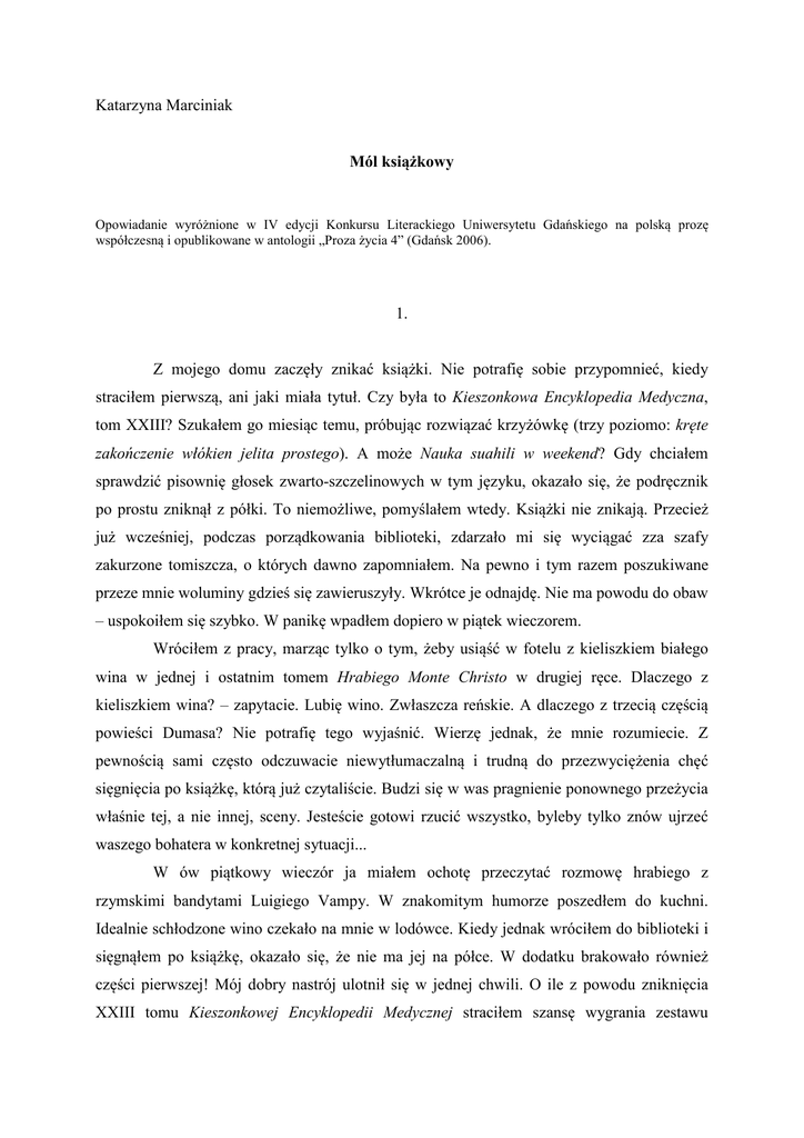 Katarzyna Marciniak Mól książkowy Opowiadanie wyróżnione w IV edycji Konkursu Literackiego Uniwersytetu Gdańskiego na polską prozę współczesną i opublikowane w antologii „Proza życia 4” (Gdańsk 2006). 1. Z mojego domu zaczęły znikać książki. Nie potrafię sobie przypomnieć, kiedy straciłem pierwszą, ani jaki miała tytuł. Czy była to Kieszonkowa Encyklopedia Medyczna, tom XXIII? Szukałem go miesiąc temu, próbując rozwiązać krzyżówkę (trzy poziomo: kręte zakończenie włókien jelita prostego). A może Nauka suahili w weekend? Gdy chciałem sprawdzić pisownię głosek zwarto-szczelinowych w tym języku, okazało się, że podręcznik po prostu zniknął z półki. To niemożliwe, pomyślałem wtedy. Książki nie znikają. Przecież już wcześniej, podczas porządkowania biblioteki, zdarzało mi się wyciągać zza szafy zakurzone tomiszcza, o których dawno zapomniałem. Na pewno i tym razem poszukiwane przeze mnie woluminy gdzieś się zawieruszyły. Wkrótce je odnajdę. Nie ma powodu do obaw – uspokoiłem się szybko. W panikę wpadłem dopiero w piątek wieczorem. Wróciłem z pracy, marząc tylko o tym, żeby usiąść w fotelu z kieliszkiem białego wina w jednej i ostatnim tomem Hrabiego Monte Christo w drugiej ręce. Dlaczego z kieliszkiem wina? – zapytacie. Lubię wino. Zwłaszcza reńskie. A dlaczego z trzecią częścią powieści Dumasa? Nie potrafię tego wyjaśnić. Wierzę jednak, że mnie rozumiecie. Z pewnością sami często odczuwacie niewytłumaczalną i trudną do przezwyciężenia chęć sięgnięcia po książkę, którą już czytaliście. Budzi się w was pragnienie ponownego przeżycia właśnie tej, a nie innej, sceny. Jesteście gotowi rzucić wszystko, byleby tylko znów ujrzeć waszego bohatera w konkretnej sytuacji... W ów piątkowy wieczór ja miałem ochotę przeczytać rozmowę hrabiego z rzymskimi bandytami Luigiego Vampy. W znakomitym humorze poszedłem do kuchni. Idealnie schłodzone wino czekało na mnie w lodówce. Kiedy jednak wróciłem do biblioteki i sięgnąłem po książkę, okazało się, że nie ma jej na półce. W dodatku brakowało również części pierwszej! Mój dobry nastrój ulotnił się w jednej chwili. O ile z powodu zniknięcia XXIII tomu Kieszonkowej Encyklopedii Medycznej straciłem szansę wygrania zestawu Katarzyna Marciniak, Mól książkowy, s. 2/18 kosmetyków do demakijażu, z czym szybko się pogodziłem, to utrata Hrabiego Monte Christo była dla mnie ciosem w samo serce. Książki nie znikają, powiedziałem na głos. I wówczas uświadomiłem sobie z przerażeniem, że od kilku tygodni, a może nawet miesięcy, moja biblioteka powoli topnieje. Rzut oka na półki wystarczył, żebym dostrzegł ślady ogromnego spustoszenia. Coraz mniej było ciasno stłoczonych tomów; pozostałe osuwały się bezładnie w wolne przestrzenie tam, gdzie kiedyś z wielkim trudem wciskałem kolejne nabytki. Książki nie znikają, powtórzyłem z przekonaniem. Postanowiłem działać, a ponieważ najskuteczniej działam w pozycji siedzącej, opadłem ciężko na fotel i zacząłem analizować sytuację, w której się znalazłem. Za punkt wyjścia do dalszych rozważań przyjąłem założenie proste i nie budzące żadnych wątpliwości: jako że książki NIE znikają, MUSI istnieć racjonalne wyjaśnienie zaginięcia jednej trzeciej moich zbiorów. Wypiłem kieliszek wina i zająłem się pierwszą hipotezą, która przyszła mi do głowy: książki pożyczyłem znajomym, a następnie zupełnie o tym zapomniałem. Takie wytłumaczenie żałosnego stanu mojej biblioteki z pewnością bardzo by mnie uspokoiło. Niestety, musiałem je odrzucić z dwóch powodów. Primo: poza przyjacielem z dzieciństwa, Karolem, nie mam żadnych znajomych. Secundo: ja z zasady nikomu nie pożyczam książek. Nawet Karolowi, mimo że jest szanowanym właścicielem wielkiego antykwariatu i dba o każdy tom jak o najcenniejszy skarb. Po wypiciu drugiej lampki wina odrzuciłem drugą racjonalną hipotezę. Książek nikt nie ukradł. W mieszkaniu nie było śladów włamania, a pancerne drzwi i kraty w oknach, które kazałem zamontować, żeby chronić moje zbiory, pozostały nienaruszone. W akcie desperacji, wychyliwszy trzeci kieliszek, odsunąłem nawet szafy biblioteczne, ale i tam nie było niczego poza cienką warstwą kurzu. Książki nie znikają, powiedziałem stanowczo. Ale moje zniknęły. 2. Było już po północy, gdy chwyciłem za telefon i zadzwoniłem do Karola: - Musisz mi pomóc! - powiedziałem. - To ty, Marek? Co się stało? - Z mojego domu zaczęły znikać książki. Spodziewałem się, że przyjaciel mnie wyśmieje, ale on spytał z powagą: Katarzyna Marciniak, Mól książkowy, s. 3/18 - Znikać? Co przez to rozumiesz? - Nic nie rozumiem! - wybuchłem. - Po prostu... Moje książki... Wcześniej były, a teraz ich nie ma! Zostały tylko puste miejsca na półkach tam, gdzie kiedyś stały! - A może pożyczyłeś je komuś i nie pamiętasz, komu ani kiedy? - No wiesz! Przecież ja nawet tobie nie pożyczyłbym ani jednej! - zawołałem urażony. - Racja - potwierdził Karol. - A nie znalazłeś śladów włamania? - spytał z nadzieją. - Żadnych - odparłem krótko. Przez dłuższą chwilę z drugiej strony słuchawki dobiegał tylko ciężki oddech Karola. Wreszcie mój przyjaciel odezwał się grobowym głosem: - Obawiam się, że nic nie możesz zrobić. - Jak to? - wyjąkałem. - Jest tylko jedno racjonalne wyjaśnienie. W twoim domu zagnieździł się mól książkowy. - Żartujesz sobie ze mnie?! - ryknąłem. - Mól książkowy?! I to ma być racjonalne wyjaśnienie? - zaniosłem się histerycznym śmiechem. - Opanuj się, Marek! Mówię najzupełniej poważnie - odparł spokojnie Karol. - Jeden z moich klientów, wiesz, ten, dla którego zorganizowałem w zeszłym roku Kopernika, miał podobny problem. Wyjechał z rodziną na wakacje, a kiedy wrócił, okazało się, że jego