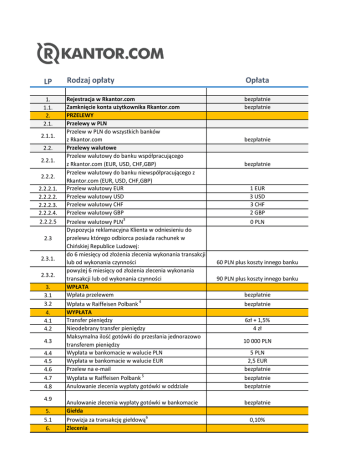 LP Rodzaj opłaty Opłata 1. 1.1. 2. 2.1. Rejestracja w Rkantor.com Zamknięcie konta użytkownika Rkantor.com PRZELEWY Przelewy w PLN Przelew w PLN do wszystkich banków z Rkantor.com Przelewy walutowe Przelew walutowy do banku współpracującego z Rkantor.com (EUR, USD, CHF,GBP) Przelew walutowy do banku niewspółpracującego z Rkantor.com (EUR, USD, CHF,GBP) Przelew walutowy EUR Przelew walutowy USD Przelew walutowy CHF Przelew walutowy GBP Przelew walutowy PLN3 Dyspozycja reklamacyjna Klienta w odniesieniu do przelewu którego odbiorca posiada rachunek w Chińskiej Republice Ludowej: do 6 miesięcy od złożenia zlecenia wykonania transakcji lub od wykonania czynności powyżej 6 miesięcy od złożenia zlecenia wykonania transakcji lub od wykonania czynności WPŁATA Wpłata przelewem Wpłata w Raiffeisen Polbank 4 WYPŁATA Transfer pieniędzy Nieodebrany transfer pieniędzy Maksymalna ilość gotówki do przesłania jednorazowo transferem pieniędzy Wypłata w bankomacie w walucie PLN Wypłata w bankomacie w walucie EUR Przelew na e-mail Wypłata w Raiffeisen Polbank 5 Anulowanie zlecenia wypłaty gotówki w oddziale bezpłatnie bezpłatnie 2.1.1. 2.2. 2.2.1. 2.2.2. 2.2.2.1. 2.2.2.2. 2.2.2.3. 2.2.2.4. 2.2.2.5 2.3 2.3.1. 2.3.2. 3. 3.1 3.2 4. 4.1 4.2 4.3 4.4 4.5 4.6 4.7 4.8 4.9 5. 5.1 6. Anulowanie zlecenia wypłaty gotówki w bankomacie Giełda Prowizja za transakcję giełdową6 Zlecenia bezpłatnie bezpłatnie 1 EUR 3 USD 3 CHF 2 GBP 0 PLN 60 PLN plus koszty innego banku 90 PLN plus koszty innego banku bezpłatnie bezpłatnie 6zł + 1,5% 4 zł 10 000 PLN 5 PLN 2,5 EUR bezpłatnie bezpłatnie bezpłatnie bezpłatnie 0,10% 6.1 6.2 Wymiana waluty Ustanowienie zlecenia zabezpieczającego7 bezpłatnie bezpłatnie 6.3 6.4 6.5 6.6 6.7 6.8 6.9 6.10 7. 7.1 7.2 7.3 8. 8.1 8.1.1 8.1.2 8.1.3 8.1.4 8.1.5 8.2 8.2.1 8.2.2 8.3 8.3.1 8.3.2 8.3.3 8.3.4 8.3.5 8.4 8.4.1 8.4.2 8.4.3 8.4.4 8.4.5 Ustanowienie zlecenia oczekującego8 Odwołanie zlecenia zabezpieczającego Odwołanie zlecenia oczekującego Wysłanie wiadomości SMS do autoryzacji zleceń Informacja SMS o zrealizowaniu/braku realizacji ustawionego zlecenia Dodanie zaufanego odbiorcy Modyfikacja zaufanego odbiorcy Usunięcie zaufanego odbiorcy Zlecenie stałe - spłata kredytu Utworzenie zlecenia stałego Modyfikacja zlecenia stałego Odwołanie zlecenia stałego Limity transakcyjne Oddział Raiffeisen POLBANK Maksymalna/minimalna kwota wpłaty/wypłaty w PLN Maksymalna/minimalna kwota wpłaty/wypłaty w Raiffeisen Polbank w EUR Maksymalna/minimalna kwota wpłaty/wypłaty w Raiffeisen Polbank w USD Maksymalna/minimalna kwota wpłaty/wypłaty w Raiffeisen Polbank w CHF Maksymalna/minimalna kwota wpłaty/wypłaty w Raiffeisen Polbank w GBP Bankomat EURONET Maksymalna/minimalna kwota wypłaty w bankomacie EURONET w PLN Maksymalna/minimalna kwota wypłaty w bankomacie EURONET w EUR Przelew na rachunek bankowy Minimalna kwota przelewu w PLN Minimalna kwota przelewu w EUR Minimalna kwota przelewu w USD Minimalna kwota przelewu w CHF Minimalna kwota przelewu w GBP Limity kwotowe przelewów bankowych, powyżej których realizacja odbywa się następnego dnia roboczego. Maksymalna kwota przelewu bankowego w PLN Maksymalna kwota przelewu zewnętrznego w EUR Maksymalna kwota przelewu zewnętrznego w USD Maksymalna kwota przelewu zewnętrznego w CHF Maksymalna kwota przelewu zewnętrznego w GBP bezpłatnie bezpłatnie bezpłatnie bezpłatnie bezpłatnie bezpłatnie bezpłatnie bezpłatnie bezpłatnie bezpłatnie bezpłatnie max 10 000 PLN nie mniej niż 50 (tylko wielokrotności 50) max 2 000 EUR nie mniej niż 50 (tylko wielokrotności 50) max 2 000 USD nie mniej niż 50 (tylko wielokrotności 50) max 3 000 CHF nie mniej niż 50 (tylko wielokrotności 50) max 2 000 GBP nie mniej niż 50 (tylko wielokrotności 50) max 2 000 PLN nie mniej niż 50 (tylko wielokrotności 50) max 500 EUR nie mniej niż 50 (tylko wielokrotności 50) 1 PLN 1 EUR 1 USD 1 CHF 1 GBP 400 000 PLN 100 000 EUR 100 000 USD 100 000 CHF 100 000 GBP 1 Wszystkie banki, w których Rkantor.com posiada rachunki bankowe i udostępnia je swoim klientom. zobacz listę banków 2 Wszystkie banki, w których Rkantor.com nie posiada rachunków bankowych lub nie udostępnia ich swoim klientom. 3 Przelew w PLN wykonywany na rachunek w banku zagranicznym. 4 Dotyczy oddziałów współpracujacych Raiffeisen Polbank. zobacz listę oddziałów współpracujących 5 Dotyczy oddziałów współpracujacych Raiffeisen Polbank. zobacz listę oddziałów współpracujących 6 0,1% od wartości dokonanej transakcji w walucie PLN/EUR/USD/CHF/GBP. 7 Za zlecenie zabezpieczające uważa się transakcje kupna/sprzedaży na stałe dołączone do transakcji z limitem ceny - zabezpieczające w przypadku niekorzystnej zmiany kursu. 8 Za zlecenie oczekujące- transakcje kupna/sprzedaży po kursie ustalonym przez klienta i w czasie ustalonym przez Klienta (realizacja zlecenia w przypadku pojawienia się ceny na rynku).