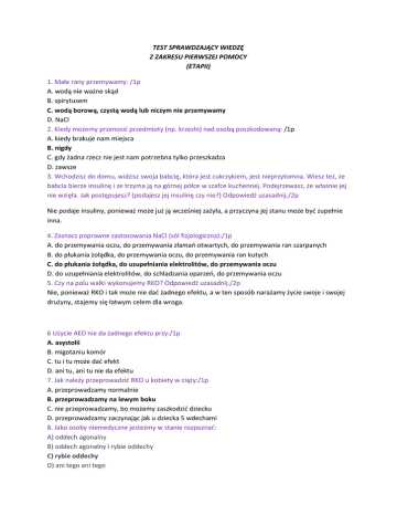 TEST SPRAWDZAJĄCY WIEDZĘ Z ZAKRESU PIERWSZEJ POMOCY (ETAPII) 1. Małe rany przemywamy: /1p A. wodą nie ważne skąd B. spirytusem C. wodą borową, czystą wodą lub niczym nie przemywamy D. NaCl 2. Kiedy możemy przenosić przedmioty (np. krzesło) nad osobą poszkodowaną: /1p A. kiedy brakuje nam miejsca B. nigdy C. gdy żadna rzecz nie jest nam potrzebna tylko przeszkadza D. zawsze 3. Wchodzisz do domu, widzisz swoja babcię, która jest cukrzykiem, jest nieprzytomna. Wiesz też, że babcia bierze insulinę i ze trzyma ją na górnej półce w szafce kuchennej. Podejrzewasz, że właśnie jej nie wzięła. Jak postępujesz? (podajesz jej insulinę czy nie?) Odpowiedź uzasadnij./2p Nie podaje insuliny, ponieważ może już ją wcześniej zażyła, a przyczyna jej stanu może być zupełnie inna. 4. Zaznacz poprawne zastosowania NaCl (sól fizjologiczna):/1p A. do przemywania oczu, do przemywania złamań otwartych, do przemywania ran szarpanych B. do płukania żołądka, do przemywania oczu, do przemywania ran kutych C. do płukania żołądka, do uzupełniania elektrolitów, do przemywania oczu D. do uzupełniania elektrolitów, do schładzania oparzeń, do przemywania oczu 5. Czy na polu walki wykonujemy RKO? Odpowiedź uzasadnij./2p Nie, ponieważ RKO i tak może nie dać żadnego efektu, a w ten sposób narażamy życie swoje i swojej drużyny, stajemy się łatwym celem dla wroga. 6 Użycie AED nie da żadnego efektu przy:/1p A. asystolii B. migotaniu komór C. tu i tu może dać efekt D. ani tu, ani tu nie da efektu 7. Jak należy przeprowadzić RKO u kobiety w ciąży:/1p A. przeprowadzamy normalnie B. przeprowadzamy na lewym boku C. nie przeprowadzamy, bo możemy zaszkodzić dziecku D. przeprowadzamy zaczynając jak u dziecka 5 wdechami 8. Jako osoby niemedyczne jesteśmy w stanie rozpoznać: A) oddech agonalny B) oddech agonalny i rybie oddechy C) rybie oddechy D) ani tego ani tego 10. Do czego służy AED?/1p AED służy do restartowania pracy serca, przywraca dobry rytm. 11. Kto może użyć AED? /1p A. tylko lekarze B. tylko służby mundurowe C. tylko lekarze i ratownicy medyczni D. wszyscy ludzie 12. Do czego służy opatrunek trójzastawkowy ?/1p A. do opatrzenia oparzenia B. do opatrzenia oka C. do opatrzenia nosa D. do opatrzenia przebitego płuca 13. jak wygląda opatrunek trój zastawkowy? /2p Opatrunek trój wentylowy- gaza+ folia zaklejona z trzech stron. 14. Co to jest staza taktyczna?/1p A. zaciska tętnice B. unieruchamia złamania C. służy do podawania leków przeciwbólowych na polu bitwy D. służy do transportu poszkodowanego na polu bitwy 15.Spacerowałeś/aś po lesie, gdy nagle ukąsił cię jadowity wąż. Co robisz?/1p A. wysysam jad, to jedyny sposób B. zakładam opaskę uciskową powyżej ukąszenia C. odcinam sobie nogę, i tak mi ją amputują D. poprawne to a i b 16. U kogo wykonujemy tzw. 5 początkowych wdechów ratunkowych?/1p A. topielec, dziecko, wisielec B. kobieta w ciąży, dziecko, topielec C. kobieta w ciąży, dziecko, wisielec D. dziecko, porażony prądem, kobieta w ciąży 17. Akt prawny zobowiązujący wszystkich obywateli do udzielania pierwszej pomocy to: /1p A. art. 162 Kodeksu Karnego. B. ustawa o Państwowym Ratownictwie Medycznym z 8 września 2006 r. C. rozporządzenie Ministra Pracy i Polityki Socjalnej z 26 września 1997 r. D. rozporządzenie Ministra Edukacji Narodowej i Sportu z dnia 31 grudnia 2002 r. 18. Czy zawsze można użyć AED?(jak nie, to w jakim przypadku?) Odpowiedź uzasadnij./2p AED nie można użyć w przypadku, gdy osoba jest mokra, ponieważ zwiększa to ryzyko, że my zostaniemy porażeni prądem. 19. Jak należy zatamować krwotok z tętnicy szyjnej?/1p A. jak każdy inny krwotok B. włożyć palca C. stazą taktyczną D. opaska uciskową 20. U osoby poszkodowanej może nam być pomocne ( jako osobom niemedycznym) sprawdzenie:/1p A. tętna B. pulsu C. ciśnienia D. wszystkie odpowiedzi są poprawne 21. Co jest najważniejsze podczas udzielania pierwszej pomocy osobie poszkodowanej? Odpowiedź uzasadnij./2p Podczas udzielania pierwszej pomocy najważniejsze jest nasze bezpieczeństwo. Jeżeli nie będziemy zwracać na nie uwagi możemy stać się kolejnym poszkodowanym. ,,Dobry ratownik to żywy ratownik’’ 22. Kiedy należy wezwać pogotowie do nieoddychającego dziecka?/1p A. od razu, nie ma na co czekać B. po minucie RKO C. w ogóle nie należy wzywać D. po pięciu minutach RKO 23.Co to jest system AVPU? A. ustalenie stopnia zagrożenia B. ustalenie liczby rannych i ofiar C. ustalenie liczby rannych D. ustalenie stopnia przytomności 24.Wstępna ocena DOK: A. bezpieczeństwo, oddech, ciśnienie B. drożność dróg oddechowych, ciśnienie, oddech C. drożność dróg oddechowych, oddychanie, krążenie D. krążenie, ciśnienie, oddychanie 25 .Co to jest opatrunek Ashermana? A. opatrunek wentylowy, zastawkowy B. uciskowy C. osłonowy D. staza 26. Do czego służy opatrunek hemostatyczny? A. Przeznaczony do usztywniania reki B. Przeznaczony do tamowania krwotoków zagrażających życiu o średniej i dużej intensywności. C. Przeznaczony do opatrywania złamań D. przeznaczony do schładzania oparzeń 27.Dlaczego na polu walki nie można zażywać aspiryny, ibuprofenu, ani podobnych leków? Leki tego typu rozrzedzają krew, co na polu walki zwiększa ryzyko wykrwawienia. 28. Jakie wyróżnia się trzy stopnie rannych? *żołnierze, którzy na pewno przeżyją *żołnierze, którzy na pewno nie przeżyją *żołnierze, którzy przeżyją jeśli zostaną podjęte natychmiastowe czynności ratunkowe 29. Zanim podejdzie się do rannego, pod jakim kontem należy sprawdzić teren? *czy nie ma broni krótkiej *czy nie ma broni palnej i materiałów wybuchowych *czy nie ma środków chemicznych i biologicznych *czy nie ma zagrożeń elektrycznych *stabilności kostrukcji 30. Jakie są oznaki i objawy odmy opłucnowej? A. Nienormalne wysokie ciśnienie krwi, chłodna, wilgotna skóra, powiększone