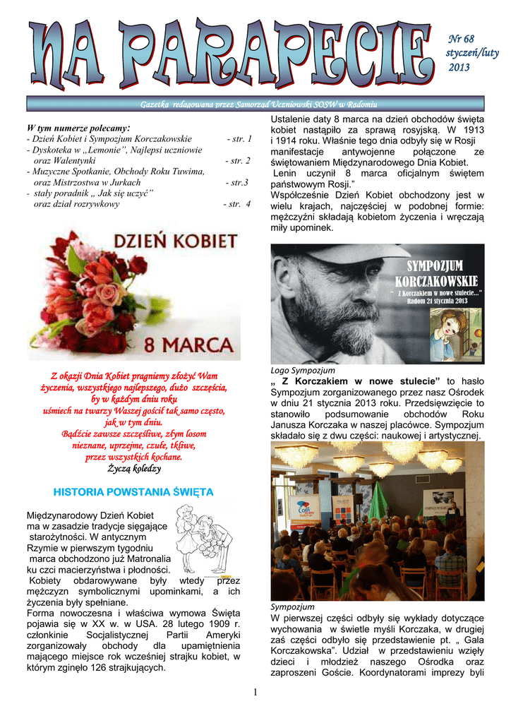 Nr 68 styczeń/luty 2013 Gazetka redagowana przez Samorząd Uczniowski Uczniowski SOSW w Radomiu W tym numerze polecamy: - Dzień Kobiet i Sympozjum Korczakowskie - Dyskoteka w „Lemonie”, Najlepsi uczniowie oraz Walentynki - Muzyczne Spotkanie, Obchody Roku Tuwima, oraz Mistrzostwa w Jurkach - stały poradnik „ Jak się uczyć” oraz dział rozrywkowy Ustalenie daty 8 marca na dzień obchodów święta kobiet nastąpiło za sprawą rosyjską. W 1913 i 1914 roku. Właśnie tego dnia odbyły się w Rosji manifestacje antywojenne połączone ze świętowaniem Międzynarodowego Dnia Kobiet. Lenin uczynił 8 marca oficjalnym świętem państwowym Rosji.” Współcześnie Dzień Kobiet obchodzony jest w wielu krajach, najczęściej w podobnej formie: mężczyźni składają kobietom życzenia i wręczają miły upominek. - str. 1 - str. 2 - str.3 - str. 4 Logo Sympozjum „ Z Korczakiem w nowe stulecie” to hasło Sympozjum zorganizowanego przez nasz Ośrodek w dniu 21 stycznia 2013 roku. Przedsięwzięcie to stanowiło podsumowanie obchodów Roku Janusza Korczaka w naszej placówce. Sympozjum składało się z dwu części: naukowej i artystycznej. Z okazji Dnia Kobiet pragniemy złożyć Wam życzenia, wszystkiego najlepszego, dużo szczęścia, by w każdym dniu roku uśmiech na twarzy Waszej Waszej gościł tak samo często, jak w tym dniu. Bądźcie Bądźcie zawsze szczęśliwe, szczęśliwe, złym losom nieznane, uprzejme, czułe, tkliwe, tkliwe, przez wszystkich kochane. kochane. Życzą koledzy HISTORIA POWSTANIA ŚWI WIĘTA WI TA Międzynarodowy Dzień Kobiet ma w zasadzie tradycje sięgające starożytności. W antycznym Rzymie w pierwszym tygodniu marca obchodzono już Matronalia ku czci macierzyństwa i płodności. Kobiety obdarowywane były wtedy przez mężczyzn symbolicznymi upominkami, a ich życzenia były spełniane. Forma nowoczesna i właściwa wymowa Święta pojawia się w XX w. w USA. 28 lutego 1909 r. członkinie Socjalistycznej Partii Ameryki zorganizowały obchody dla upamiętnienia mającego miejsce rok wcześniej strajku kobiet, w którym zginęło 126 strajkujących. Sympozjum W pierwszej części odbyły się wykłady dotyczące wychowania w świetle myśli Korczaka, w drugiej zaś części odbyło się przedstawienie pt. „ Gala Korczakowska”. Udział w przedstawieniu wzięły dzieci i młodzież naszego Ośrodka oraz zaproszeni Goście. Koordynatorami imprezy byli 1 Anna Pisarska, Barbara Nowak, Beata Nawrot i Grzegorz Cywka, jednak wszyscy nauczyciele i uczniowie czynnie włączyli się w jego organizację. DYSKOTEKA KARNAWAŁOWA KARNAWA OWA W „LEMONIE” Dyskoteka odbyła się 12 lutego 2013 roku . Dzięki staraniom p. Beaty Nawrot uczniowie i wychowankowie naszego Ośrodka mogli wejść za darmo. Całą imprezę prowadził i bawił uczestników DJ. Na balu zostały rozstrzygnięte konkursy: na najładniejsze przebranie i maskę karnawałową. W tych konkursach wygrały m. in. : Występy młodych artystów Przedsięwzięcie to zostało objęte patronatem naukowym Akademii Pedagogiki Specjalnej w Warszawie, zaś patronat honorowy objęli m.in. Marszalek Sejmu Ewa Kopacz, Ks. Biskup Henryk Tomasik, oraz prezydent Radomia Andrzej Kosztowniak. Sympozjum zakończyło w Ośrodku program obchodów Roku Korczakowskiego, który był szczególnie bogaty w treści i obfitujący w wydarzenia kulturalne i naukowe. Marta Ziomka i Edyta Winiarska. Gratulujemy !!! Iwona Piętka WALENTYNKI Grzegorz Adamczyk 14 lutego w naszej szkole odbyło się spotkanie walentynkowe, przygotowane przez p. E. Różańską, p K. Rokoszną i p. M. Zwierzyk. Były wiersze miłosne dedykowane wszystkim zakochanym w NAJLEPSI UCZNIOWIE – CZYLI PODSUMOWANIE I SEMESTRU. Ewelina Gawor Emilia Brusik Pierwszy semestr nauki mamy już za sobą. Niektórzy poradzili sobie bardzo dobrze i uzyskali wysokie noty semestralne. Ze Szkoły Zawodowej najlepsze wyniki uzyskały: Ewelina Gawor z kl. III i/h średnia ocen 5.11 Emilia Brusik z kl. Iii średnia ocen 4.88 Gratulujemy serdecznie!!! W liceum niestety nikomu nie udało się uzyskać takich wyników. Wręczanie walentynek wykonaniu naszych koleżanek i kolegów. Oczywiście nie mogło zabraknąć poczty walentynkowej, więc każda „zakochana i zakochany”, mogli sobie okazać uczucie poprzez własnoręczne wykonanie walentynki. Jeśli komuś zabrakło odwagi lub czasu na przygotowanie tego miłosnego liścika to mamy przykrą wiadomość: musisz poczekać do 14 lutego 2014 roku! Grzegorz Adamczyk 2 Dnia 21 lutego 2013 roku w bibliotece szkolnej odbyło się spotkanie z Tuwimem przygotowane przez p. E. Radomską i p. I. Solecką-Siarę, a w wykonaniu uczniów ZSZ i PSPdP. MUZYCZNE POŻEGNANIE KARNAWAŁU 13 lutego na terenie naszej szkoły odbył się koncert " PERKUSJA RYTM TANIEC" . Czytanie życiorysu Tuwima Spotkanie to zostało przygotowane na okoliczność roku 2013, gdyż rok ten decyzją SEJMU RP poświecono pamięci właśnie Juliana Tuwima. Stąd uczniowie przybliżyli życiorys tego pisarza i jego najbardziej znane utwory, tj. „Zosia Samosia”, „Lokomotywa”, „Wspomnienie”, „Murzynek Bambo”, „O Grzesiu kłamczuchu”. Spotkanie przygotowane zostało w oparciu o historię muzyki klasycznej i rozrywkowej, wzbogaconą o humor i elementy interakcyjne. Na scenie pojawiły się oryginalne instrumentarium: komgi, darbuka, roto-tomy, zestaw perkusyjny akustyczny z elementami elektroniki oraz quica, kastaniety.. Lokomotywa w wykonaniu uczniów naszych szkół SPOTKANIE Z TUWIMEM Ewelina Gawor MISTRZOSTWA W TENISIE STOŁOWYM W dniu 27 lutego 2013 roku odbyły się mistrzostwa w tenisie stołowym w Jurkach. Zawody odbywały się systemem pucharowym, a nagrodami były torby sportowe. Nasi uczniowie, którzy wzięli udział w turnieju pod opieką p. Krzysztofa Motyki zajęli bardzo wysokie miejsca. Wśród chłopców I miejsce zdobył Wojciech Kazimierski kl. III bs, a III miejsce Damian Ćwiek kl. II A ULO J. Tuwim wiersz 