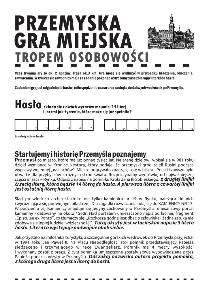 PRZEMYSKA GRA MIEJSKA TROPEM OSOBOWOŒCI Czas trwania gry to ok. 2 godziny. Trasa ok.3 km. Gra mo¿e siê wyd³u¿yæ w przypadku b³¹dzenia, kluczenia, zawracania. W tym czasie zawodnicy maj¹ za zadanie pokonaæ wytyczon¹ trasê zbieraj¹c literki do has³a. Zadaniem gry jest odgadniêcie has³a i mi³e spêdzenie czasu oraz zachêta do dalszych wêdrówek po Przemyœlu. Has³o 1 sk³ada siê z dwóch wyrazów w sumie (15 liter) i brzmi jak ¿yczenie, które mo¿e siê ju¿ spe³ni³o? 2 3 4 5 6 7 8 9 10 11 12 13 14 15 tu nale¿y wpisaæ has³o Startujemy i historiê Przemyœla poznajemy Przemyœl to miasto, które ma ju¿ ponad tysi¹c lat. Na arenê dziejów wpisa³ siê w 981 roku dziêki wzmiance w Kronice Nestora, który podaje, ¿e przemyski gród zajêli Rusini podczas wyprawy wojennej „na Lachów”. Miasto odgrywa³o znacz¹c¹ rolê w historii Polski i zawsze by³o otwarte dla przybyszów z ró¿nych stron œwiata. Rozpoczynamy wêdrówkê od najwa¿niejszej czêœci miasta – Rynku. Odpisz z napisu na pomniku Króla Jana III Sobieskiego. z drugiej linijki trzeci¹ literê, która bêdzie 14 liter¹ do has³a. A pierwsza litera z czwartej linijki jest ostatni¹ liter¹ has³a. Œlad po w³oskich architektach to nie tylko kamienica nr 19 w Rynku, nale¿¹ca do nich i wyró¿niaj¹ca siê podwójnym pilastrem. Dla zagadki rozwi¹zania udaj siê do KAMIENICY NR 17. W podcieniu tej Kamienicy znajduje siê jedyny zachowany w Przemyœlu renesansowy portal kamienny - datowany na oko³o 1560r. Nad portalem umieszczono napis po ³acinie, fragment „Epistulae ex Ponto”, co t³umaczy siê: „Rozkosz¹ godn¹ jest dbaæ o cz³owieka i ¿adn¹ sztuk¹ nie zdobywa siê lepiej ludzkiej wdziêcznoœci”. Tutaj ukryta jest w ³aciñskim napisie 3 litera has³a. Litera ta wystêpuje podwójnie obok siebie. Jak przysta³o na mi³oœnika turystyki, a szczególnie górskich wêdrówek do Przemyœla przyjecha³ w 1991 roku Jan Pawe³ II. Na Placu Niepodleg³oœci stoi pomnik przedstawiaj¹cy Papie¿a siedz¹cego i trzymaj¹cego w rêce Ewangeliarz. Pomnik ma 4 metry wysokoœci i wykonany zosta³ z br¹zu. Z ty³u pomnika umieszczone zosta³y s³owa wypowiedziane przez Papie¿a podczas wizyty w Przemyœlu. Odszukaj nazwisko autora projektu pomnika, z którego druga litera jest 5 liter¹ do has³a. PRZEMYSKA GRA MIEJSKA Do Przemyœla zza po³udniowej granicy przyby³ Wincenty Swoboda-wytwórca fajek. Z jego warsztatu wywodz¹ siê najznakomitsi fajkarze przemyscy. Przemyœl jest jedynym oœrodkiem wytwórstwa fajek profesjonalnych w Polsce. To, ¿e jest w Przemyœlu znana ludwisarnia, z której dzwony dzwoni¹ na ca³ym œwiecie, to zas³uga rodziny Felczyñskich, która od 1808 roku, a w Przemyœlu od 1912, prowadzi ludwisarniê. Dlatego zosta³o utworzone Muzeum Dzwonów i Fajek. Po lewej stronie drzwi wejœciowych do Muzeum jest wmurowana tablica. Litera 9 do has³a jest szesnast¹ liter¹ z dziewi¹tej linijki, a pi¹ta litera z siódmej linijki bêdzie 8 liter¹ do has³a. Od stuleci miasto Przemyœl mia³o wielokulturowy charakter. Pami¹tk¹ minionych czasów jest Nowa Synagoga przy ulicy S³owackiego. Zbudowana w roku 1910. Pami¹tkowa tablica wmurowana w 2006 roku zawiera dwie litery do has³a : ostatnia litera w pierwszej linijce jest 6 liter¹ do has³a, a ósma litera z szóstej linijki jest 10 liter¹. W murze otaczaj¹cym koœció³ oo. Reformatów pw. œw. Antoniego znajduje siê piaskowcowy pomnik o. Krystyna Szykowskiego. W 1672 r. podczas napadu Tatarów, zebra³ grono mieszkañców Przemyœla i utworzywszy z nich oddzia³ zbrojny napad³ na tatarski obóz pod Kormanicami i rozgromi³ najeŸdŸców. W dwusetn¹ rocznicê tych wydarzeñ mieszkañcy Przemyœla uhonorowali bohaterskiego zakonnika stawiaj¹c mu pomnik i nazywaj¹c „obroñc¹ i wybawc¹ grodu”. W dziewi¹tej linijce druga litera jest 2 i 4 liter¹ has³a. Marcin Krasicki, wojewoda podolski, a od 1616 r. starosta przemyski to jeden z najznamienitszych przedstawicieli szlachty przemyskiej. Wybudowa³ barokowy koœció³ œw. Teresy od Jezusa i klasztor Ojców Karmelitów Bosych - kolejny cel naszej wêdrówki. Zgodnie z jego wol¹ zosta³ pochowany w habicie karmelitañskim w krypcie koœcio³a Karmelitów. ZnajdŸ wykaz zmar³ych Karmelitów Bosych spoczywaj¹cych w podziemiach tutejszego koœcio³a. Pierwsza litera imienia ojca z pozycji czterdzieœci cztery jest 7 liter¹ do has³a, a 1 litera has³a to pi¹ta litera imienia ojca z pozycji szesnastej. Wœród przemyskich osobistoœci jest tak¿e Zbigniew Brzeziñski, który by³ doradc¹ prezydenta Cartera ds. bezpieczeñstwa narodowego USA. Dom, w którym mieszka³ w Przemyœlu znajduje siê na ul. Sienkiewicza 5 – dla zaznaczenia tego faktu zosta³a wmurowana tablica pami¹tkowa, i tutaj W okresie poprzedzaj¹cym I wojnê œwiatow¹ w Przemyœlu mieszkañcy stanowili mozaikê narodowoœciow¹: m.in. Polacy, Austriacy, Rusini, Wêgrzy, Czesi, Rumuni. Zas³u¿yli siê w obronie Przemyœla przed rosyjsk¹ armi¹, a w szczególnoœci dowódca Twierdzy Przemyœl Herman Kusmanek. Tamte czasy pamiêta Brama Sanocka Dolna , która mia³a za zadanie chroniæ dostêpu do twierdzy. Tutaj gra siê finalizuje i brakuj¹c¹ literê do has³a zawiera tablica informacyjna, ¿e jest to obiekt zabytkowy – odpisz czwart¹ literê z szóstej linijki. Organizator: Ko³o Przewodników Turystycznych PTTK Oddzia³ im. dr Mieczys³awa Or³owicza w Przemyœlu. [email protected] kontakt: tel. 606 990 360 tel. 16 678 53 74 opracowanie graficzne PST / UM Przemyœl w drugiej linijce jako dwunasta jest 12 litera do has³a. Natomiast z drugiej linijki druga litera bêdzie 13 liter¹ w haœle.