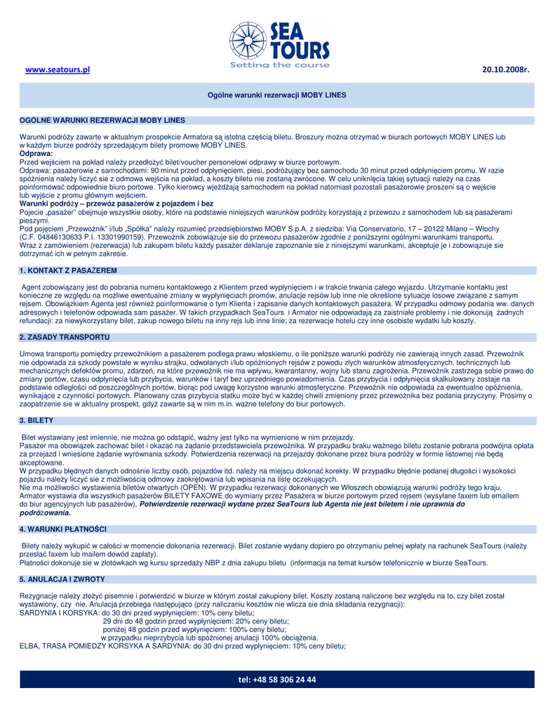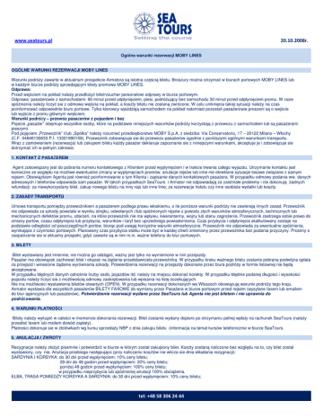 www.seatours.pl 20.10.2008r. Ogólne warunki rezerwacji MOBY LINES OGÓLNE WARUNKI REZERWACJI MOBY LINES Warunki podróży zawarte w aktualnym prospekcie Armatora są istotna częścią biletu. Broszury można otrzymać w biurach portowych MOBY LINES lub w każdym biurze podróży sprzedającym bilety promowe MOBY LINES. Odprawa: Przed wejściem na pokład należy przedłożyć bilet/voucher personelowi odprawy w biurze portowym. Odprawa: pasażerowie z samochodami: 90 minut przed odpłynięciem, piesi, podróżujący bez samochodu 30 minut przed odpłynięciem promu. W razie spóźnienia należy liczyć sie z odmowa wejścia na pokład, a koszty biletu nie zostaną zwrócone. W celu uniknięcia takiej sytuacji należy na czas poinformować odpowiednie biuro portowe. Tylko kierowcy wjeżdżają samochodem na pokład natomiast pozostali pasażerowie proszeni są o wejście lub wyjście z promu głównym wejściem. Warunki podróży – przewóz pasażerów z pojazdem i bez Pojecie „pasażer” obejmuje wszystkie osoby, które na podstawie niniejszych warunków podróży korzystają z przewozu z samochodem lub są pasażerami pieszymi. Pod pojęciem „Przewoźnik” i/lub „Spółka” należy rozumieć przedsiębiorstwo MOBY S.p.A. z siedziba: Via Conservatorio, 17 – 20122 Milano – Włochy (C.F. 04846130633 P.I. 13301990159). Przewoźnik zobowiązuje sie do przewozu pasażerów zgodnie z poniższymi ogólnymi warunkami transportu. Wraz z zamówieniem (rezerwacja) lub zakupem biletu każdy pasażer deklaruje zapoznanie sie z niniejszymi warunkami, akceptuje je i zobowiązuje sie dotrzymać ich w pełnym zakresie. 1. KONTAKT Z PASAŻEREM Agent zobowiązany jest do pobrania numeru kontaktowego z Klientem przed wypłynięciem i w trakcie trwania całego wyjazdu. Utrzymanie kontaktu jest konieczne ze względu na możliwe ewentualne zmiany w wypłynięciach promów, anulacje rejsów lub inne nie określone sytuacje losowe związane z samym rejsem. Obowiązkiem Agenta jest również poinformowanie o tym Klienta i zapisanie danych kontaktowych pasażera. W przypadku odmowy podania ww. danych adresowych i telefonów odpowiada sam pasażer. W takich przypadkach SeaTours i Armator nie odpowiadają za zaistniałe problemy i nie dokonują żadnych refundacji: za niewykorzystany bilet, zakup nowego biletu na inny rejs lub inne linie; za rezerwacje hotelu czy inne osobiste wydatki lub koszty. 2. ZASADY TRANSPORTU Umowa transportu pomiędzy przewoźnikiem a pasażerem podlega prawu włoskiemu, o ile poniższe warunki podróży nie zawierają innych zasad. Przewoźnik nie odpowiada za szkody powstałe w wyniku strajku, odwołanych i/lub opóźnionych rejsów z powodu złych warunków atmosferycznych, technicznych lub mechanicznych defektów promu, zdarzeń, na które przewoźnik nie ma wpływu, kwarantanny, wojny lub stanu zagrożenia. Przewoźnik zastrzega sobie prawo do zmiany portów, czasu odpłynięcia lub przybycia, warunków i taryf bez uprzedniego powiadomienia. Czas przybycia i odpłynięcia skalkulowany zostaje na podstawie odległości od poszczególnych portów, biorąc pod uwagę korzystne warunki atmosferyczne. Przewoźnik nie odpowiada za ewentualne opóźnienia, wynikające z czynności portowych. Planowany czas przybycia statku może być w każdej chwili zmieniony przez przewoźnika bez podania przyczyny. Prosimy o zaopatrzenie sie w aktualny prospekt, gdyż zawarte są w nim m.in. ważne telefony do biur portowych. 3. BILETY Bilet wystawiany jest imiennie, nie można go odstąpić, ważny jest tylko na wymienione w nim przejazdy. Pasażer ma obowiązek zachować bilet i okazać na żądanie przedstawiciela przewoźnika. W przypadku braku ważnego biletu zostanie pobrana podwójna opłata za przejazd i wniesione żądanie wyrównania szkody. Potwierdzenia rezerwacji na przejazdy dokonane przez biura podróży w formie listownej nie będą akceptowane. W przypadku błędnych danych odnośnie liczby osób, pojazdów itd. należy na miejscu dokonać korekty. W przypadku błędnie podanej długości i wysokości pojazdu należy liczyć sie z możliwością odmowy zaokrętowania lub wpisania na listę oczekujących. Nie ma możliwości wystawienia biletów otwartych (OPEN). W przypadku rezerwacji dokonanych we Włoszech obowiązują warunki podróży tego kraju. Armator wystawia dla wszystkich pasażerów BILETY FAXOWE do wymiany przez Pasażera w biurze portowym przed rejsem (wysyłane faxem lub emailem do biur agencyjnych lub pasażerów), Potwierdzenie rezerwacji wydane przez SeaTours lub Agenta nie jest biletem i nie uprawnia do podróżowania. 4. WARUNKI PŁATNOŚCI Bilety należy wykupić w całości w momencie dokonania rezerwacji. Bilet zostanie wydany dopiero po otrzymaniu pełnej wpłaty na rachunek SeaTours (należy przesłać faxem lub mailem dowód zapłaty). Płatności dokonuje sie w złotówkach wg kursu sprzedaży NBP z dnia zakupu biletu (informacja na temat kursów telefonicznie w biurze SeaTours. 5. ANULACJA I ZWROTY Rezygnacje należy złożyć pisemnie i potwierdzić w biurze w którym został zakupiony bilet. Koszty zostaną naliczone bez względu na to, czy bilet został wystawiony, czy nie. Anulacja przebiega następująco (przy naliczaniu kosztów nie wlicza sie dnia składania rezygnacji): SARDYNIA I KORSYKA: do 30 dni przed wypłynięciem: 10% ceny biletu; 29 dni do 48 godzin przed wypłynięciem: 20% ceny biletu; poniżej 48 godzin przed wypłynięciem: 100% ceny biletu; w przypadku nieprzybycia lub spóźnionej anulacji 100% obciążenia. ELBA, TRASA POMIEDZY KORSYKA A SARDYNIA: do 30 dni przed wypłynięciem: 10% ceny biletu; tel: +48 58 306 24 44 www.seatours.pl 20.10.2008r. 29 dni do 10 dni przed wypłynięciem: 20% ceny biletu; poniżej 10 dni przed rejsem: 100% ceny biletu; w przypadku spóźnionej anulacji zwrotu nie będzie. Bez dokonania anulacji wygasa roszczenie w stosunku do taryf specjalnych TARYFA PEX i taryfy na samochód „BEST CAR” zob.