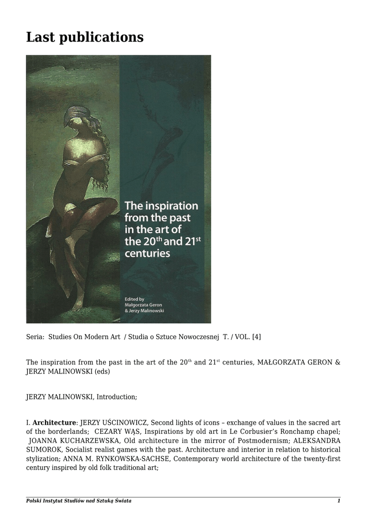 Last publications Seria: Studies On Modern Art / Studia o Sztuce Nowoczesnej T. / VOL. [4] The inspiration from the past in the art of the 20th and 21st centuries, MAŁGORZATA GERON & JERZY MALINOWSKI (eds) JERZY MALINOWSKI, Introduction; I. Architecture: JERZY UŚCINOWICZ, Second lights of icons – exchange of values in the sacred art of the borderlands; CEZARY WĄS, Inspirations by old art in Le Corbusier’s Ronchamp chapel; JOANNA KUCHARZEWSKA, Old architecture in the mirror of Postmodernism; ALEKSANDRA SUMOROK, Socialist realist games with the past. Architecture and interior in relation to historical stylization; ANNA M. RYNKOWSKA-SACHSE, Contemporary world architecture of the twenty-first century inspired by old folk traditional art; Polski Instytut Studiów nad Sztuką Świata 1 II. Painting, sculpture and graphics of Europe and North America: ŁUKASZ KIEPUSZEWSKI, Composite heads. Artur Nacht-Samborski and Arcimboldo; KAMILA KŁUDKIEWICZ, The turn to the tradition in the beginning of the 20th century – the case of bas-reliefs of Emile-Antoine Bourdelle; AGNIESZKA KLUCZEWSKA-WÓJCIK, Giorgio De Chirico (1888–1978) – Pictor classicus; MACIEJ GUGAŁA, Remembering Arezzo. “Early Renaissance” frescoes by Balthus in the Villa Medici in Rome; ZOFIA KRASNOPOLSKA-WESNER, Antiquity in the works of Leon Bakst; MAŁGORZATA GERON, Formists. Between tradition and avant-garde; MAŁGORZATA KSENIA KRZYŻANOWSKA, The classicizing tendencies in the creativity of selected students of Vilna (Vilnius) School and Warsaw School; KATARZYNA KULPIŃSKA, Inspiration from old art in the lithographs of Konrad Srzednicki from the 1920s and 1930s; DOROTA KUDELSKA, The Blessed Virgin Chastises the Infant Jesus Before Three Witnesses: Andre Breton, Paul Éluard and the Artist by Max Ernst. Comments and additions to interpretation; AGATA ROME-DZIDA, Otto Dix between old masters and popular art. The Karkonosze episode during the artist’s “inner emigration”; JOLANTA DĄBKOWSKA-ZYDROŃ, Surrealist fascination with Primitive Art; ANNA MANICKA, Les Caprices Goya&Dali. A Parody or a Dialogue?; ANNA KRIEGSEISEN, Interior decoration of the rail station in Gdynia – Gdynia Główna Osobowa; ŁUKASZ MIKOŁAJ SADOWSKI, Werner Tübke (1929–2004). The modern fascinations on German Renaissance; MARTA IPCZYŃSKA-BUDZIAK, Dialogues of the Slovak school of graphics with Old Masters’ paintings and graphics; MALINA BARCIKOWSKA, On Polish painting images of Infanta Margaret; FILIP PRĘGOWSKI, David Hockney. Tracing the Old Masters; TOMASZ GRYGLEWICZ, Tradition in video art on the example of Bill Viola’s works; ANNA ŻAKIEWICZ, Old Masters in New Media Art. Still Life with Banquet by Grahame Weinbren and some other of his works; JACEK ZWIERZYŃSKI, Cutout from history: silhouette technique and Kara Walker’s art; ODETA ŽUKAUSKIENĖ, Dialogues with the art of the past in the imaginary museum of Modernity and Postmodernity ; III. Art of Asia, Africa And South America: KATARZYNA KLEIBER, References to Persian antiquity in the official architecture of Pahlavi state; MARIANNA LIS, Wayang Beber Kota – new nature of forgotten form of Indonesian theatre; KAROLINA PAWLIK, Ancient empires, contributions and Shanghai modern designs; SU-HSING LIN, Zhang Guangyu and Cartoon Journey to the West; MARTA SKWIROWSKA, The ancient Maya worldview in the contemporary textiles of Guatemala; ANETA PAWŁOWSKA, The European Masterpieces as Inspiration of the Modern South African Art. IV. National identity in art: RENATA PIĄTKOWSKA, A Jewish Renaissance? The Warsaw circle of Yitskhok Leybush Peretz and their attempts at developing a Jewish national style; IZABELLA POWALSKA, Artur Szyk’s illuminations and caricatures – tradition and topicality; GEORGI GRUEW, References to the medieval art and history in the propaganda posters of World War I; ELEONORA JEDLIŃSKA, Transformation and transfiguration: the role of the chandelier in the work of art by Jan van Eyck’s The Arnolfini Portrait (1434), and in the installations of Joshua Neustein Ash Cities (1990–1999); SWIETLANA M. CZERWONNAJA, Inspiration from the Folk Art in Lithuanian Art in Exile after the World War II; MAREK MAKSYMCZAK, In front of the painting and inside the painting. Coffin portraits of Leszek Sobocki; JOANNA BIELSKA-KRAWCZYK, Image from the past in the present day paintings against the background of the contemporary culture. (Anthropological and cultural aspects of the inspirations with the old art in the Polish art of the second part of the 20th and the beginning of 21st century); MAREK KREJČI, Reassessing history: The rediscovering of the Slavic myths? The inspiration from the past in the art of the 20th and 21st centuries broadens the scope of analyses of contemporary art. The changes of the philosophy of life resulting from the paradigm of the avant-garde, as well as the forms related to deformation and expression Polski Instytut Studiów nad Sztuką Świata 2 stemming from the category of ugliness, allowed to study therein different relationships with the old art, especially the non-classical as well as non-European one. The issue of inspiration became the essence of the volume: of inspiration by styles and genres, by artists' ideological attitudes, by artistic technologies. The end of the 18th century was accepted as the caesura of old art, dominated by neo-styles, where the concept of creative work was related to the adaptation of the principles of, among others, classical Greek and Roman, Gothic or Renaissance art to new social and cultural conditions as well as technologies. In the early 20th century, academism became ultimately rejected, however, the relations with the old art remained. The authors attempted to identify these relationships. The volume is divided into four parts. The first three sections are dedicated to art of the world : architecture, painting, sculpture and graphics of Europe and North America, the art of Asia, Africa and South Ameri