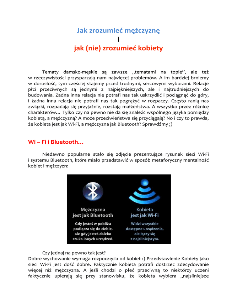Jak zrozumieć mężczyznę i jak (nie) zrozumieć kobiety Tematy damsko-męskie są zawsze „tematami na topie”, ale też w rzeczywistości przysparzają nam najwięcej problemów. A im bardziej brniemy w dorosłość, tym częściej stajemy przed trudnymi, sercowymi wyborami. Relacje płci przeciwnych są jednymi z najpiękniejszych, ale i najtrudniejszych do budowania. Żadna inna relacja nie potrafi nas tak uskrzydlić i pociągnąć do góry, i żadna inna relacja nie potrafi nas tak pogrążyć w rozpaczy. Często ranią nas związki, rozpadają się przyjaźnie, rozstają małżeństwa. A wszystko przez różnicę charakterów… Tylko czy na pewno nie da się znaleźć wspólnego języka pomiędzy kobietą, a mężczyzną? A może przeciwieństwa się przyciągają? No i czy to prawda, że kobieta jest jak Wi-Fi, a mężczyzna jak Bluetooth? Sprawdźmy ;) Wi – Fi i Bluetooth… Niedawno popularne stało się zdjęcie prezentujące rysunek sieci Wi-Fi i systemu Bluetooth, które miało przedstawić w sposób metaforyczny mentalność kobiet i mężczyzn: Czy jednaj na pewno tak jest? Dobre wychowanie wymaga rozpoczęcia od kobiet :) Przedstawienie Kobiety jako sieci Wi-Fi jest dość dobre. Faktycznie kobieta potrafi dostrzec zdecydowanie więcej niż mężczyzna. A jeśli chodzi o płeć przeciwną to niektórzy uczeni faktycznie upierają się przy stanowisku, że kobieta wybiera „najsilniejsze urządzenie”. Argumenty popierające ten pogląd swoimi korzeniami sięgają socjobiologii, czyli nauki, która wyprowadza wnioski na podstawie zależności zachodzących w świecie zwierząt, do którego przecież należy także rodzaj ludzki. Według socjobiologów zadaniem osobników płci żeńskiej jest zadbanie o przedłużenie gatunku. Czyli jednym słowem o spłodzenie i wychowanie potomstwa. To uzasadniałoby stanowisko, że kobieta wyszukuje dla siebie najsilniejszego partnera, który byłby w stanie zaopiekować się nią, oraz dać jej silne i zdrowe potomstwo. Tylko czy takie techniczne podejście na pewno podoba się kobietom? Chyba nie do końca… A może raczej na pewno nie! Kobieta obdarzona została przez Boga wyjątkowym powołaniem, do opieki nad nowym życiem, o które tylko ona jest w stanie zadbać. Instynkt macierzyński, czyli zdolność szeroko pojętego przewidywania, dany jest tylko jej. W pewnym sensie kobieta wyszukuje wokół siebie mężczyzn, którzy są „najsilniejsi”. Nie chodzi tutaj jednak o siłę fizyczną, ale o mężczyznę, który wyróżniałby się spośród innych subtelnością w okazywaniu uczuć, dobrym humorem, odpowiedzialnym podejściem do życia i poważnym myśleniem o przyszłości. Kobiety, jako przyszłe matki, nie są skłonne do krótkodystansowego myślenia, zawsze łączą przyczynę ze skutkiem, postrzegają rzeczywistość w perspektywie przyszłości – oczywiście jeśli chodzi o decyzje życiowe ;) Urządzenie Wi-Fi służy do długotrwałego połączenia i tu analogia z przykładem kobiety jest idealna, bo kobieta także w związku potrzebuje trwałego „wysyłania sygnałów” mówiących o wzajemnych relacjach. Kobieta potrzebuje wymiany informacji, czułości, rozmów z mężczyzną. Nie wystarczy jej świadomość bycia razem, nieustannie potrzebuje choćby najmniejszych gestów podtrzymujących „połączenie”: smsa z buźką na dzień dobry i wiadomości: „dobranoc” przed snem. Co do mężczyzn to porównanie ich do Bluetooth także niesie ze sobą ziarnko prawdy, ale tylko ziarnko. Bo urządzenie Bluetooth nastawione jest na wyszukiwanie i krótkotrwałe łączenie z innymi urządzeniami. Natomiast wbrew powszechnie przyjętej opinii, mężczyzna wyszukuje partnerki na całe życie. Nie jest nastawiony na częste zmiany, wręcz przeciwnie, pragnie stałości i odwzajemnionego uczucia, relacji o którą nie musiałby cały czas zabiegać, a w samych relacjach z płcią przeciwną – o ile budowane są na poważnie – jest bardzo ostrożny. Natomiast to co zgadza się z porównaniem mężczyzny do Bluetooth to fakt, że nie potrzebuje potwierdzania swojej relacji z kobietą. W jego świadomości pojawia się zapis, który przypomina mu o dokonanym wyborze. Nie potrzebuje ciągłych małych gestów, częstych rozmów, czy długiego spędzania czasu razem. Mężczyźnie wystarcza świadomość tego, że ma tę drugą połówkę. A ponieważ nie zwraca uwagi na małe geściki, często nie dostrzega trudności w relacjach, które widzi kobieta, stąd też trudniej przychodzą mu rozstania… Przewody i przegródki Zastanawialiście sie kiedyś jak porównać kobietę i mężczyznę pod względem budowy wnętrza ich mózgów? Właśnie zrobimy to teraz. Kobieta to stworzenie bardzo skomplikowane, które można porównać do masy połączonych ze sobą przewodów. Zapewniam Was jednak, że w takim układzie elektrycznym nawet najlepszy elektryk by się nie połapał. Bo to właśnie u kobiet sfera uczuć i wydarzeń jest tak mocno połączona siatką emocji, że łatwo jest zaginąć w tym splocie. A jak to wygląda w praktyce? Otóż każde wydarzenie, które przeżywa kobieta jest połączone z określoną emocją. A jak wiemy, emocje pełnią rolę „utwardzaczy”, dzięki którym wydarzenia trwalej zapisują się w naszym umyśle. Nie ma się co dziwić, że kobiety zdecydowanie bardziej pamiętają wydarzenia z życia aniżeli mężczyźni. A ponieważ emocje w życiu kobiet odgrywają znaczącą rolę, dzięki nim bowiem są wrażliwsze, co pomaga w wychowywaniu potomstwa, to z drugiej strony kobiety mają skłonność do przesadzania i wyolbrzymiania niepowodzeń w swoim życiu. I często z igły robią przysłowiowe widły :) Zmienność nastrojów jest tak duża, że żaden mężczyzna nigdy tego nie zdoła pojąć. Tego nie da się zrozumieć z perspektywy mężczyzny, ale w mózgu kobiety zachodzi jednocześnie więcej procesów niż w najnowszym komputerze NASA… Praca, dom, dzieci, k