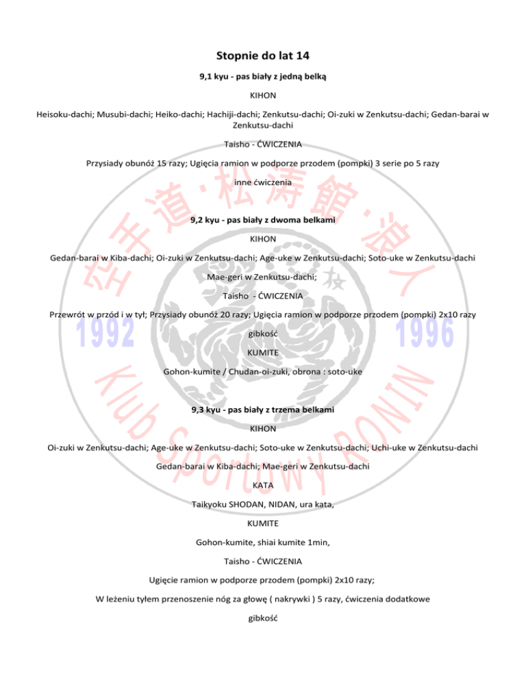 Stopnie do lat 14 9,1 kyu - pas biały z jedną belką KIHON Heisoku-dachi; Musubi-dachi; Heiko-dachi; Hachiji-dachi; Zenkutsu-dachi; Oi-zuki w Zenkutsu-dachi; Gedan-barai w Zenkutsu-dachi Taisho - ĆWICZENIA Przysiady obunóż 15 razy; Ugięcia ramion w podporze przodem (pompki) 3 serie po 5 razy inne ćwiczenia 9,2 kyu - pas biały z dwoma belkami KIHON Gedan-barai w Kiba-dachi; Oi-zuki w Zenkutsu-dachi; Age-uke w Zenkutsu-dachi; Soto-uke w Zenkutsu-dachi Mae-geri w Zenkutsu-dachi; Taisho - ĆWICZENIA Przewrót w przód i w tył; Przysiady obunóż 20 razy; Ugięcia ramion w podporze przodem (pompki) 2x10 razy gibkość KUMITE Gohon-kumite / Chudan-oi-zuki, obrona : soto-uke 9,3 kyu - pas biały z trzema belkami KIHON Oi-zuki w Zenkutsu-dachi; Age-uke w Zenkutsu-dachi; Soto-uke w Zenkutsu-dachi; Uchi-uke w Zenkutsu-dachi Gedan-barai w Kiba-dachi; Mae-geri w Zenkutsu-dachi KATA Taikyoku SHODAN, NIDAN, ura kata, KUMITE Gohon-kumite, shiai kumite 1min, Taisho - ĆWICZENIA Ugięcie ramion w podporze przodem (pompki) 2x10 razy; W leżeniu tyłem przenoszenie nóg za głowę ( nakrywki ) 5 razy, ćwiczenia dodatkowe gibkość 8,1 kyu - pas żółty z jedną belką KIHON Oi-zuki; Age-uke/Gyaku-zuki; Soto-uke/Gyaku-zuki; Gedan-barai/Gyaku-zuki; Mae-geri KATA Taikyoku-SHODAN, NIDAN,ura kata KUMITE Gohon-kumite, shiai kumite 1min Taisho - ĆWICZENIA Mostek 2 razy W leżeniu tyłem jednoczesne unoszenie tułowia i nóg (scyzoryki) 6 razy, pompki 7x seiken, 15x na dłoniach, 3x tekubi, W siadzie prostym skłony głową do kolan 2 razy 8,2 kyu - pas żółty z dwoma belkami KIHON Oi-zuki; Age-uke/Gyaku-zuki; Soto-uke/Gyaku-zuki; Uchi-uke/Gyaku-zuki; Gedan-barai w Kiba-dachi Mae-geri; Yoko-geri-keage KATA Taikyoku-SHODAN, NIDAN, SANDAN, ura kata KUMITE Gohon-kumite, shiai kumite (1min) ĆWICZENIA Przewrót do tyłu 2 razy; Mae-geri z przysiadu 10 razy, ćwiczenia dodatkowe pompki 7x seiken, 15x na dłoniach, 3x tekubi, 8,3 kyu - pas żółty z trzema belkami KIHON Oi-zuki; Age-uke/Gyaku-zuki; Soto-uke/Gyaku-zuki; Uchi-uke/Gyaku-zuki; Gedan-barai/Gyaku-zuki Shuto-uke; Mae-geri; Yoko-geri-keage; Yoko-geri-kekomi KATA Taikyoku SHODAN, Heian-SHODAN KUMITE Gohon-kumite, shiai kumite 1min, ĆWICZENIA pompki 7x seiken, 15x na dłoniach, 5x tekubi; Nakrywki 10 razy Skoki w przysiadzie (żabki-jumping)15m. Ćwiczenia dodatkowe 7,1 kyu - pas pomarańczowy z jedną belką KIHON + teoria Oi-zuki; Age-uke/Gyaku-zuki; Soto-uke/Gyaku-zuki; Gedan-barai/Gyaku-zuki; Uchi-uke w Kokutsu-dachi; Mae-geri-jodan; Yoko-geri-keage; Yoko-geri-kekomi KATA Taikyoku-SANDAN, Heian-SHODAN KUMITE Gohon-kumite, shiai kumite 1min, Taisho - ĆWICZENIA pompki 10x seiken, 15x na dłoniach, 5x tekubi, Nakrywki 10 razy Wymachy nogą w przód i w bok na wysokość jodan Ćwiczenia dodatkowe 7,2 kyu - pas pomarańczowy z dwoma belkami KIHON + teoria Oi-zuki; Age-uke/Gyaku-zuki; Soto-uke/Gyaku-zuki; Gedan-barai/Gyaku-zuki Uchi-uke w Kokutsu-dachi; Mae-geri-jodan; Yoko-geri-keage; Yoko-geri-kekomi KATA Taikyoku-SANDAN, Heian-SHODAN, ura kata KUMITE Gohon-kumite, Kihon Ippon kumite (1 atak), shiai kumite 1min, ĆWICZENIA pompki 10x seiken, 20x na dłoniach, 5x tekubi, Skoki w przysiadzie ( żabki )20m Ćwiczenia dodatkowe 7,3 kyu - pas pomarańczowy z trzema belkami KIHON + teoria Oi-zuki; Age-uke/Gyaku-zuki; Soto-uke/Gyaku-zuki; Uchi-uke/Kizami-zuki/Gyaku-zuki Shuto-uke/Gyaku-nukite; Mae-geri; Mae-ren-geri chudan jodan ( z międzykrokiem ) Yoko-geri-keage; Yoko-geri-kekomi; Mawashi-geri KATA Taikyoku Shodan, Taikyoku Sandan, Heian NIDAN, ura kata KUMITE Gohon-kumite, Kihon Ippon Kumite (2 ataki), Shiai kumite 1min, Taisho - ĆWICZENIA Przewrót do przodu z biegu W siadzie rozkrocznym skłon głową do podłogi pompki 10x seiken, 15x na dłoniach, 5x tekubi, 5x na palcach Ćwiczenia dodatkowe 6,1 kyu - pas zielony z jedną belką KIHON + teoria Ren-zuki; Age-uke/Gyaku-zuki; Uchi-uke/Gyaku-zuki; Soto-uke/Gyaku-tate-nukite; Uraken-uchi w Kiba-dachi; Shuto-uchi w Kiba-dachi; Mae-geri; Yoko-geri-keage; Yoko-geri-kekomi; Mawashi-geri; Mawashi-geri/yoko-geri (tą samą nogą); Ura-mawashi-geri, KATA Taikyoku-SHODAN, Heian SHODAN, Heian-NIDAN, plus ura kata KUMITE Kihon-ippon-kumite (2 ataki ręczne, 2 ataki nożne), jiyu kumite ĆWICZENIA Przewrót do przodu z przeskokiem przez klęczącego partnera (tygrysek) pompki 12x seiken, 20x na dłoniach, 5x tekubi, 5x na palcach, Wymachy nogą w przód, w bok i w tył na wysokość jodan Ćwiczenia dodatkowe 6,2 kyu - pas zielony z dwoma belkami KIHON + teoria Sanbon-zuki; Age-uke/Gyaku-zuki; Uchi-uke w kokutsu-dachi/Gyaku-zuki w Zenkutsu-dachi; Shuto-uke/Kizami-mae-geri/Gyaku-nukite; Shuto-uchi w Kiba-dachi; Yoko-empi-uchi w Kiba-dachi Mae-ren-geri (chudan/jodan); Yoko-geri-keage-jodan; Mawashi-geri; Ura-mawashi-geri; Mawashi-geri/Yoko-geri (tą samą nogą); Mawashi-geri/Ura-mawashi-geri (tą samą nogą); Ushiro-geri; KATA Taikyoku-SANDAN, Heian SHODAN, Heian-NIDAN, ura kata, KUMITE Kihon-ippon-kumite (3 ataki ręczne, 3 ataki nożne), shiai kumite 2x1min, jiyu kumite Taisho - ĆWICZENIA Mostek 2 razy Przewrót do przodu i do tyłu x 6 Mae-geri z przysiadu 30 razy pompki 15x seiken, 20x na dłoniach, 5x tekubi, 5x na palcach, Ćwiczenia dodatkowe 6,3 kyu - pas zielony z trzema belkami KIHON + teoria Sanbon-zuki; Age-uke/Gyaku-zuki; Uchi-uke/Kizami-zuki/Gyaku-zuki; Soto-uke/Kizami-uraken-uchi/Gyaku-zuki Shuto-uke/Kizami-mae-geri/Gyaku-nukite; Shuto-uchi; Mae-geri; Mae-ren-geri (z międzykrokiem) Yoko-geri-keage; Yoko-geri-kekomi; Mawashi-geri; Ura-mawashi-geri; Shiho-gyaku-zuki; Mawashi-geri/Yoko-geri (tą samą nogą); Mawashi-geri/Ura-mawashi-geri (tą samą nogą); Ushiro-geri; Ushiro-geri/Mawashi-geri (tą samą nogą); Ushiro-ura-mawashi-geri; KATA Heian Shodan, Heian Nidan, Heian-SANDAN, ura kata KUMITE Kihon-ippon-kumite (4 ataki, 4 obrony z bunkai kata), Shiai kumite 3x1min, jiyu kumite Taisho – ĆWICZENIA ugięcia ramion w podporze przodem (pompki) x15 (dłonie), x15 (seiken), x10 (tekubi), x10