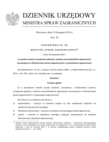 DZIENNIK URZĘDOWY MINISTRA SPRAW ZAGRANICZNYCH Warszawa, dnia 19 listopada 2014 r. Poz. 28 ZARZĄDZENIE Nr 28 M I N I S T R A S P R A W Z A G R A N I C Z N Y C H 1) z dnia 18 listopada 2014 r. w sprawie systemu zarządzania jakością i systemu przeciwdziałania zagrożeniom korupcyjnym w Ministerstwie Spraw Zagranicznych i w placówkach zagranicznych Na podstawie art. 34 ust. 1 ustawy z dnia 8 sierpnia 1996 r. o Radzie Ministrów (Dz. U. z 2012 r. poz. 392 z późn. zm.) zarządza się, co następuje: Rozdział 1 Przepisy ogólne § 1. Zarządzenie określa zasady działania, stosowania i doskonalenia systemu zarządzania jakością i systemu przeciwdziałania zagrożeniom korupcyjnym w Ministerstwie Spraw Zagranicznych i w placówkach zagranicznych. § 2. Ilekroć w zarządzeniu jest mowa o: 1) doskonaleniu – oznacza to działania mające na celu zwiększenie zdolności do spełnienia określonych wymagań; 2) Dyrektorze Generalnym - oznacza to Dyrektora Generalnego Służby Zagranicznej; 3) jakości – oznacza to spełnienie wymagań mających zastosowanie do działania Ministerstwa i placówek zagranicznych; 1) Minister Spraw Zagranicznych kieruje działami administracji rządowej – członkostwo Rzeczypospolitej Polskiej w Unii Europejskiej oraz sprawy zagraniczne na podstawie § 1 ust. 2 rozporządzenia Prezesa Rady Ministrów z dnia 22 września 2014 r. w sprawie szczegółowego zakresu działania Ministra Spraw Zagranicznych (Dz. U. poz. 1266). 4) Kierownictwie Ministerstwa – oznacza to Ministra, Sekretarzy Stanu, Podsekretarzy Stanu i Dyrektora Generalnego; 5) Księdze Jakości – oznacza to dokument opisujący system zarządzania jakością i system przeciwdziałania zagrożeniom korupcyjnym; 6) Ministrze – oznacza to Ministra Spraw Zagranicznych; 7) Ministerstwie – oznacza to Ministerstwo Spraw Zagranicznych; 8) placówkach zagranicznych – oznacza to przedstawicielstwo dyplomatyczne, stałe przedstawicielstwo przy organizacji międzynarodowej, urząd konsularny, instytut polski lub inną placówkę podległą Ministrowi Spraw Zagranicznych, mającą siedzibę poza granicami Rzeczypospolitej Polskiej; 9) podejściu procesowym – oznacza to systematyczną identyfikację procesów oraz odpowiednie zarządzanie tymi procesami i ich wzajemnymi powiązaniami; 10) procedurze – oznacza to ustalony sposób postępowania; 11) regulaminie – oznacza to obowiązujący regulamin organizacyjny Ministerstwa; 12) Systemie Zarządzania Jakością – oznacza to system zgodny z wymaganiami normy PN-EN ISO 9001:2009; 13) Systemie Przeciwdziałania Zagrożeniom Korupcyjnym – oznacza to system zgodny z wymaganiami dodatkowymi do PN-EN ISO 9001:2009; 14) wymaganiach – oznacza to wymagania wynikające z przepisów prawa oraz z możliwych do realizacji potrzeb i oczekiwań stron zainteresowanych działaniem Ministerstwa oraz placówek zagranicznych, jak również wymagania własne ustanowione przez Ministerstwo. Rozdział 2 System Zarządzania Jakością i System Przeciwdziałania Zagrożeniom Korupcyjnym § 3. 1. System Zarządzania Jakością, zwany dalej „SZJ”, to zestaw wzajemnie powiązanych lub wzajemnie na siebie oddziałujących elementów służących kierowaniu, koordynowaniu i nadzorowaniu działań zapewniających osiąganie zakładanych celów Ministerstwa i placówek zagranicznych dotyczących jakości. 2. Zakres SZJ został określony w Księdze Jakości, stanowiącej załącznik do zarządzenia. 3. SZJ funkcjonuje zgodnie z zasadami i procedurami określonymi w Księdze Jakości. 4. SZJ oparty jest na podejściu procesowym. KJ.0170.2014.3 - Księga Jakości Ministerstwa Spraw Zagranicznych Strona 2 z 21 5. Stosowanie zasad i procedur SZJ jest obowiązkiem pracowników Ministerstwa i placówek zagranicznych objętych tych systemem. § 4. 1. System Przeciwdziałania Zagrożeniom Korupcyjnym, zwany dalej „SPZK”, to część systemu zarządzania ukierunkowana na zapewnienie zaufania, że Ministerstwo i placówki zagraniczne wdrożyły rozwiązania eliminujące lub w znacznym stopniu ograniczające możliwość występowania zjawisk korupcyjnych. 2. Zakres i zasady SPZK zostały określone w Księdze Jakości. 3. Stosowanie zasad i procedur SPZK jest obowiązkiem pracowników Ministerstwa i placówek zagranicznych objętych tym systemem. Rozdział 3 Pełnomocnik Systemu Zarządzania Jakością § 5. Pełnomocnika Systemu Zarządzania Jakością, zwanego dalej „Pełnomocnikiem SZJ”, wyznacza i odwołuje Minister w drodze decyzji. § 6. 1. Zakres działania Pełnomocnika SZJ obejmuje opracowanie, wdrożenie, stosowanie i ciągłe doskonalenie Systemu Zarządzania Jakością. 2. Do zadań Pełnomocnika SZJ należy w szczególności: 1) kierowanie opracowaniem, wdrożeniem i doskonaleniem SZJ; 2) przygotowanie SZJ do certyfikacji; 3) upowszechnienie znajomości polityki jakości i polityki antykorupcyjnej, prawidłowego rozumienia pojęcia jakości, jak również stosowania zasad i procedur SZJ, o których mowa w Księdze Jakości; 4) planowanie i nadzór nad realizacją audytów jakości zgodnie z właściwą procedurą określoną w Księdze Jakości; 5) nadzorowanie skuteczności wdrożenia działań korekcyjnych, korygujących i zapobiegawczych dotyczących SZJ, zgodnie z właściwymi procedurami określonymi w Księdze Jakości; 6) koordynowanie badania potrzeb i percepcji klientów dotyczącego świadczonych usług KJ.0170.2014.3 - Księga Jakości Ministerstwa Spraw Zagranicznych Strona 3 z 21 przez Ministerstwo i placówki zagraniczne; 7) przedstawianie, co najmniej raz w roku, Kierownictwu Ministerstwa sprawozdania z działania SZJ, jego skuteczności oraz potrzeb, w tym w zakresie niezbędnych zasobów, związanych z jego doskonaleniem; 8) przygotowywanie i organizowanie przeglądów zarządzania zgodnie z właściwą procedurą określoną w Księdze Jakości; 9) nadzorowanie dokumentacji Systemu Zarządzania Jakością zgodnie z właściwą procedu