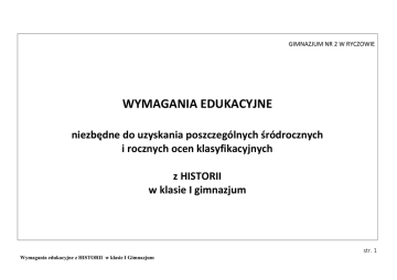 GIMNAZJUM NR 2 W RYCZOWIE WYMAGANIA EDUKACYJNE niezbędne do uzyskania poszczególnych śródrocznych i rocznych ocen klasyfikacyjnych z HISTORII w klasie I gimnazjum str. 1 Wymagania edukacyjne z HISTORII w klasie I Gimnazjum Wymagania edukacyjne niezbędne do uzyskania poszczególnych śródrocznych i rocznych ocen klasyfikacyjnych z przedmiotu historia w klasie I gimnazjum. Temat lekcji Ocenę dopuszczającą otrzymuje uczeń, który: Co to jest historia? - poprawnie posługuje się terminami: historia, źródło historyczne, nasza era, przed naszą erą, wiek - dokonuje prostej klasyfikacji źródeł historycznych - podaje przykłady źródeł pisanych i niepisanych - określa wiek danego wydarzenia 1. Prahistoria człowieka - poprawnie posługuje się terminami: australopitek, homo sapiens, koczowniczy tryb życia - wskazuje na mapie kolebkę ludzkości 2. Czas wielkich przemian Wymagania edukacyjne na poszczególne oceny Ocenę dostateczną otrzymuje Ocena dobrą otrzymuje uczeń, który spełnia uczeń, który spełnia wymagania na ocenę wymagania na ocenę dopuszczającą, a ponadto: dostateczną, a ponadto: - poprawnie posługuje się terminami: archeologia, epoki historyczne, chronologia, prahistoria - wymienia nazwy epok historycznych w kolejności chronologicznej: starożytność, średniowiecze, nowożytność, współczesność - umiejscawia wydarzenia w odpowiedniej epoce historycznej - poprawnie posługuje się terminami: homo habilis, homo erectus, homo neandertalensis, homo sapiens, ewolucja, paleolit - wymienia w kolejności etapy ewolucji człowieka - opisuje warunki życia ludzi w czasach prahistorycznych - podaje nazwy najważniejszych wynalazków człowieka z czasów prahistorycznych - poprawnie posługuje się - poprawnie posługuje się terminami: rewolucja neolityczna, terminami: neolit, megalit Ocenę bardzo dobrą otrzymuje uczeń, który spełnia wymagania na ocenę dobrą, a ponadto: - wyjaśnia, na czym polega praca historyka i archeologa - wymienia stosowane w przeszłości sposoby mierzenia czasu - określa ramy chronologiczne epok historycznych - omawia rolę źródeł historycznych w procesie poznawania dziejów - rozumie potrzebę tworzenia systemu datacji i posługiwania się nim - określa ramy chronologiczne kolejnych etapów ewolucji człowieka - podaje najistotniejsze cechy wyglądu różnych gatunków człowiekowatych i ich umiejętności - wskazuje na mapie kierunki i trasy ekspansji gatunku ludzkiego - omawia znaczenie tworzenia i praktycznego zastosowania narzędzi oraz opanowania umiejętności krzesania ognia dla rozwoju człowieka - wyjaśnia, na czym polegała zależność człowieka od przyrody - wymienia przyczyny powstania pierwszych dzieł sztuki praludzi - przedstawia wpływ zmian klimatycznych na tryb życia - omawia tryb życia i zajęcia ludzi epoki neolitu str. 2 Wymagania edukacyjne z HISTORII w klasie I Gimnazjum 3. W kraju Sumerów 4. Babilonia i Asyria osiadły tryb życia, osada, epoka brązu, epoka żelaza - przedstawia zmiany, które zaszły w życiu człowieka w okresie neolitu - podaje nazwy metali wykorzystywanych przez praludzi do wytopu broni, narzędzi, ozdób - określa ramy chronologiczne rewolucji neolitycznej - opisuje życie codzienne ludzi przed rewolucją neolityczną - omawia sposób wytopu brązu i żelaza - poprawnie posługuje się terminami: cywilizacja, Mezopotamia, system irygacyjny, Sumerowie, miasto-państwo - lokalizuje na mapie Mezopotamię - omawia położenie geograficzne i warunki naturalne panujące w Mezopotamii - wymienia osiągnięcia Sumerów - poprawnie posługuje się terminami: Babilon, Kodeks Hammurabiego, politeizm - określa, kim był i czym zasłynął Hammurabi - lokalizuje na mapie państwo babilońskie i asyryjskie - omawia najważniejsze zasady prawne zapisane w Kodeksie Hammurabiego - podaje ramy chronologiczne istnienia cywilizacji sumeryjskiej - poprawnie posługuje się terminami: Żyzny Półksiężyc, królkapłan, zikkurat - określa rolę rzek w starożytnej Mezopotamii - opisuje wygląd miast sumeryjskich - zna wydarzenia związane z datami: ok. 2 tys. lat p.n.e., XVIII w. p.n.e., VII w. p.n.e., 612 r. p.n.e., VI w. p.n.e. - poprawnie posługuje się terminami: Aszur, Niniwa, wiszące ogrody, rydwan - określa, kim byli czym zasłynęli: Nabuchodonozor II, Sargon II Wielki, Asurbanipal człowieka pierwotnego - omawia tryb życia i zajęcia ludzi epoki neolitu - nazywa i lokalizuje na mapie pozostałości najstarszej znanej osady ludzkiej - wskazuje na mapie miejsce położenia najbardziej znanej budowli megalitycznej - wyjaśnia, jakie zmiany nastąpiły w życiu człowieka dzięki opanowaniu umiejętności wytopu metali - charakteryzuje oddziaływanie warunków naturalnych na życie mieszkańców Mezopotamii - charakteryzuje wygląd osad neolitycznych - opisuje wygląd i funkcje budowli megalitycznych - omawia organizację państwa babilońskiego - prezentuje najważniejsze fakty z historii Asyrii i Babilonii - interpretuje zasadę „oko za oko, ząb za ząb” - omawia system religijny starożytnej Babilonii - przedstawia osiągnięcia cywilizacji asyryjskiej - wymienia rodzaje wojsk wchodzących w skład armii - ocenia starożytny system prawny - omawia system religijny starożytnej Babilonii - wymienia czynniki, które umożliwiły Asyryjczykom prowadzenie skutecznej polityki podbojów - omawia organizację państwa Sumerów - przedstawia związek między budową i utrzymaniem sieci irygacyjnej a powstaniem pierwszych państw str. 3 Wymagania edukacyjne z HISTORII w klasie I Gimnazjum asyryjskiej - zna wydarzenia związane z datami: ok. 3 tys. lat p.n.e., XIII w. p.n.e., 31 r. p.n.e. - podaje ramy chronologiczne istnienia cywilizacji egipskiej - przedstawia najważniejsze dokonania Ramzesa II - charakteryzuje strukturę społeczeństwa egipskiego - określa zakres władzy faraona 6. Piramidy, mumie - poprawnie posługuje się - zna wydarzenia związane z datami: i hi
