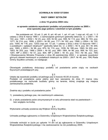 UCHWAŁA Nr XXIX/137/2004 RADY GMINY SZYDŁÓW z dnia 15 grudnia 2004 roku w sprawie ustalenia wysokości podatku od posiadania psów na 2005 r. oraz sposobu jego poboru i zwolnień w tym podatku Na podstawie art. 18 ust. 2, pkt. 8, art. 40 ust. 1, art. 41 ust. 1 oraz art. 42 ust. 1 i 2 ustawy z dnia 8 marca 1990 r. o samorządzie gminnym (jednolity tekst Dz. U. z 2001 r. Nr 142, poz. 1591, z 2002 r. Nr 23, poz. 220, Nr 62, poz. 558, Nr 113, poz. 984, Nr 153, poz. 1271, Nr 214, poz. 1806, z 2003 r. Nr 80, poz. 717 i Nr 162, poz. 1568 i z 2004 r. Nr 102, poz. 1055, Nr 116, poz. 1203) oraz art. 13 ust. 1 ustawy z dnia z dnia 12 stycznia 1991 r. o podatkach i opłatach lokalnych1) (jednolity tekst Dz. U. z 2002 r. Nr 9, poz. 84 i Nr 200, poz. 1683, z 2003 r. Nr 96, poz. 874, Nr 110, poz. 1039, Nr 188 poz. 1840, Nr 200, poz. 1953, Nr 203, poz. 1966 z 2004 r. Nr 92, poz. 880 i 884, Nr 96, poz. 959, Nr 123, poz. 1291, MP z 2003 r Nr 51, poz. 804, MP z 2004 r. Nr 43, poz. 743 i Nr 46, poz. 794) i Obwieszczenia Ministra Finansów z dnia 26 października 2004 r. w sprawie wysokości górnych stawek kwotowych w podatkach lokalnych na 2005 r. (M.P. Nr 46, poz. 794) Rada Gminy Szydłów uchwala, co następuje: § 1. Obowiązek podatkowy dotyczący podatku od posiadania psów ciąży na osobach fizycznych posiadających psy. § 2. Ustala się wysokość podatku od jednego psa w kwocie 40,00 zł rocznie. Podatek od posiadania psów płatny jest bez wezwania do dnia 31 marca roku podatkowego na rachunek budżetu gminy na terenie, której znajduje się miejsce zamieszkania podatnika. § 3. Zwalnia się z podatku od posiadania psów: 1) posiadaczy jednego psa, nie zwolnionych ustawowo, 2) z tytułu posiadania psów utrzymywanych w celu pilnowania stad na pastwiskach – bez względu na liczbę. § 4. Wykonanie uchwały powierza się Wójtowi Gminy Szydłów. § 5. Uchwała podlega ogłoszeniu w Dzienniku Urzędowym Województwa Świętokrzyskiego. § 6. Uchwała wchodzi w życie po upływie 14 dni od jej ogłoszenia w Dzienniku Urzędowym Województwa Świętokrzyskiego i ma zastosowanie na rok podatkowy 2005. UZASADNIENIE do uchwały Nr XXIX/137/2004 Rady Gminy Szydłów z dnia 15 grudnia 2004 r. w sprawie ustalenia wysokości podatku od posiadania psów na 2005 r. oraz sposobu jego poboru i zwolnień w tym podatku Ustawa z dnia 12 stycznia 1991 r. o podatkach i opłatach lokalnych ( jednolity tekst Dz. U. z 2002 r. Nr 9, poz. 84 z późniejszymi zmianami ) nakłada obowiązek ustalania przez Radę Gminy stawki podatku od posiadania psów na 2005 r. oraz sposobu jego poboru i zwolnień w tym podatku. Proponowane stawka podatku od posiadania psów na 2005 r. została zaproponowana w wysokości obowiązującej w 2004 roku. Stawka podatku od posiadania psów na 2005 r. była omawiana i została zaakceptowana przez stałe Komisje Rady Gminy. Wójt Gminy Szydłów