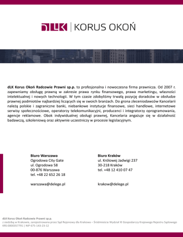 dLK Korus Okoń Radcowie Prawni sp.p. to profesjonalna i nowoczesna firma prawnicza. Od 2007 r. zapewniamy obsługę prawną w zakresie prawa rynku finansowego, prawa marketingu, własności intelektualnej i nowych technologii. W tym czasie zdobyliśmy trwałą pozycję doradców w obsłudze prawnej podmiotów najbardziej liczących się w swoich branżach. Do grona zleceniodawców Kancelarii należą polskie i zagraniczne banki, niebankowe instytucje finansowe, sieci handlowe, internetowe serwisy społecznościowe, operatorzy telekomunikacyjni, producenci i integratorzy oprogramowania, agencje reklamowe. Obok indywidualnej obsługi prawnej, Kancelaria angażuje się w działalność badawczą, szkoleniową oraz aktywnie uczestniczy w procesie legislacyjnym. Biuro Warszawa Ogrodowa City Gate ul. Ogrodowa 58 00-876 Warszawa tel. +48 22 652 26 18 Biuro Kraków ul. Królowej Jadwigi 237 30-218 Kraków tel. +48 12 410 07 47 [email protected] [email protected] dLK Korus Okoń Radcowie Prawni sp.p. z siedzibą w Krakowie, zarejestrowana przez Sąd Rejonowy dla Krakowa – Śródmieścia Wydział XI Gospodarczy Krajowego Rejestru Sądowego KRS 0000357791 | NIP 675-143-23-12