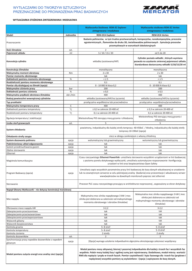 WYTŁACZARKI DO TWORZYW SZTUCZNYCH PRZEZNACZONE DO PROWADZENIA PRAC BADAWCZYCH WYTŁACZARKA STOŻKOWA ZINTEGROWANA I MODUŁOWA Model Jednostka szt. ml Konsrukcja cylindra Konstrukcja ślimaków Maksymalny moment obrotowy Pomiar momentu obrotowego Dokładność pomiaru momentu obrotowego Rozdzielczość pomiaru momentu obrotowego Pomiar siły działającej na ślimaki (opcja) Maksymalne ciśnienie pracy Dokładność pomiaru ciśnienia Maksymalna prędkość obrotowa ślimaków Rodzaj powierzchni wewnętrznej cylindrów Typ przekładni Maksymalna temperatura pracy Dokładność pomiaru temperatury Rozdzielczość pomiaru temperatury Nm % bar % obr./min C o C o C Rgulacja temperatury ( stabilizacja) Liczba sterf grzewczych szt. REM-2CA Vertex 2 5 / 10 / 15 / 20 2 od 5 do 20 wkładka (azotowana/HIP) Cylinder posiada wkładki , których wymiana pozwala na uzyskanie zmiennej pojemnosci układu. Standardowo dostarczamy wkładki 5/10/15/20 ml monolityczna 2 x 30 tak <±5 0,1 0 - 10 000 N klasa 0,2 200 ± 0,5 400 wkładka (azotowana/HIP/na życzenie) monolityczna 2 x 30 tak <±5 0,1 0 - 10 000 N klasa 0,2 200 ± 0,5 400 wkładka (azotowana/HIP/na życzenie) przełączalna współbieżna lub przeciwbieżna 400 ± 0,3 w zakresie 20-400 oC przełączalna- wspołbieżna/przeciwbieżna 400 ± 0,3 w zakresie 20-400 oC 0,1 w zakresie 20-400 oC 0,1 w zakresie 20-400 oC Wielostrefowy PID sterujący mocą grzania i chłodzenia 5 5 powietrzny, indywidualny dla każdej strefy tempracy -40-450oC / Wodny, indywidualny dla każdej strefy tempracy 10-190oC (opcja) ciecz w obiegu zamkniętym z własną chłodnicą Chłodzenie strefy zasypu opcja opcja opcja opcja opcja wolumetryczny lub grawimetryczny tak tak tak tak wolumetryczny lub grawimetryczny tak tak tak tak Czasu rzeczywistego Ethernet Powerlink- umożliwia sterowanie wszystkimi urządzeniami w linii badawczej z poziomu panelu dotykowego wytłaczarki, umożliwia automatyczne rozpoznawanie i konfigurację urzadzeń w linii oraz bezpieczeństwa Open Safety Magistrala komunikacyjna Program Badawczy (opcia) REM-2CA Explorer Wielostrefowy PID sterujący mocą grzania i chłodzenia System chłodzenia System dozowania polimeru Podciśnieniowy układ odgazowania System przedmuchiwania gazem Zdalne sterowanie Ethernet Wytłaczarka stożkowa REM-2C Vertex zintegrowana i modułowa Badanie polimerów, w tym trudno przetwarzalnych, kompozytów, nanokompozytów, procesów egzotermicznych , flamentów do druku 3D, światłowodów polimerowych . Symulacja procesów przemysłowych w warunkach labolatoryjnych Przeznaczenie Ilość ślimaków Pojemność układu Wytłaczarka Stożkowa REM-2C Explorer zintegrowana i modułowa opcja Umożliwia zapis wszystkich parametrów pracy linii badawczej do bazy danych wbudowanej w urzadzenie lub na zewnętrznym serwerze w celu późniejszej analizy (badania) oraz przezentacje ( wbudowany serwer www)wykresów na dowolnych monitorach poprzez sieć ethernet Procesor PLC czasu rzeczywistego pracujący w architekturze rozproszonej , wyposażony w ekran dotykowy Sterowanie Napęd Głowny Wytłaczarki - nie dotyczy konstrukcji modułowej Moc napędu Oferowane moce napędu kW Zabezpieczenie przeciazeniowe Zabezpieczenie przeciwzwarciowe Zabezpieczenie przeciwporazeniowe Wylacznik glówny Wylacznik bezpieczenstwa Kontrola grzania Kontrola temperatury Kontrola cisnienia Kontrola dozowników Synchronizacja pracy napedów dozowników z napedem glównym Moduł pomiaru zużycia energii oraz analizy sieci (opcja) szt. opcja Maksymalna moc silnika napędowego 3 kW ( moc silnika jest dobierana w zależności od maksymalnego momentu obrotowego i obrotów ślimaków) Maksymalna moc silnika napędowego 3 kW ( moc silnika jest dobierana w zależności od maksymalnego momentu obrotowego i obrotów ślimaków) 3-2,2 tak tak tak tak tak 5- 8 stref 5- 8 stref 2 strefy 2 3-2,2 tak tak tak tak tak 5- 8 stref 5- 8 stref 2 strefy 2 [Opcja] wymaga ustalenia indywidualnie algorytmu okreslajacego zaleznosci wspólpracy Moduł pomiaru mocy aktywnej, biernej i pozornej indywidualnie dla każdej z trzech faz i wszystkich faz wspólnie. Pobór mocy każdej fazy i ogólnej sumy jest rejestrowany. Dodatkowo, moduł mierzy wartości RMS dla napięcia i prądu w trzech fazach. Pomiar częstotliwość i kąta fazowego dla trzech faz (prądowe i napięciowe) wszystkie pomiary są wyświetlane i (opcja ) zapisywane do bazy danych.