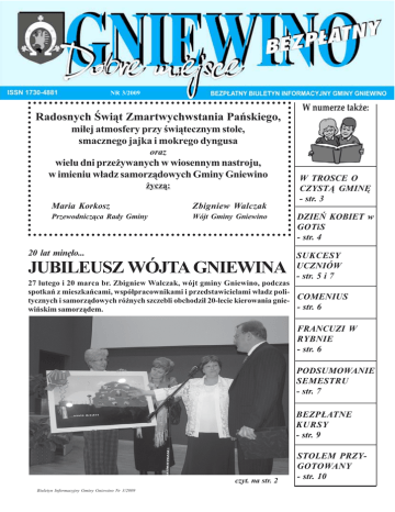 NR 3/2009 Radosnych Œwi¹t Zmartwychwstania Pañskiego, mi³ej atmosfery przy œwi¹tecznym stole, smacznego jajka i mokrego dyngusa oraz wielu dni prze¿ywanych w wiosennym nastroju, w imieniu w³adz samorz¹dowych Gminy Gniewino ¿ycz¹: Maria Korkosz Zbigniew Walczak Przewodnicz¹ca Rady Gminy Wójt Gminy Gniewino 20 lat minê³o... str. 4 JUBILEUSZ WÓJTA GNIEWINA W TROSCE O CZYST¥ GMINÊ - str. 3 DZIEÑ KOBIET w GOTiS - str. 4 SUKCESY UCZNIÓW - str. 5 i 7 27 lutego i 20 marca br. Zbigniew Walczak, wójt gminy Gniewino, podczas spotkañ z mieszkañcami, wspó³pracownikami i przedstawicielami w³adz politycznych i samorz¹dowych ró¿nych szczebli obchodzi³ 20-lecie kierowania gnie- COMENIUS (czyt. str. 2) - str. 6 wiñskim samorz¹dem. FRANCUZI W RYBNIE - str. 6 PODSUMOWANIE SEMESTRU - str. 7 BEZP£ATNE KURSY - str. 9 czyt. na str. 2 Biuletyn Informacyjny Gminy Gniewino Nr 3/2009 STOLEM PRZYGOTOWANY - str. 10 Dobre miejsce 20 lat minê³o... JUBILEUSZ WÓJTA 27 lutego i 20 marca br. Zbigniew Walczak, wójt gminy Gniewino, podczas spotkañ z mieszkañcami, wspó³pracownikami i przedstawicielami w³adz politycznych i samorz¹dowych ró¿nych szczebli obchodzi³ 20-lecie kierowania gniewiñskim samorz¹dem. Od 26 paŸdziernika, po demokratycznym wyborze przez ówczesn¹ Gminn¹ Radê Narodow¹ - co by³o ewenementem na owe czasy - i zatwierdzeniu 15 grudnia 1989 r. przez w³adze wojewódzkie, ster gminnej w³adzy dzier¿y nieprzerwanie Zbigniew Walczak. Wpierw, jako naczelnik gminy, a potem ju¿ jako wójt, wybierany w demokratycznych wyborach przez lokaln¹ spo³ecznoœæ. Co w tym jest takiego, ¿e przez tyle lat, w przeci¹gu których zmieni³ siê ustrój, zmienia³y siê opcje polityczne, a wójt by³ i jest ci¹gle ten sam? Mo¿e w liœcie gratulacyjnym, który wystosowa³ do wójta Walczaka wiceminister rolnictwa i pose³ Kazimierz Plocke, znajdziemy, choæ po czêœci, odpowiedŸ na to pytanie... „Szanowny Panie Wójcie! – pisze minister Plocke – Z okazji piêknego jubileuszu 20 lecia pracy na rzecz spo³ecznoœci gminy Gniewino sk³adam Panu serdeczne gratulacje. Jestem pod wra¿eniem ogromnego zaanga¿owania w rozwi¹zywanie problemów zwyk³ych ludzi, budowanie demokracji lokalnej i tworzenia warunków do podejmowania proinwestycyjnych dzia³añ w piêknej i gospodarnej gminie Gniewino. Panie Wójcie, proszê przyj¹æ podziêkowania za dotychczasow¹ Pañsk¹ skuteczn¹ s³u¿bê w dziedzinie rozwoju samorz¹du terytorialnego na pomorskiej ziemi. Dokonania gminy Gniewino by³y i s¹ inspiracj¹ dla samorz¹dów terytorialnych w Polsce. W ci¹gu minionych 20 lat osi¹gniêto bardzo wiele i to jest piêkna karta historii Pañskiej aktywnoœci i mieszkañców gminy Gniewino. Wiele nowych wyzwañ przed nami. Dlatego ¿yczê Panu dalszego rozwoju w budowaniu samorz¹dnoœci, satysfakcji z pe³nionej s³u¿by i ¿yczliwoœci wœród mieszkañców.” W pierwszym spotkaniu wziêli udzia³ g³ównie dzia³acze lokalnej spo³ecznoœci, wspó³pracownicy wójta i przedstawiciele mieszkañców. Oficjalna czêœæ uroczystoœæ odby³a siê w sali kinowej GOTiS. Zaproszeni goœcie zostali poproszeni, by zamiast kwiatów czy okolicznoœciowych upominków, wykupywali specjalnie przygotowane bilety, z których dochód zostanie w ca³oœci przeznaczony na rzecz Towarzystwa Oœwiatowego w Gniewnie. W ten sposób finanse Towarzystwa wzbogaci³y siê ponad 6 tys. z³. Ale i tak niektórzy z goœci, oprócz wykupu biletów, wrêczyli Zbigniewowi Walczakowi kwiaty i upominki. - Do pracy w Gniewinie od pocz¹tku podeszliœmy planowo i pragmatycznie ale te¿ z entuzjazmem, który nie zawsze entuzjastê musi zgubiæ – mówi³, dziel¹c siê wspomnieniami wójt Walczak.- By³o to wszystko potrzebne, bo gmina by³a w kryzysie – koñczy³a siê niczym wielka budowa elektrowni j¹drowej, upad³y PGR-y. Od pocz¹tku mieliœmy przygotowany raport o stanie gminy i koncepcjê wyjœcia z g³êbokiego kryzysu. Rozmowy, które prowadzi- 2 ³em z kierownictwem Obywatelskiego Komitetu, g³ównie z panem Tadeuszem Jastrzêbskim, ugruntowywa³y mnie w przekonaniu, ¿e trzeba i mo¿na wiele zrobiæ ponad podzia³ami, choæ powa¿nych podzia³ów i antagonizmów na szczêœcie nie by³o. Zawsze umieliœmy siê dogada w sprawach wa¿nych dla gminy. - Chcia³bym dodaæ, ¿e i tak nie jestem najstarszym pracownikiem naszej gminy – zakoñczy³ wójt. – Przecie¿ Maria Patelczyk, nasza pani skarbnik, pracuje ju¿ nieprzerwanie 40 lat! Ponad 30 lat pracuje Gabriela Wyszecka, a tylko nieco krócej Danuta Gacek. Tym paniom chcia³bym za to serdecznie i gor¹co podziêkowaæ. Goœcie mieli te¿ okazjê obejrzeæ prezentacjê multimedialn¹ o dotychczasowych osi¹gniêciach swojej gminy, planach na najbli¿sz¹ przysz³oœæ a tak¿e obejrzeæ film opowiadaj¹cy o tym, jak Gniewino wygl¹da³o kilkanaœcie lat temu - trudno by³o poznaæ, ¿e to ta sama gmina. Na drug¹, mniej oficjaln¹ czêœæ spotkania wójt zaprosi³ goœci do „Trzech Koron”. Tam m.in. w nieco mniej oficjalny sposób dzielono siê wspomnieniami, a uczestnicy spotkania wziêli udzia³ w losowanie nagród ufundowanych przez wójta, m.in. wyprodukowanych we Francji „gniewiñskich szampanów”. Podobny przebieg mia³o kolejne spotkanie 20 marca br., na które wójt Zbigniew Walczak zaprosi³ g³ównie parlamentarzystów, przedstawicieli w³adz samorz¹dowych ró¿nych szczebli oraz firm i instytucji, które na co dzieñ wspó³pracuj¹ z nasz¹ gmin¹. Byli wœród nich m.in. pos³owie: Kazimierz Plocke, Witold Namyœlak, marsza³ek Jan Koz³owski i jego zastêpca Mieczys³aw Struk, sekretarz powiatu Marek Panek, wiceprezydent Wejherowa Bogdan Tok³owicz, burmistrz Redy Krzysztof Krzemiñski, wójtowie: Krokowej - Henryk Doering i Choczewa - Jacek Micha³owski. Byli te¿ Honorowi Obywatele Gminy Gniewino: W³adys³aw Brzozowski, Les³aw Furmaga i Karl-Heinz Knop a tak¿e Krzysztof Pusz, b. wojewoda pomorski, Teresa Kamiñska, prez