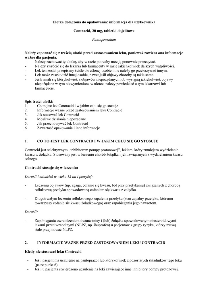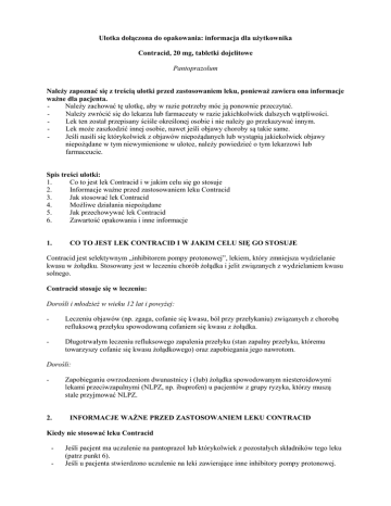Ulotka dołączona do opakowania: informacja dla użytkownika Contracid, 20 mg, tabletki dojelitowe Pantoprazolum Należy zapoznać się z treścią ulotki przed zastosowaniem leku, ponieważ zawiera ona informacje ważne dla pacjenta. Należy zachować tę ulotkę, aby w razie potrzeby móc ją ponownie przeczytać. Należy zwrócić się do lekarza lub farmaceuty w razie jakichkolwiek dalszych wątpliwości. Lek ten został przepisany ściśle określonej osobie i nie należy go przekazywać innym. Lek może zaszkodzić innej osobie, nawet jeśli objawy choroby są takie same. Jeśli nasili się którykolwiek z objawów niepożądanych lub wystąpią jakiekolwiek objawy niepożądane w tym niewymienione w ulotce, należy powiedzieć o tym lekarzowi lub farmaceucie. Spis treści ulotki: 1. Co to jest lek Contracid i w jakim celu się go stosuje 2. Informacje ważne przed zastosowaniem leku Contracid 3. Jak stosować lek Contracid 4. Możliwe działania niepożądane 5. Jak przechowywać lek Contracid 6. Zawartość opakowania i inne informacje 1. CO TO JEST LEK CONTRACID I W JAKIM CELU SIĘ GO STOSUJE Contracid jest selektywnym „inhibitorem pompy protonowej”, lekiem, który zmniejsza wydzielanie kwasu w żołądku. Stosowany jest w leczeniu chorób żołądka i jelit związanych z wydzielaniem kwasu solnego. Contracid stosuje się w leczeniu: Dorośli i młodzież w wieku 12 lat i powyżej: - Leczeniu objawów (np. zgaga, cofanie się kwasu, ból przy przełykaniu) związanych z chorobą refluksową przełyku spowodowaną cofaniem się kwasu z żołądka. - Długotrwałym leczeniu refluksowego zapalenia przełyku (stan zapalny przełyku, któremu towarzyszy cofanie się kwasu żołądkowego) oraz zapobiegania jego nawrotom. Dorośli: Zapobieganiu owrzodzeniom dwunastnicy i (lub) żołądka spowodowanym niesteroidowymi lekami przeciwzapalnymi (NLPZ, np. ibuprofen) u pacjentów z grupy ryzyka, którzy muszą stale przyjmować NLPZ. - 2. INFORMACJE WAŻNE PRZED ZASTOSOWANIEM LEKU CONTRACID Kiedy nie stosować leku Contracid - Jeśli pacjent ma uczulenie na pantoprazol lub którykolwiek z pozostałych składników tego leku (patrz punkt 6). Jeśli u pacjenta stwierdzono uczulenie na leki zawierające inne inhibitory pompy protonowej. Ostrzeżenia i środki ostrożności Przed rozpoczęciem stosowania leku Contracid należy zwrócić się do lekarza lub farmaceuty: - - - - Jeśli występują poważne zaburzenia czynności wątroby. Należy poinformować lekarza, jeśli kiedykolwiek występowały zaburzenia czynności wątroby. Lekarz może zlecić częstszą kontrolę aktywności enzymów wątrobowych, szczególnie gdy stosowane jest długotrwałe leczenie lekiem Contracid. W razie zwiększenia aktywności enzymów wątrobowych stosowanie leku należy przerwać. Jeśli pacjent musi stale stosować leki z grupy NLPZ i jednocześnie przyjmować Contracid, ze względu na podwyższone ryzyko powikłań ze strony żołądka lub jelit. Podwyższone ryzyko zostanie ocenione zgodnie z czynnikami ryzyka dla danego pacjenta, takimi jak wiek (65 lat lub więcej), wrzody żołądka lub dwunastnicy w wywiadzie lub krwawienie z żołądka lub jelit. Jeśli u pacjenta występuje niedobór witaminy B12 lub występują czynniki ryzyka wskazujące na możliwość zmniejszenia stężenia witaminy B12, a pacjent leczony jest długotrwale pantoprazolem. Podobnie jak w przypadku wszystkich leków zmniejszających (hamujących) wydzielanie kwasu solnego w żołądku, pantoprazol może prowadzić do zmniejszonego wchłaniania witaminy B12. Jeśli pacjent przyjmuje lek zawierający atazanawir (stosowany w leczeniu zakażenia HIV) jednocześnie z pantoprazolem, powinien poprosić lekarza o szczegółową poradę. W przypadku pojawienia się następujących objawów należy natychmiast poinformować lekarza: niezamierzona utrata masy ciała; nawracające wymioty; trudności z przełykaniem; krwawe wymioty; bladość i osłabienie (niedokrwistość); krew w kale; ciężkie i (lub) uporczywe biegunki, ponieważ stosowanie leku Contracid wiąże się z niewielkim zwiększeniem ryzyka wystąpienia biegunki zakaźnej. Lekarz może zdecydować o konieczności wykonania badań w celu wykluczenia podłoża nowotworowego choroby, gdyż leczenie pantoprazolem może złagodzić objawy choroby nowotworowej i opóźnić jej rozpoznanie. Jeśli objawy utrzymują się mimo leczenia, należy rozważyć wykonanie dalszych badań. W przypadku przyjmowania leku Contracid przez dłuższy okres (ponad 1 rok), pacjent prawdopodobnie będzie znajdował się pod stałą opieką lekarza. W takim przypadku należy w trakcie każdej wizyty u lekarza zgłaszać wszelkie nowe i nieoczekiwane objawy oraz okoliczności ich wystąpienia. Dzieci i młodzież Te tabletki nie są zalecane do stosowania u dzieci w wieku poniżej 12 lat. Inne leki i Contracid Należy powiedzieć lekarzowi lub farmaceucie o wszystkich lekach stosowanych obecnie lub ostatnio a także o lekach, które pacjent planuje stosować. Contracid może wpływać na skuteczność działania innych leków, dlatego też należy powiedzieć lekarzowi jeśli pacjent przyjmuje: - Leki, takie jak ketokonazol, itrakonazol i posakonazol (stosowane w leczeniu zakażeń grzybiczych) lub erlotynib (stosowany w pewnych typach nowotworów), ponieważ Contracid może hamować prawidłowe działanie tych i innych leków. 2 - Warfarynę i fenprokumon, które wpływają na gęstość krwi. Może istnieć konieczność wykonania dalszych badań. Atazanawir (stosowany w leczeniu zakażenia HIV). Ciąża i karmienie piersią Doświadczenie w stosowaniu u kobiet w ciąży jest ograniczone. Stwierdzono przenikanie substancji czynnej leku do mleka kobiecego. Lek może być stosowany u kobiet w ciąży lub kobiet, u których nie można wykluczyć ciąży lub kobiet karmiących piersią jedynie wtedy, jeśli lekarz uzna, że korzyść z jego stosowania jest większa, niż potencjalne ryzyko dla nienarodz