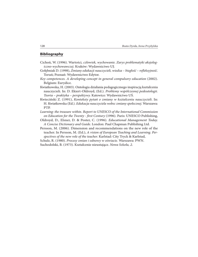 128 Beata Dyrda, Irena Przybylska Bibliography Cichoń, W. (1996). Wartości, człowiek, wychowanie. Zarys problematyki aksjologiczno-wychowawczej. Kraków: Wydawnictwo UJ. Gołębniak D. (1998), Zmiany edukacji nauczycieli, wiedza – biegłość – refleksyjność. Toruń; Poznań: Wydawnictwo Edytor. Key competences. A developing concept in general compulsory education (2002). Belgium: Eurydice. Kwiatkowska, H. (2003). Ontologia działania pedagogicznego inspiracją kształcenia nauczycieli. In: D. Ekiert-Oldroyd, (Ed.). Problemy współczesnej pedeutologii. Teoria – praktyka – perspektywy. Katowice: Wydawnictwo UŚ. Kwieciński Z. (1991), Konteksty pytań o zmiany w kształceniu nauczycieli. In: H. Kwiatkowska (Ed.). Edukacja nauczyciela wobec zmiany społecznej. Warszawa: PTP. Learning: the treasure within. Report to UNESCO of the International Commission on Education for the Twenty - first Century (1996). Paris: UNESCO Publishing, Oldroyd, D., Elsner, D. & Poster, C. (1996). Educational Management Today. A Concise Dictionary and Guide. London: Paul Chapman Publishing Ltd. Persson, M. (2006). Dimension and recommendations on the new role of the teacher. In Persson, M. (Ed.), A vision of European Teaching and Learning. Perspectives of the new role of the teacher. Karlstad: City Tryck & Karlstad, Schulz, R. (1980). Procesy zmian i odnowy w oświacie. Warszawa: PWN. Suchodolski, B. (1973). Kształcenie nieustające. Nowa Szkoła, 2.