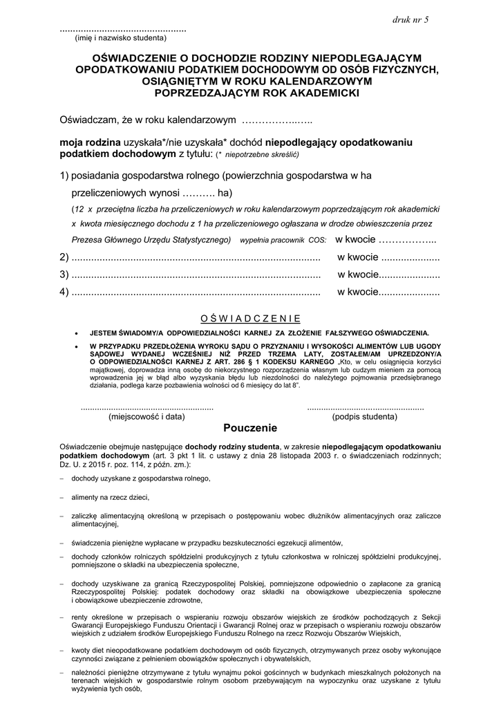 druk nr 5 ………………………………………… (imię i nazwisko studenta) OŚWIADCZENIE O DOCHODZIE RODZINY NIEPODLEGAJĄCYM OPODATKOWANIU PODATKIEM DOCHODOWYM OD OSÓB FIZYCZNYCH, OSIĄGNIĘTYM W ROKU KALENDARZOWYM POPRZEDZAJĄCYM ROK AKADEMICKI Oświadczam, że w roku kalendarzowym ……………..….. moja rodzina uzyskała*/nie uzyskała* dochód niepodlegający opodatkowaniu podatkiem dochodowym z tytułu: (* niepotrzebne skreślić) 1) posiadania gospodarstwa rolnego (powierzchnia gospodarstwa w ha przeliczeniowych wynosi ………. ha) (12 x przeciętna liczba ha przeliczeniowych w roku kalendarzowym poprzedzającym rok akademicki x kwota miesięcznego dochodu z 1 ha przeliczeniowego ogłaszana w drodze obwieszczenia przez Prezesa Głównego Urzędu Statystycznego) wypełnia pracownik COS: w kwocie ……………... 2) ......................................................................................... w kwocie ..................... 3) ......................................................................................... w kwocie...................... 4) ......................................................................................... w kwocie...................... OŚWIADCZENIE JESTEM ŚWIADOMY/A ODPOWIEDZIALNOŚCI KARNEJ ZA ZŁOŻENIE FAŁSZYWEGO OŚWIADCZENIA. W PRZYPADKU PRZEDŁOŻENIA WYROKU SĄDU O PRZYZNANIU I WYSOKOŚCI ALIMENTÓW LUB UGODY SĄDOWEJ WYDANEJ WCZEŚNIEJ NIŻ PRZED TRZEMA LATY, ZOSTAŁEM/AM UPRZEDZONY/A O ODPOWIEDZIALNOŚCI KARNEJ Z ART. 286 § 1 KODEKSU KARNEGO „Kto, w celu osiągnięcia korzyści majątkowej, doprowadza inną osobę do niekorzystnego rozporządzenia własnym lub cudzym mieniem za pomocą wprowadzenia jej w błąd albo wyzyskania błędu lub niezdolności do należytego pojmowania przedsiębranego działania, podlega karze pozbawienia wolności od 6 miesięcy do lat 8”. ......................................................... (miejscowość i data) .................................................. (podpis studenta) Pouczenie Oświadczenie obejmuje następujące dochody rodziny studenta, w zakresie niepodlegającym opodatkowaniu podatkiem dochodowym (art. 3 pkt 1 lit. c ustawy z dnia 28 listopada 2003 r. o świadczeniach rodzinnych; Dz. U. z 2015 r. poz. 114, z późn. zm.): dochody uzyskane z gospodarstwa rolnego, alimenty na rzecz dzieci, zaliczkę alimentacyjną określoną w przepisach o postępowaniu wobec dłużników alimentacyjnych oraz zaliczce alimentacyjnej, świadczenia pieniężne wypłacane w przypadku bezskuteczności egzekucji alimentów, dochody członków rolniczych spółdzielni produkcyjnych z tytułu członkostwa w rolniczej spółdzielni produkcyjnej, pomniejszone o składki na ubezpieczenia społeczne, dochody uzyskiwane za granicą Rzeczypospolitej Polskiej, pomniejszone odpowiednio o zapłacone za granicą Rzeczypospolitej Polskiej: podatek dochodowy oraz składki na obowiązkowe ubezpieczenia społeczne i obowiązkowe ubezpieczenie zdrowotne, renty określone w przepisach o wspieraniu rozwoju obszarów wiejskich ze środków pochodzących z Sekcji Gwarancji Europejskiego Funduszu Orientacji i Gwarancji Rolnej oraz w przepisach o wspieraniu rozwoju obszarów wiejskich z udziałem środków Europejskiego Funduszu Rolnego na rzecz Rozwoju Obszarów Wiejskich, kwoty diet nieopodatkowane podatkiem dochodowym od osób fizycznych, otrzymywanych przez osoby wykonujące czynności związane z pełnieniem obowiązków społecznych i obywatelskich, należności pieniężne otrzymywane z tytułu wynajmu pokoi gościnnych w budynkach mieszkalnych położonych na terenach wiejskich w gospodarstwie rolnym osobom przebywającym na wypoczynku oraz uzyskane z tytułu wyżywienia tych osób, świadczenia określone w przepisach o wykonywaniu mandatu posła i senatora, stypendia doktoranckie i habilitacyjne przyznane na podstawie ustawy z dnia 14 marca 2003 r. o stopniach naukowych i tytule naukowym oraz o stopniach i tytule w zakresie sztuki (Dz. U. z 2014 r. poz. 1852, z późn. zm.), stypendia doktoranckie określone w art. 200 ustawy z dnia 27 lipca 2005 r. Prawo o szkolnictwie wyższym, stypendia sportowe przyznane na podstawie ustawy z dnia 25 czerwca 2010 r. o sporcie (Dz. U. z 2016 r. poz. 176) oraz inne stypendia o charakterze socjalnym przyznane uczniom lub studentom, z wyjątkiem świadczeń pomocy materialnej dla studentów i doktorantów, otrzymywanych na podstawie przepisów ustawy Prawo o szkolnictwie wyższym, stypendiów przyznawanych uczniom, studentom i doktorantom w ramach: funduszy strukturalnych Unii Europejskiej, niepodlegających zwrotowi środków pochodzących z pomocy udzielanej przez państwa członkowskie Europejskiego Porozumienia o Wolnym Handlu (EFTA), umów międzynarodowych lub programów wykonawczych, sporządzanych do tych umów albo międzynarodowych programów stypendialnych; świadczeń pomocy materialnej dla uczniów otrzymywanych na podstawie ustawy z dnia 7 września 1991 r. o systemie oświaty; świadczeń, o których mowa w ustawie Prawo o szkolnictwie wyższym: świadczeń pomocy materialnej przyznanych dla studentów i doktorantów przez jednostki samorządu terytorialnego (art. 173a i 199a ustawy), stypendiów o charakterze socjalnym przyznawanych przez inne podmioty, o których mowa w art. 21 ust. 1 pkt 40b ustawy z dnia 26 lipca 1991 r. o podatku dochodowym od osób fizycznych, zasiłki chorobowe określone w przepisach o ubezpieczeniu społecznym rolników oraz w przepisach o systemie ubezpieczeń społecznych, renty określone w przepisach o zaopatrzeniu inwalidów wojennych i wojskowych oraz ich rodzin, renty wypłacone osobom represjonowanym i członkom ich rodzin, przyznane na zasadach określonych w przepisach o zaopatrzeniu inwalidów wojennych i wojskowych oraz ich rodzin, świadczenia pieniężne oraz ryczałt energetyczny określone w przepisach o świadczeniu pieniężnym i uprawnieniach przysługujących żołnierzom zastępczej służby w