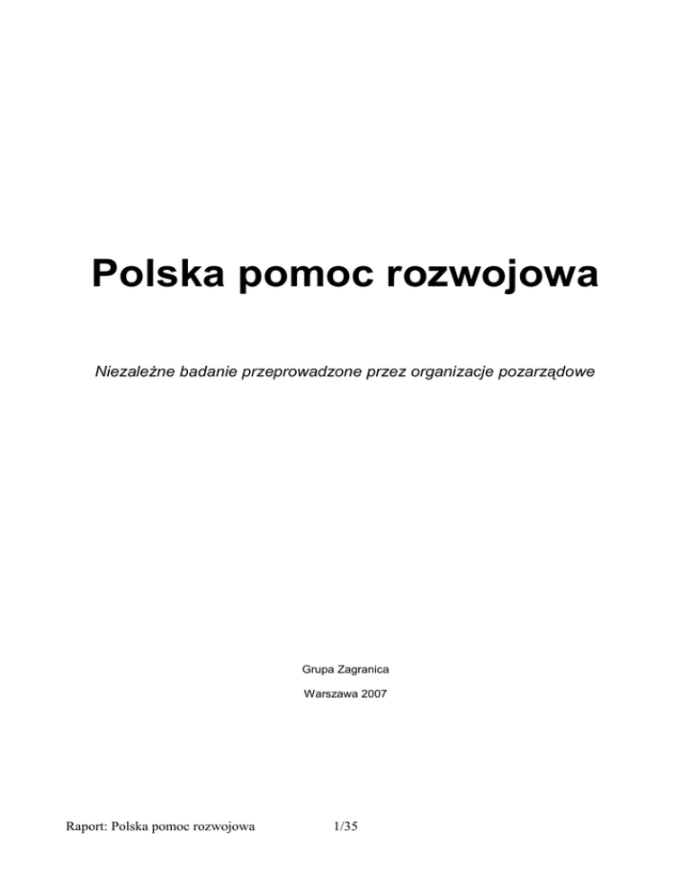 Polska pomoc rozwojowa Niezależne badanie przeprowadzone przez organizacje pozarządowe Grupa Zagranica Warszawa 2007 Raport: Polska pomoc rozwojowa 1/35 Raport jest wynikiem pracy grupy roboczej ds. monitoringu polskiej pomocy zagranicznej. Grupa robocza działa w ramach Grupy Zagranica. Osoby zaangażowane w realizację projektu: Staszek Alwasiak – Polska Misja Medyczna Aleksandra Antonowicz – Polska Zielona Sieć Andrzej Bobiński – Centrum Stosunków Międzynarodowych Justyna Janiszewska – Fundacja Edukacja dla Demokracji Paulina Kaczmarska – Polska Akcja Humanitarna Zofia Łapniewska – NEWW Polska Bożena Pawlak – Gdańska Fundacja Oświatowa Bartłomiej Tomalik – Kolegium Europy Wschodniej im. Jana Nowaka-Jeziorańskiego Marcin Wojtalik – koordynator projektu i redaktor raportu Marta Pejda – korekta Projekt został sfinansowany w ramach Programu Polsko-Amerykańskiej Fundacji Wolności Przemiany w Regionie – RITA, realizowanego przez Fundację Edukacja dla Demokracji. Copyright (C) Grupa Zagranica 2007 Grupa Zagranica ul. Sapieżyńska 10a 00-215 Warszawa www.zagranica.org.pl Raport: Polska pomoc rozwojowa 2/35 Spis treści 1. Dlaczego warto przeczytać ten raport............................................................................... 4 2. Podstawowe informacje o współpracy rozwojowej i pomocy zagranicznej.......................6 Dlaczego Polska powinna pomagać innym krajom?.................................................................................... 6 Czym jest pomoc rozwojowa, polityka rozwojowa i współpraca rozwojowa?............................................... 7 Jakie są deklarowane cele polskiej pomocy zagranicznej?......................................................................... 9 Pomoc rozwojowa a pomoc zagraniczna..................................................................................................... 9 Z jakich zobowiązań wynika polska pomoc zagraniczna?......................................................................... 10 Dlaczego wartość polskiej pomocy rośnie w szybkim tempie?.................................................................. 11 3. Rola organizacji pozarządowych.....................................................................................13 4. Główne ustalenia badania................................................................................................14 Procedura wydatkowania środków a realizacja strategii............................................................................ Wydatki na poszczególne kraje a realizacja strategii................................................................................. Niektóre kategorie wydatków a realizacja strategii.................................................................................... Realizacja Milenijnych Celów Rozwoju...................................................................................................... Wpływ obecnych regulacji prawnych na efektywność pomocy.................................................................. Zobowiązania dotyczące jakości pomocy.................................................................................................. Spójność polityk jako warunek rzeczywistych zmian................................................................................. Przejrzystość i szczegółowość informowania opinii publicznej ................................................................. Terminowość raportowania........................................................................................................................ 14 17 19 21 23 23 25 25 26 5. Rekomendacje.................................................................................................................27 Wzmocnienie koordynacyjnej roli MSZ...................................................................................................... 27 Koncentracja na priorytetach..................................................................................................................... 27 Niepodejmowanie nowych zobowiązań niezgodnych ze strategią............................................................. 28 Przejrzystość informowania o polskiej współpracy rozwojowej.................................................................. 28 Ograniczenie wiązania pomocy................................................................................................................. 29 Zorientowanie na potrzeby ostatecznego beneficjenta.............................................................................. 29 6. Literatura..........................................................................................................................30 Kluczowe dokumenty, dotyczące polskiej pomocy:................................................................................... 30 Niektóre zagraniczne dokumenty na temat pomocy:................................................................................. 30 Aneks 1. Cele, zakres i metodologia projektu......................................................................31 Aneks 2. Europejski monitoring pomocy rozwojowej...........................................................34 Główne tematy raportu opublikowanego w 2007 r..................................................................................... 34 Rekomendacje Concord............................................................................................................................ 35 Polska w raporcie Concord........................................................................................................................ 35 Raport: Polska pomoc rozwojowa 3/35 1. Dlaczego warto przeczytać ten raport Z dala od błysku fleszów i na marginesie głównego nurtu polskiej polityki ma miejsce proces, którego skutki – zarówno dla Polski, jak i dla innych krajów – będą głębsze niż wiele bieżących wydarzeń, przyci