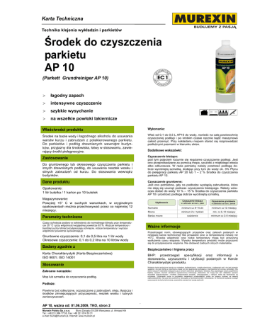 Karta Techniczna Technika klejenia wykładzin i parkietów KLT_AP10.doc Środek do czyszczenia parkietu AP 10 (Parkett Grundreiniger AP 10) > łagodny zapach > intensywne czyszczenie > szybkie wysychanie > na wszelkie powłoki lakiernicze Właściwości produktu Wykonanie: Środek na bazie wody i łagodnego alkoholu do usuwania Wlać od 0,1 do 0,5 L AP10 do wody, nanieść na całą powierzchnię czyszczonej podłogi i po krótkim czasie ręcznie bądź maszynowo całość przemyć. Przy nakładaniu mopem starać się rozprowadzać podłużnymi pasmami w kierunku okien. warstw kurzu i zabrudzeń z polakierowanego parkietu. Do parkietów i podłóg drewnianych wewnątrz budynków, przyjazny dla środowiska, łatwy w stosowaniu, zawierający środki pielęgnacyjne. Dodatkowe wskazówki: Zastosowanie Czyszczenie bieżące: pod tym pojęciem rozumie się regularne czyszczenie podłogi. Jest ono przeprowadzane za pomocą mopa, szczotki z miękkiego włosia albo odkurzacza. W razie potrzeby należy przetrzeć podłogę dobrze wyciśniętą szmatką, dodając przy tym do wody ok. 3% Płynu do pielęgnacji parkietu AP 20 lub 1 – 2 % Środka do czyszczenia parkietu AP 10. Do gruntownego lub okresowego czyszczenia parkietu i innych drewnianych podłóg, do usuwania resztek wosku i silnych zabrudzeń od kurzu. Do stosowania wewnątrz budynków. Dane produktu Czyszczenie gruntowne: Jest ono potrzebne, gdy na podłodze wystąpią zabrudzenia, które nie dają się usunąć podczas czyszczenia bieżącego. Należy wówczas dodać do wody 10 % – 15 % Środka do czyszczenia parkietu AP 10 i przetrzeć podłogę dobrze wyciśniętą szmatką. Opakowanie: 1 litr butelka / 1 karton po 10 butelek Magazynowanie: Powyżej +5° C w suchych warunkach, w oryginalnym opakowaniach można przechowywać przez co najmniej 12 miesięcy. Parametry techniczne Czasy schnięcia podano w odniesieniu do normalnego klimatu przy temperaturze 20 °C i przy wilgotności względnej powietrza 65 %. Wyższe temperatury i bardziej suchy klimat przyśpieszają schnięcie, niższe temperatury i wyższa wilgotność powietrza spowalniają je Ważne informacje Przestrzegać norm, obowiązujących przepisów oraz zaleceń podanych w niniejszej karcie technicznej! Nie prowadzić prac w temperaturze niższej niż +5oC. Wysoka wilgotność oraz niskie temperatury mogą być przyczyną wydłużenia czasu wiązania. Wysoka temperatura produktu może przyczynić się do przyśpieszenia wiązania. Nie dodawać żadnych obcych materiałów. Gruntowne czyszczenie: 0,1 do 0,5 litra na 1 litr wody Okresowe czyszczenie: 0,1 do 0,2 litra na 10 litrów wody Badany zgodnie z Bezpieczeństwo i higiena pracy Karta Charakterystyki (Karta Bezpieczeństwa) ISO 9001; ISO 14001 BHP: przestrzegać specyfikacji oraz informacji o stosowaniu, czyszczeniu i utylizacji podanych w Karcie Charakterystyki produktu. Stosowanie Niniejsza karta techniczna bazuje na rozległym doświadczeniu, została stworzona z najlepszej woli, nie jest prawnie wiążąca i nie jest ofertą w rozumieniu prawa czy też gwarancją wynikającą z zamówienia lub umowy sprzedaży. Dla dobra naszych materiałów dołączamy ją w ramach warunków sprzedaży i dostawy. Aby zapobiegać ryzyku popełnienia błędów zawarto również określone (ograniczone) informacje. Naturalnie nie mogą być tam dokładnie opisane wszystkie dotychczasowe i możliwe zastosowania produktu. Zrezygnowano z danych, które dla fachowców są oczywiste. Użytkownik może w przypadku niejasności przeprowadzić próbę na miejscu budowy na własną odpowiedzialność. Nie jest też zwolniony z obowiązku z fachowej obróbki i stosowania. W momencie wydania nowego opracowania tej karty technicznej, poprzednia wersja traci swoją ważność. Zalecane narzędzia: Mop lub szmatka do czyszczenia podłóg. Podłoże: Powinno być odkurzone, oczyszczone z zabrudzeń, oleju, tłuszczu i środków zmniejszających przyczepność, resztek wosku i luźnych zanieczyszczeń. AP 10, ważna od: 01.06.2009, TKO, stron 2 Murexin Polska Sp. z o.o. Biuro Zarządu 03-236 Warszawa, ul. Annopol 4A Tel.: +48 22 / 884 77 55, Fax: +48 22 / 814 53 31 e-mail: [email protected], Internet: www.murexin.pl 1
