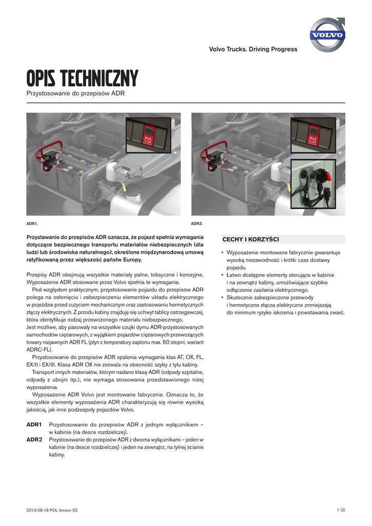 Volvo Trucks. Driving Progress OPIS TECHNICZNY Przystosowanie do przepisów ADR ADR1. ADR2. Przystawanie do przepisów ADR oznacza, że pojazd spełnia wymagania dotyczące bezpiecznego transportu materiałów niebezpiecznych (dla ludzi lub środowiska naturalnego), określone międzynarodową umową ratyfikowaną przez większość państw Europy. Przepisy ADR obejmują wszystkie materiały palne, toksyczne i korozyjne. Wyposażenie ADR stosowane przez Volvo spełnia te wymagania. Pod względem praktycznym, przystosowanie pojazdu do przepisów ADR polega na osłonięciu i zabezpieczeniu elementów układu elektrycznego w pojeździe przed zużyciem mechanicznym oraz zastosowaniu hermetycznych złączy elektrycznych. Z przodu kabiny znajduję się uchwyt tablicy ostrzegawczej, która identyfikuje rodzaj przewożonego materiału niebezpiecznego. Jest możliwe, aby pasowały na wszystkie czujki dymu ADR-przystosowanych samochodów ciężarowych, z wyjątkiem pojazdów ciężarowych przewożących towary niejawnych ADR FL (płyn z temperatury zapłonu max. 60 stopni, wariant ADRC-FL). Przystosowanie do przepisów ADR spalenia wymagania klas AT, OX, FL, EX/II i EX/III. Klasa ADR OX nie zezwala na obecność szyby z tyłu kabiny. Transport innych materiałów, którym nadano klasę ADR (odpady szpitalne, odpady z ubojni itp.), nie wymaga stosowania przedstawionego niżej wyposażenia. Wyposażenie ADR Volvo jest montowane fabrycznie. Oznacza to, że wszystkie elementy wyposażenia ADR charakteryzują się równie wysoką jakością, jak inne podzespoły pojazdów Volvo. CECHY I KORZYŚCI • Wyposażenie montowane fabrycznie gwarantuje wysoką niezawodność i krótki czas dostawy pojazdu. • Łatwo dostępne elementy sterujące w kabinie i na zewnątrz kabiny, umożliwiające szybkie odłączenie zasilania elektrycznego. • Skutecznie zabezpieczone przewody i hermetyczne złącza elektryczne zmniejszają do minimum ryzyko iskrzenia i powstawania zwarć. ADR1Przystosowanie do przepisów ADR z jednym wyłącznikiem – w kabinie (na desce rozdzielczej). ADR2Przystosowanie do przepisów ADR z dwoma wyłącznikami – jeden w kabinie (na desce rozdzielczej) i jeden na zewnątrz, na tylnej ścianie kabiny. 2013-08-16 POL Version 02 1 (2) OPIS TECHNICZNY Przystosowanie do przepisów ADR Łatwo dostępny wyłącznik awaryjny Uchwyt tablicy ostrzegawczej z przodu kabiny W celu umożliwienia kierowcy szybkiego odłączenia zasilania elektrycznego w razie wypadku, w dogodnym miejscu na desce rozdzielczej (wariant ADR1) umieszczono wyłącznik główny. Jest to wyłącznik awaryjny dwustopniowy, którego budowa uniemożliwia przypadkowe odłączenie zasilania. Oprócz wyłącznika w kabinie, pojazd może być wyposażony w podobny wyłącznik zewnętrzny, zamontowany na tylnej ścianie kabiny po stronie pasażera (wariant ADR2). Wyłączniki ADR1 i ADR2 odłączają tylko biegun dodatni. Obydwa wyłączniki są wyraźnie oznakowane. Wyłącznik główny może być sterowany regulatorem (przekaźnikiem) czasowym, aktywowanym za pomocą pilota zdalnego sterowania w kluczyku. Nastawę regulatora czasowe można zmieniać w stacji obsługi Volvo. Przewóz większości substancji objętych klasyfikacją ADR wiąże się z koniecznością umieszczenia na pojeździe specjalnych odblaskowych tablic ostrzegawczych w kolorze pomarańczowym. Kabiny Volvo przystosowane do przepisów ADR są wyposażone w uchwyt do mocowania takiej tablicy (posiadający homologację WE). Uchwyt ten znajduje się z przodu kabiny. Skutecznie zabezpieczone przewody i hermetyczne złącza elektryczne Wszystkie przewody elektryczne w podwoziu, znajdujące się za kabiną są umieszczone w falistych rurach z tworzywa sztucznego, zapewniających wyjątkowo skuteczną ochronę przez wszystkimi rodzajami zużycia i wstrząsami. W ten sposób wyeliminowane zostaje ryzyko iskrzenia i powstawania zwarć z układzie elektrycznym. Skrzynka przyłączeniowa na tylnym zwisie podwozia, lampy obrysowe oraz lampy tylne są również hermetycznie zamknięte, tak że nie ma możliwości by elementy znajdujące się pod napięciem miały styczność z ulatniającym się gazem lub łatwopalnymi cieczami. Pojazdy, który specyfikacja obejmuje złącza przyczepy, są dostarczane z 15-stykowym złączem elektrycznym przyczepy, homologowanym zgodnie z przepisami ADR. Skrzynka akumulatorowa z elektronicznym modułem ADR W skrzynce akumulatorowej znajduje się specjalny elektroniczny moduł ADR, którego zadaniem jest przekazywanie sygnałów od każdego z wyłączników (znajdujących się wewnątrz i na zewnątrz kabiny) i tym samym odłączanie akumulatorów. Wszystkie złącza elektryczne są zabezpieczone osłonami z tworzywa sztucznego. Skrzynka akumulatorowa wyposażona jest także w otwory wentylacyjne, służące odprowadzaniu wybuchowych gazów, które mogą nagromadzić się wewnątrz skrzynki. 2013-08-16 POL Version 02 Gaśnica(e) obowiązkowym elementem wyposażenia ADR Pojazd przeznaczony do przewozu materiałów niebezpiecznych musi być wyposażony w jedną lub więcej przenośnych gaśnic o łącznej pojemności co najmniej 12 kg suchego proszku gaśniczego (lub równoważnej pojemności innego dozwolonego środka gaśniczego). Jedna z gaśnic musi mieć pojemność co najmniej 6 kg. Gaśnice nie należą do standardowego wyposażenia i należy je zamawiać odrębnie. Wyposażenie dodatkowe Niektóre z elementów bezpieczeństwa, takie jak np. kliny pod koła oraz kamizelki i trójkąty ostrzegawcze, można zamówić bezpośrednio w fabryce. Według przepisów obowiązujących od 1 stycznia 1999 r., wystarczającym wyposażeniem pojazdu są dwa trójkąty ostrzegawcze. Odpowiedzialność Powyższy przepis dotyczący gaśnic odnosi się do jazdy samochodem i dlatego jego spełnienie jest obowiązkiem użytkownika pojazdu.