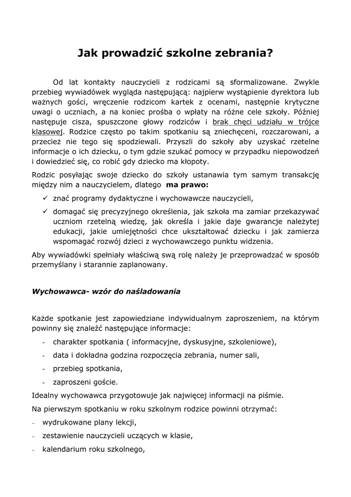 Jak prowadzić szkolne zebrania? Od lat kontakty nauczycieli z rodzicami są sformalizowane. Zwykle przebieg wywiadówek wygląda następującą: najpierw wystąpienie dyrektora lub ważnych gości, wręczenie rodzicom kartek z ocenami, następnie krytyczne uwagi o uczniach, a na koniec prośba o wpłaty na różne cele szkoły. Później następuje cisza, spuszczone głowy rodziców i brak chęci udziału w trójce klasowej. Rodzice często po takim spotkaniu są zniechęceni, rozczarowani, a przecież nie tego się spodziewali. Przyszli do szkoły aby uzyskać rzetelne informacje o ich dziecku, o tym gdzie szukać pomocy w przypadku niepowodzeń i dowiedzieć się, co robić gdy dziecko ma kłopoty. Rodzic posyłając swoje dziecko do szkoły ustanawia tym samym transakcję między nim a nauczycielem, dlatego ma prawo: znać programy dydaktyczne i wychowawcze nauczycieli, domagać się precyzyjnego określenia, jak szkoła ma zamiar przekazywać uczniom rzetelną wiedzę, jak określa i jakie daje gwarancje należytej edukacji, jakie umiejętności chce ukształtować dziecku i jak zamierza wspomagać rozwój dzieci z wychowawczego punktu widzenia. Aby wywiadówki spełniały właściwą swą rolę należy je przeprowadzać w sposób przemyślany i starannie zaplanowany. Wychowawca- wzór do naśladowania Każde spotkanie jest zapowiedziane indywidualnym zaproszeniem, na którym powinny się znaleźć następujące informacje: - charakter spotkania ( informacyjne, dyskusyjne, szkoleniowe), - data i dokładna godzina rozpoczęcia zebrania, numer sali, - przebieg spotkania, - zaproszeni goście. Idealny wychowawca przygotowuje jak najwięcej informacji na piśmie. Na pierwszym spotkaniu w roku szkolnym rodzice powinni otrzymać: − wydrukowane plany lekcji, − zestawienie nauczycieli uczących w klasie, − kalendarium roku szkolnego, − planowane imprezy szkolne i wycieczki. Tak przygotowane zebranie byłoby krótsze, a rodzice dokładniej wiedzieliby, po co wzywa się ich do szkoła. Na zebranie wychowawca może zapraszać także nauczycieli poszczególnych przedmiotów, zanim pojawią się konflikty, ponieważ rodzicom często brakuje informacji, kto dzieci uczy, czego i jakimi metodami. Aby rodzice nie wychodzili z zebrania z poczuciem straconego czasu należy pokazać im efekty pracy ich dziecka. Dlatego wychowawca powinien on rozłożyć prace uczniów do wglądu. Niedopuszczalne są sytuacje, kiedy rodzice proszą o wgląd w sprawdziany, a nauczyciele odmawiają. Na pierwszym spotkaniu warto ustalić zasady współpracy rodziców ze szkołą, formę kontaktów, sposoby komunikowania się. Niektóre problemy mogą być rozstrzygane telefonicznie lub korespondencyjnie. W ten sposób nauczyciel ochroni swój czas przed często zbytecznymi z rodzicami. Jednak w sprawach ważnych musi być on dostępny. Ważne szczegóły: Na pierwszym spotkaniu nauczyciel wita rodziców uśmiechem i wyciąga w geście na powitanie rękę. Rodziców wita w drzwiach wyznaczonego miejsca na zebranie. Wychowawca na zebranie przychodzi jako pierwszy, a nie ostatni. Kilkuminutowe spóźnienie doprowadza wielu rodziców do furii. Oznacza także brak szacunku, a to może być pierwszym sygnałem ostrzegawczym w nieprawidłowej drodze budowania wzajemnej sympatii i współpracy. Powinien być także pierwszy w klasie po to, aby przygotować odpowiednio pomieszczenie. Zwykle rodzice siadają w ławkach jak uczniowie, ale to nie sprzyja właściwej komunikacji między wychowawcą a rodzicami, gdyż ci, którzy siedzą w dalszej części klasy są poza zasięgiem wzroku lub widziane są tylko plecy- ci, którzy siedzą przed nimi. Dobrym sposobem na stworzenie właściwego układu jest ustawić krzesła lub stoliki w okrąg lub tzw. podkowę. Ważnym elementem powinna stać się rezygnacja z anonimowości rodziców. Nauczyciel może poprosić ich do noszenia identyfikatorów z imieniem i nazwiskiem i ewentualnie imieniem dziecka. Wychowawca taki sam identyfikator przygotowuje dla siebie. Można przed zebraniem poczęstować rodziców kawą, wodą mineralna, czy ciasteczkami. Jest to bardzo przyjemny gest, zwłaszcza, że dużo rodziców przychodzi na wywiadówki bezpośrednio po pracy. Zależy się również zająć okryciem wierzchnim rodziców. Często płaszcz zawieszony na ramieniu lub położony na ławce nie stwarza właściwej atmosfery, spoceni rodzice są zdenerwowani. Najważniejsze staje się także nieobwinianie rodziców za nieobecność innych- jest to kolejny absurd na drodze budowania dobrego kontaktu. Kiedy wszystkie te sprawy zostaną już zrealizowane należy przejść do przedstawienia i omówienia programu zebrania. Rodzice powinni dowiedzieć się, czym będzie mowa, ile zebranie będzie trwało, kiedy będą mogli zabierać głos w ważnych sprawach. Jak rozmawiać z rodzicami? Staraj się poznać rodziców. Będzie to czas dobrze zainwestowany, gdyż poznanie przyniesie korzyści dla obu stron. W przyszłości rodzice mogą okazać się najwartościowszymi współpracownikami. Rozmawiając z rodzicami, dąż do znalezienia wspólnej płaszczyzny- nie przemawiaj tonem mentorskim ani nie posługuj się żargonem nauczycielskim. Mówiąc o dziecku skup się na pozytywach. Pochwałami możesz więcej zdziałać niż wytykaniem wad. Wyjaśnij rodzicom, jak mogą się przyczynić do sukcesu dziecka. Pozwól się wypowiedzieć rodzicom- uważnie ich wysłuchaj. Poznaj warunki bytowe ucznia- jeśli jest to możliwe, złóż wizytę w jego domu. Umów się na następne spotkanie. Ważne jest stałe utrzymywanie kontaktu, co świadczy o zainteresowaniu rodziców dzieckiem. Zasady dobrego kontaktu: Pamiętaj o odpowiednim powitaniu i uśmiechu. Bądź punktualny. Przygotuj program i staraj się trzymać dyscyplinę czasową. Odpowiednio zaaranżuj przestrzeń Umożliw wzajemną identyfikację poznania się. Podziękuj za obecność. Ściągawka na zebranie Określ starannie i jasno cel zebrania. P