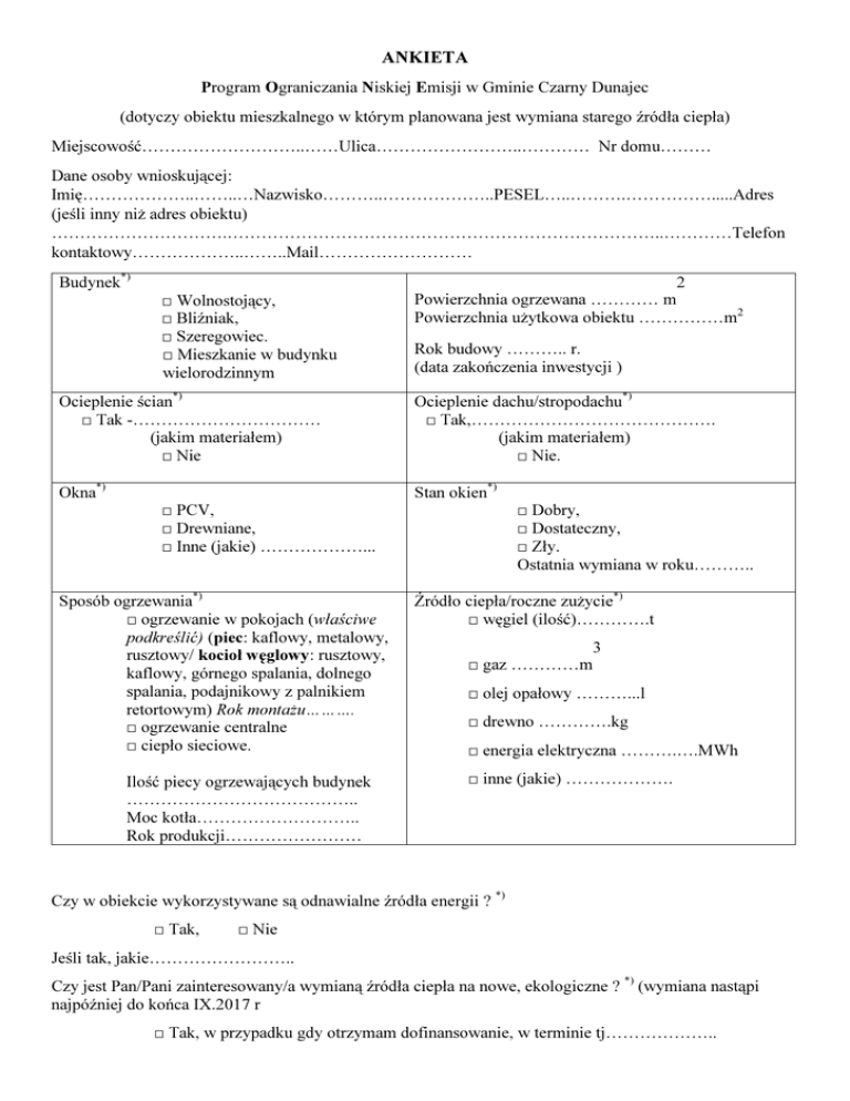 ANKIETA Program Ograniczania Niskiej Emisji w Gminie Czarny Dunajec (dotyczy obiektu mieszkalnego w którym planowana jest wymiana starego źródła ciepła) Miejscowość………………………..……Ulica……………………..………… Nr domu……… Dane osoby wnioskującej: Imię………………..……..…Nazwisko………..………………..PESEL…..……….…………….....Adres (jeśli inny niż adres obiektu) ………………………….…………………………………………………………………..…………Telefon kontaktowy………………..……..Mail……………………… Budynek*) □ Wolnostojący, □ Bliźniak, □ Szeregowiec. □ Mieszkanie w budynku wielorodzinnym 2 Powierzchnia ogrzewana ………… m Powierzchnia użytkowa obiektu ……………m2 Rok budowy ……….. r. (data zakończenia inwestycji ) Ocieplenie ścian*) □ Tak -…………………………… (jakim materiałem) □ Nie Ocieplenie dachu/stropodachu*) □ Tak,……………………………………. (jakim materiałem) □ Nie. Okna*) Stan okien*) □ PCV, □ Drewniane, □ Inne (jakie) ………………... Sposób ogrzewania*) □ ogrzewanie w pokojach (właściwe podkreślić) (piec: kaflowy, metalowy, rusztowy/ kocioł węglowy: rusztowy, kaflowy, górnego spalania, dolnego spalania, podajnikowy z palnikiem retortowym) Rok montażu………. □ ogrzewanie centralne □ ciepło sieciowe. Ilość piecy ogrzewających budynek ………………………………….. Moc kotła……………………….. Rok produkcji…………………… □ Dobry, □ Dostateczny, □ Zły. Ostatnia wymiana w roku……….. Źródło ciepła/roczne zużycie*) □ węgiel (ilość)………….t □ gaz …………m 3 □ olej opałowy ………...l □ drewno ………….kg □ energia elektryczna ……….….MWh □ inne (jakie) ………………. Czy w obiekcie wykorzystywane są odnawialne źródła energii ? *) □ Tak, □ Nie Jeśli tak, jakie…………………….. Czy jest Pan/Pani zainteresowany/a wymianą źródła ciepła na nowe, ekologiczne ? *) (wymiana nastąpi najpóźniej do końca IX.2017 r □ Tak, w przypadku gdy otrzymam dofinansowanie, w terminie tj……………….. □ Tak, także w przypadku nie otrzymania dofinansowania, w terminie tj………….. □ Nie. Na jakie nowe źródło ciepła i o jakiej mocy zostanie wymieniony stary piec: ……………………………………………………………………………………… *) wstawić X we właściwym miejscu Wyrażam zgodę na przetwarzanie moich danych osobowych zawartych w ankiecie dla potrzeb niezbędnych do realizacji procesu naboru (zgodnie z ustawą z dnia 29.08.1997 r. o ochronie danych osobowych (t. j. z 2002 r. Dz. U. Nr 101, poz. 926 z póź. zm.) Deklaruję swój udział w Programie Ograniczenia Niskiej Emisji Data ………………… Podpis……………….. Dane zamieszczone w ankiecie wykorzystane będą na potrzeby realizacji Programu Ograniczenia Niskiej Emisji zgodnie z Ustawą o Ochronie Danych Osobowych z dnia 29.08.1997 r. Dz.U.Nr 133,poz.883 z póź.zm. Dziękujemy za wypełnienie ankiety! Ważne informacje dotyczące zasad finansowania wymiany źródła ciepła w ramach PONE 1) Zadanie dotyczy tylko budynków mieszkalnych a osobą wnioskującą jest osoba fizyczna 2) Osoba wnioskująca musi posiadać uregulowany stan prawny do zgłaszanej nieruchomości - w przypadku umowy najmu/dzierżawy (min na 7 lat) również zgodę na przeprowadzenie prac związanych z wymianą źródła ciepła 3) W przypadku wymiany starego źródła ciepła zasilanego węglem lub biomasą na nowe zasilane tożsamym paliwem - dofinansowane zostaną wyłącznie kotły w klasie 5 wg normy PN-EN 3035:2012 (Uwaga- Kotły V generacji wyposażone w elektrofiltr nie są kwalifikowane) 4) Moc nowego źródła ciepła powinna być o min 20% mniejsza od starego 5) Koszty kwalifikowane obejmują w szczególności demontaż starego źródła ciepła, zakup i montaż nowego źródła ciepła. 6) Dofinansowanie wynosi 50% kosztów kwalifikowanych lecz nie więcej niż 650 zł/ kW mocy i ma formę refundacji poniesionych wydatków (wskaźnik „zł/kW” oblicza się w stosunku do mocy nowej kotłowni) – przykład – stary piec jest o mocy 20 kW – nowy powinien mieć 16 kW – a maksymalne dofinansowanie wyniesie 16 x 650 zł = 10400,00 przy całkowitej wartości pieca z usługą demontażu i montażu wynoszącą 20800,00zł 7) Kocioł z podajnikiem automatycznym, który posiada dodatkowy ruszt nie kwalifikuje się do dofinasowania w ramach Programu. 8) Dofinansowanie nowej kotłowni na węgiel lub biomasę będzie możliwe w przypadku braku technicznej możliwości podłączenia do sieci ciepłowniczej. 9) Instalator jest zobowiązany do podpisania oświadczenie o trwałym zdemontowaniu starego paleniska a mieszkaniec do przedstawienia kompletnej dokumentacji potwierdzającej wszelkie wymagane parametry nowego źródła ciepła wraz z dokumentami zakupowymi i szczegółowo opisaną fakturą zakupu. 10) Inwestycja musi być zakończona najpóźniej do końca IX.2017r. 11) W zmodernizowanym obiekcie nie mogą być podłączone inne dodatkowe urządzenia do ogrzewania domu tj. piece kaflowe, kominki z płaczem wodnym itp. Dodatkowe informacje: http://www.wfos.krakow.pl/aktualizacja-programu-pone