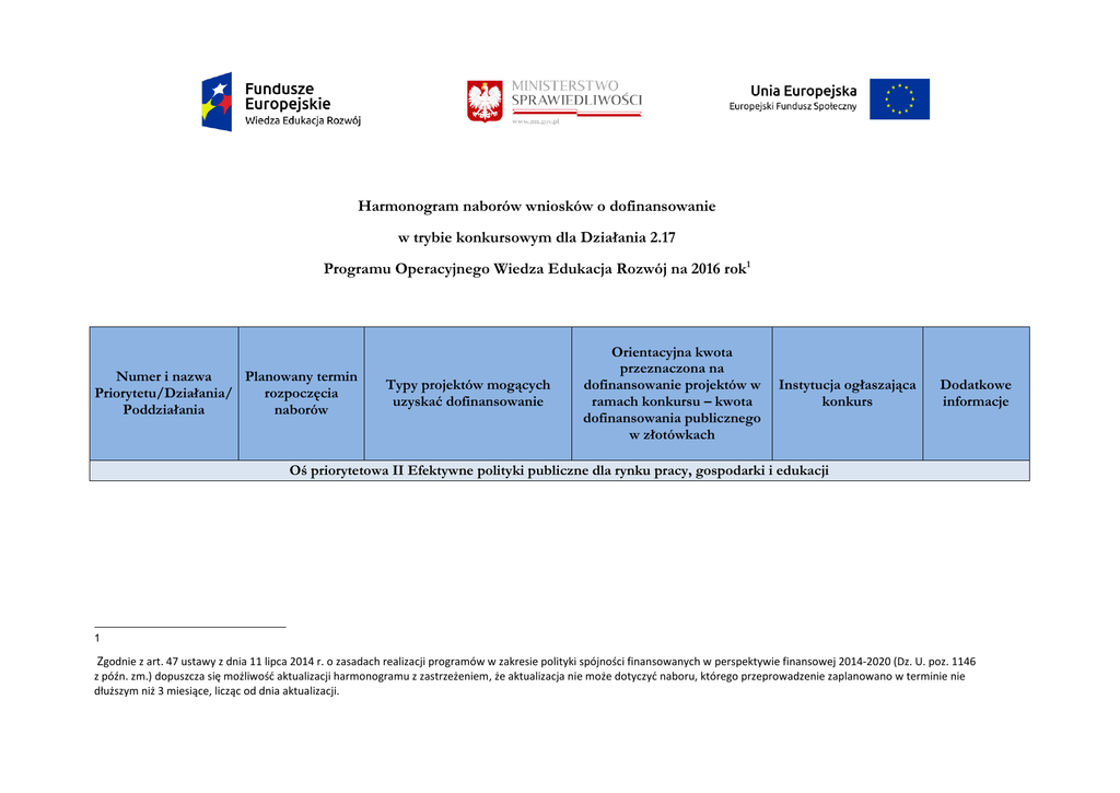Harmonogram naborów wniosków o dofinansowanie w trybie konkursowym dla Działania 2.17 Programu Operacyjnego Wiedza Edukacja Rozwój na 2016 rok1 Numer i nazwa Planowany termin Priorytetu/Działania/ rozpoczęcia Poddziałania naborów Typy projektów mogących uzyskać dofinansowanie Orientacyjna kwota przeznaczona na dofinansowanie projektów w ramach konkursu – kwota dofinansowania publicznego w złotówkach Instytucja ogłaszająca konkurs Dodatkowe informacje Oś priorytetowa II Efektywne polityki publiczne dla rynku pracy, gospodarki i edukacji 1 Zgodnie z art. 47 ustawy z dnia 11 lipca 2014 r. o zasadach realizacji programów w zakresie polityki spójności finansowanych w perspektywie finansowej 2014-2020 (Dz. U. poz. 1146 z późn. zm.) dopuszcza się możliwość aktualizacji harmonogramu z zastrzeżeniem, że aktualizacja nie może dotyczyć naboru, którego przeprowadzenie zaplanowano w terminie nie dłuższym niż 3 miesiące, licząc od dnia aktualizacji. Działanie 2.17 Skuteczny wymiar sprawiedliwości Działanie 2.17 Skuteczny wymiar sprawiedliwości Szkolenia oraz studia podyplomowe dla sędziów, urzędników i innych pracowników zatrudnionych w sądach powszechnych, prokuratorów, urzędników i innych pracowników powszechnych jednostek organizacyjnych prokuratury z rozpoczęcia naboru: zakresu prawa gospodarczego, czerwiec 2016 r. mediacji w sprawach gospodarczych, informatyki śledczej, ochrony konsumenta, zwalczania i zapobiegania przestępczości gospodarczej i skarbowej, prawa dotyczącego własności intelektualnej, prawa upadłościowego. Szkolenia oraz studia podyplomowe dla sędziów, urzędników i innych pracowników zatrudnionych w sądach powszechnych, prokuratorów, urzędników i innych pracowników rozpoczęcie naboru: powszechnych jednostek wrzesień 2016 r. organizacyjnych prokuratury z zakresu prawa gospodarczego, mediacji w sprawach gospodarczych, informatyki śledczej, ochrony konsumenta, zwalczania i zapobiegania Ministerstwo Sprawiedliwości 1 008 000 zł https://www.ms.gov.pl/ Ministerstwo 9 250 000 zł Sprawiedliwości https://www.ms.gov.pl/ przestępczości gospodarczej i skarbowej, prawa dotyczącego własności intelektualnej, prawa upadłościowego. Działanie 2.17 Skuteczny wymiar sprawiedliwości Szkolenia dla sędziów, urzędników i innych pracowników zatrudnionych w sądach powszechnych, prokuratorów, urzędników i innych pracowników powszechnych jednostek organizacyjnych prokuratury oraz rozpoczęcie naboru: Ministerstwa Sprawiedliwości marzec 2016 r. wspierające wdrażanie modeli zarządzania zasobami ludzkimi, finansami, informacją i komunikacją, świadczenie usług informatycznych, a także kontroli zarządczej oraz obsługi interesanta. Ministerstwo 6 000 000 zł Sprawiedliwości https://www.ms.gov.pl/