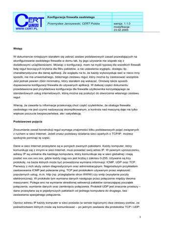 Konfiguracja firewalla osobistego Przemysław Jaroszewski, CERT Polska WWW.CERT.PL wersja: 1.1.0 modyfikacja: 23.02.2005 Wstęp W dokumencie niniejszym starałem się zebrać zestaw podstawowych zasad pozwalających na skonfigurowanie osobistego firewalla w domu tak, by jego używanie nie wiązało się z dodatkowymi uciążliwościami. Mówiąc o konfiguracji, mam na myśli typową dla wszelkich firewalli listę reguł tworzących kryteria dla filtru pakietów, a nie ustawienia wyglądu, dostępu itp. charakterystyczne dla danej aplikacji. Ze względu na to, że każdy wykorzystuje sieć w nieco inny sposób, nie ma uniwersalnego, żelaznego zestawu reguł, który można by zastosować wszędzie. Jest jednak pewien zbiór minimalny, który starałem się wskazać. Omówię także sposób dopasowania konfiguracji firewalla do używanych aplikacji. W dalszej części dokumentu przedstawiona jest przykładowa konfiguracja dla firewalla użytkownika korzystającego ze standardowych usług internetowych, którą można się posłużyć do stworzenia własnego zestawu reguł. Wierzę, że zawarte tu informacje przekonają choć część czytelników, że obsługa firewalla osobistego nie jest czymś nadzwyczaj skomplikowanym, a kontrola nad maszyną daje nie tylko większe poczucie bezpieczeństwa, ale i satysfakcję. Podstawowe pojęcia Zrozumienie zasad konstrukcji reguł wymaga znajomości kilku podstawowych pojęć związanych z ruchem w sieci Internet. Jeżeli znasz podstawy działania sieci opartych o TCP/IP, możesz spokojnie pominąć tę część. Dane w sieci Internet przesyłane są w porcjach zwanych pakietami. Każdy komputer, który komunikuje się z innymi w sieci Internet, musi posiadać swój adres IP. W pewnym uproszczeniu, adresy IP są unikalne dla każdego komputera, który komunikuje się w sieci globalnej i mają postać xxx.xxx.xxx.xxx, gdzie każdy ciąg xxx jest liczbą z zakresu 0-255. Używane są trzy protokoły, na bazie których może być prowadzona wymiana informacji: ICMP, UDP oraz TCP. Pierwszy z nich służy celom diagnostycznym oraz administracyjnym. Najprostszym przykładem zastosowania ICMP jest polecenie ping. TCP jest protokołem używanym przez większość popularnych usług, m.in. http (np. przeglądanie stron WWW) czy smtp (wysyłanie poczty elektronicznej). W protokole tym wymiana danych następuje przez połączenie między dwoma maszynami. Polega ono na wymianie określonej sekwencji pakietów oznaczającej początek połączenia, wymianie danych oraz zamknięciu połączenia. Protokół UDP jest znacznie prostszy – dane przesyłane są w pojedynczych pakietach od jednego komputera do drugiego, bez zestawiania specjalnego połączenia. Oprócz adresu IP każdy komputer w sieci posiada (w sensie logicznym) dwa zestawy portów, za pośrednictwem których może się komunikować – po jednym zestawie dla protokołów TCP i UDP. 1 Porty w każdym z zestawów są ponumerowane od 1 do 65535. Tak więc port 135 TCP i 135 UDP to dwa różne porty. Większość typowych usług ma przypisane standardowe numery portów, z których korzysta się do komunikacji z nimi. Jest to znaczne ułatwienie (również w konfiguracji firewalla), ale nie wymóg. Na przykład, usłudze http przypisany jest standardowo port 80 TCP. Jeżeli komputer oferuje daną usługę, na przykład udostępnia strony WWW, aplikacja obsługująca ją otwiera odpowiedni port. Taki komputer nazywamy serwerem danej usługi. Komputer, który chce uzyskać dostęp do usługi (klient), otwiera jeden ze swoich portów i wysyła z niego pakiety pod adres IP serwera na port tej usługi. Pakiet można więc opisać zestawem dwóch adresów IP (klienta i serwera) oraz dwóch numerów portów (źródłowego i docelowego). W przypadku protokołu UDP ewentualne odpowiedzi mogą być kierowane na ten sam lub inny port klienta. W protokole TCP całe połączenie odbywa się w ramach tych samych portów1. W przypadku protokołu ICMP nie mówimy o portach, lecz o różnych komunikatach - w zależności od tego, jaką informację niesie. Działanie firewalla polega na filtrowaniu pakietów (dla UDP i ICMP) oraz połączeń według zadanych kryteriów (tzw. reguł) opartych przede wszystkim o adresy IP oraz porty. Pozwala to na uchronienie się przed niepowołanym dostępem do usług udostępnianych przez nas lub przez nasz system a także daje kontrolę nad połączeniami nawiązywanymi przez programy. Konstruowanie reguł Podstawową zasadą, którą należy mieć na uwadze przy konstruowaniu zbioru reguł dla firewalla, jest to, że są one analizowane przez niego w kolejności umieszczenia ich na liście. Pierwsza reguła, do której zostanie dopasowany analizowany pakiet, będzie wykonana bez względu na to, jakie reguły następowały po niej. Kolejne reguły zostaną całkowicie zignorowane. W szczególności, umieszczenie na początku listy reguły pasującej do wszystkich pakietów oznaczałoby, w zależności od zdefiniowanej akcji, efektywne wyłączenie filtrowania lub blokowanie wszystkich pakietów. Stąd prosty wniosek, że umieszczanie reguł na liście powinno odbywać się według ich szczegółowości – im bardziej ogólna reguła, tym niżej na liście. Reguły podstawowe Poniżej przedstawione są typowe reguły, mające zazwyczaj zastosowanie przy najpopularniejszych formach korzystania z Internetu w domu (np. poczta, WWW). Konieczność zastosowania niektórych z nich może być dyskutowana w przypadku konkretnych użytkowników. Na przykład, reguła filtrująca ruch NetBIOS uniemożliwi udostępnianie plików i drukarek w sieci lokalnej. Jeżeli wykorzystujemy tę funkcjonalność, powinniśmy odblokować ruch NetBIOS do wybranych adresów. Oczywiście, taka reguła, jako bardziej szczegółowa, powinna znaleźć się przed regułą blokującą dostęp dla pozostałych adresów. Pozwalamy na odpytywanie serwerów DNS. Protokół: Kierunek: Porty lokalne: Aplikacja: Adres: UDP I