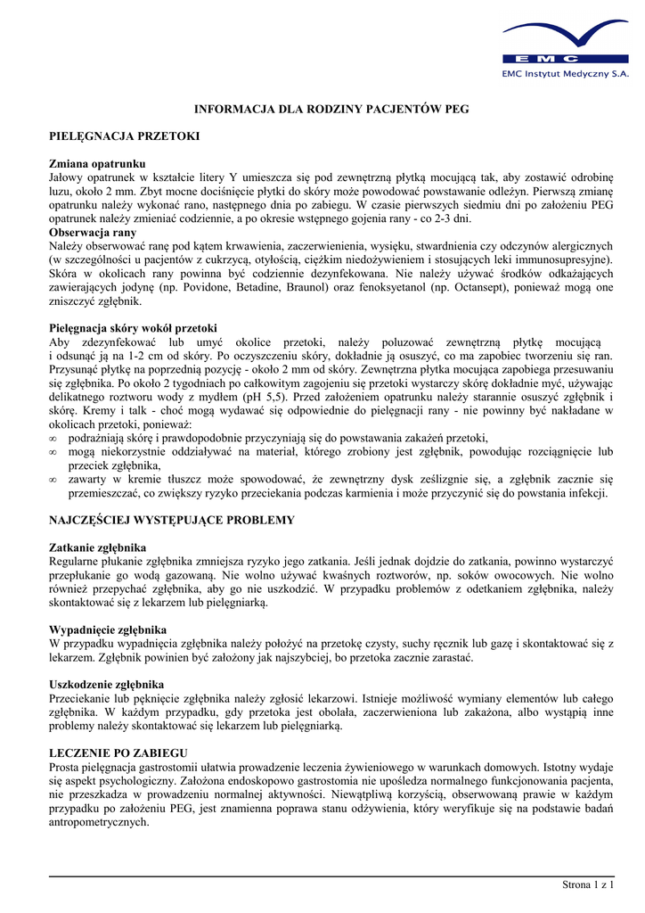 INFORMACJA DLA RODZINY PACJENTÓW PEG PIELĘGNACJA PRZETOKI Zmiana opatrunku Jałowy opatrunek w kształcie litery Y umieszcza się pod zewnętrzną płytką mocującą tak, aby zostawić odrobinę luzu, około 2 mm. Zbyt mocne dociśnięcie płytki do skóry może powodować powstawanie odleżyn. Pierwszą zmianę opatrunku należy wykonać rano, następnego dnia po zabiegu. W czasie pierwszych siedmiu dni po założeniu PEG opatrunek należy zmieniać codziennie, a po okresie wstępnego gojenia rany - co 2-3 dni. Obserwacja rany Należy obserwować ranę pod kątem krwawienia, zaczerwienienia, wysięku, stwardnienia czy odczynów alergicznych (w szczególności u pacjentów z cukrzycą, otyłością, ciężkim niedożywieniem i stosujących leki immunosupresyjne). Skóra w okolicach rany powinna być codziennie dezynfekowana. Nie należy używać środków odkażających zawierających jodynę (np. Povidone, Betadine, Braunol) oraz fenoksyetanol (np. Octansept), ponieważ mogą one zniszczyć zgłębnik. Pielęgnacja skóry wokół przetoki Aby zdezynfekować lub umyć okolice przetoki, należy poluzować zewnętrzną płytkę mocującą i odsunąć ją na 1-2 cm od skóry. Po oczyszczeniu skóry, dokładnie ją osuszyć, co ma zapobiec tworzeniu się ran. Przysunąć płytkę na poprzednią pozycję - około 2 mm od skóry. Zewnętrzna płytka mocująca zapobiega przesuwaniu się zgłębnika. Po około 2 tygodniach po całkowitym zagojeniu się przetoki wystarczy skórę dokładnie myć, używając delikatnego roztworu wody z mydłem (pH 5,5). Przed założeniem opatrunku należy starannie osuszyć zgłębnik i skórę. Kremy i talk - choć mogą wydawać się odpowiednie do pielęgnacji rany - nie powinny być nakładane w okolicach przetoki, ponieważ: • podrażniają skórę i prawdopodobnie przyczyniają się do powstawania zakażeń przetoki, • mogą niekorzystnie oddziaływać na materiał, którego zrobiony jest zgłębnik, powodując rozciągnięcie lub przeciek zgłębnika, • zawarty w kremie tłuszcz może spowodować, że zewnętrzny dysk ześlizgnie się, a zgłębnik zacznie się przemieszczać, co zwiększy ryzyko przeciekania podczas karmienia i może przyczynić się do powstania infekcji. NAJCZĘŚCIEJ WYSTĘPUJĄCE PROBLEMY Zatkanie zgłębnika Regularne płukanie zgłębnika zmniejsza ryzyko jego zatkania. Jeśli jednak dojdzie do zatkania, powinno wystarczyć przepłukanie go wodą gazowaną. Nie wolno używać kwaśnych roztworów, np. soków owocowych. Nie wolno również przepychać zgłębnika, aby go nie uszkodzić. W przypadku problemów z odetkaniem zgłębnika, należy skontaktować się z lekarzem lub pielęgniarką. Wypadnięcie zgłębnika W przypadku wypadnięcia zgłębnika należy położyć na przetokę czysty, suchy ręcznik lub gazę i skontaktować się z lekarzem. Zgłębnik powinien być założony jak najszybciej, bo przetoka zacznie zarastać. Uszkodzenie zgłębnika Przeciekanie lub pęknięcie zgłębnika należy zgłosić lekarzowi. Istnieje możliwość wymiany elementów lub całego zgłębnika. W każdym przypadku, gdy przetoka jest obolała, zaczerwieniona lub zakażona, albo wystąpią inne problemy należy skontaktować się lekarzem lub pielęgniarką. LECZENIE PO ZABIEGU Prosta pielęgnacja gastrostomii ułatwia prowadzenie leczenia żywieniowego w warunkach domowych. Istotny wydaje się aspekt psychologiczny. Założona endoskopowo gastrostomia nie upośledza normalnego funkcjonowania pacjenta, nie przeszkadza w prowadzeniu normalnej aktywności. Niewątpliwą korzyścią, obserwowaną prawie w każdym przypadku po założeniu PEG, jest znamienna poprawa stanu odżywienia, który weryfikuje się na podstawie badań antropometrycznych. Strona 1 z 1