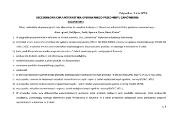 Załącznik nr 5 A do SIWZ SZCZEGÓŁOWA CHARAKTERYSTYKA OFEROWANEGO PRZEDMIOTU ZAMÓWIENIA ZADANIE NR 5 Zakup materiałów eksploatacyjnych oraz akcesoriów do urządzeń drukujących dla potrzeb jednostek Policji garnizonu mazowieckiego – dla urządzeń „Dell,Epson, Evolis, Kyocera, Xerox, Ricoh, Konica” 1. W przypadku proponowania w kolumnie nr 5 tabeli produktu jako „zamiennika” Wykonawca dostarczy dokumenty: a) Certyfikat wraz z numerem certyfikacji dla systemu zarządzania jakością (PN-EN ISO 9001:2009) i systemu zarządzania środowiskowego (PN-EN ISO 14001:2005) w zakresie wytwarzania materiałów eksploatacyjnych, dla producenta produktu wskazanego w kolumnie nr 5 tabeli. b) kartę produktu producenta wskazanego w kolumnie nr 5 tabeli, zawierającą min. następujące informacje: • producenta drukarki, do której jest oferowany produkt kompatybilny, • modele lub nazwy urządzeń z jakimi produkt jest kompatybilny, • oznaczenie produktu kompatybilnego, jego kod, • wydajność, • że proces produkcyjny wymienionego produktu przebiega ściśle według określonych procedur PL-EN ISO 9001:2009 oraz PL-EN ISO 14001:2005, c) w przypadku tonerów do laserowych urządzeń monochromatycznych - raport z badań wydajnościowych zgodnie z normą ISO/IEC 19752, d) w przypadku tonerów do kolorowych urządzeń laserowych - raport z badań wydajnościowych zgodnie z normą ISO/IEC 19798, e) w przypadku wkładów atramentowych - raport z badań wydajnościowych zgodnie z normą ISO/IEC 24711, 2. W przypadku braku w/w dokumentów potwierdzających spełnianie przez produkty zastępcze cech produktu polecanego przez producenta urządzenia, Zamawiający wymaga oferowania przez Wykonawcę w kolumnie nr 5 tabeli produktów polecanych przez producenta urządzeń wymienionych w kolumnie nr 1 tabeli. 1/5 3. Jeżeli w kolumnie nr 5 tabeli Wykonawca oferuje produkt polecany przez producenta urządzeń wymienionych w kolumnie nr 1 tabeli, wtedy Wykonawca wypełnia tylko kolumnę nr 5 tabeli, a pozostałe niewypełnione pola w wierszu produktu oznacza jako „xxx”. 4. Każdy dokument wymieniony w ust. 1 i dołączony do oferty powinien zostać oznaczony przez Wykonawcę odpowiednim numerem porządkowym, a nr porządkowy wpisany do poniższej tabeli. 5. Obowiązek wykazania, że oferowany przedmiot zamówienia spełnia wymagania Zamawiającego, leży po stronie Wykonawcy. 6. Pola w poniższej tabeli oznaczone jako „xxx” nie wymagają wpisywania żadnych danych. Dla tych pól Zamawiający nie wymaga dostarczania żadnych dokumentów. Typ urządzenia Lp 1 symbol mat. ekspl. Rodzaj materiału polecanego eksploatacyjnego przez producenta urządzenia 2 3 Wydajność /liczba stron/ ** oznaczenie oferowanego materiału /producent i symbol/ * Nr strony w ofercie dotyczący karty produktu Nr strony w ofercie zawierający raport badań zgodnie z ISO/IEC 19752 Nr strony w ofercie zawierający raport badań zgodnie z ISO/IEC 19798 Nr strony w ofercie zawierający raport badań zgodnie z ISO/IEC 24711 4 5 6 7 8 9 xxx xxx producent 1 Dell 1710n toner 593-10042 6000 symbol producent 2 Epson Stylus SX115 tusz cyan C13T07124010 5,5 ml symbol xxx xxx 2/5 1 2 3 4 5 6 7 8 9 xxx xxx xxx xxx xxx xxx xxx xxx xxx xxx xxx xxx producent 3 Epson Stylus SX115 tusz magenta C13T07134010 5,5 ml symbol producent 4 Epson Stylus SX115 tusz yellow C13T07144010 5,5 ml symbol producent 5 Epson Stylus SX115 tusz czarny C13T07114010 7,4 ml symbol producent 6 EvolisPebble 3 taśma barwiąca YMCKO R3011 200 symbol producent 7 EvolisPebble 3 taśma barwiąca YMCKO R3411 100 symbol 3/5 1 2 3 4 5 6 7 8 9 xxx xxx xxx xxx xxx xxx xxx xxx xxx xxx xxx xxx xxx producent 8 EvolisPebble 3 taśma barwiąca Czarna R2011 1000 symbol producent 9 Kyocera FS1030d Bęben PU-120 100000 symbol producent 10 Kyocera FS1030d Zespół nagrzewnicy (fuser unit) FK-101E symbol xxx producent 11 Kyocera FS1030d Toner TK-120 7200 symbol producent 12 Xerox Phaser 3020 Toner 106R02773 1500 symbol 4/5 1 2 3 4 5 6 7 8 9 xxx xxx xxx xxx xxx xxx producent 13 Ricoh 3310 toner 1260 5000 Symbol producent 14 Ricoh 3320 toner 1260 5000 symbol producent 15 Konica MinoltaMagicolor 1680MF toner czarny A0V301H 2500 symbol ** Minimalna liczba stron wydruku A4 przy 5% pokryciu. ………………………………..………………………………… (podpis i pieczęć osoby upowaŜnionej do reprezentowania Wykonawcy) *) pod pojęciem polecanego przez producenta urządzenia materiału eksploatacyjnego rozumie się towar, którego producent wskazany jest w kolumnie 1 oraz posiadający symbol polecanego produktu materiału eksploatacyjnego z kolumny 3; 5/5