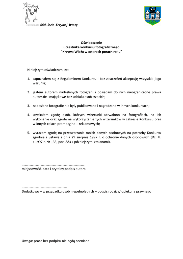 Oświadczenie uczestnika konkursu fotograficznego "Krzywa Wieża