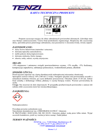 KARTA TECHNICZNA PRODUKTU LEDER CLEAN SYMBOL pH F-10 13 Preparat czyszcząco-myjący do silnie zabrudzonych powierzchni skórzanych. Likwiduje stare oraz bieżące zanieczyszczenia. Usuwa brud pochodzenia organicznego. Bezpieczny dla czyszczonej skóry, spowalnia proces ponownego zabrudzenia, oraz pozostawia w otoczeniu trwały, świeży zapach. ZASTOSOWANIE: skóry licowe lakierowane (naturalne i sztuczne); skórzana tapicerka samochodowa; meble pokryte skórą (tapicerowane); skórzane siedzenia, fotele, kanapy; obuwie, torby, odzież, wyroby artystyczne. SKŁAD: <5% niejonowe i anionowe związki powierzchniowo czynne, <5% mydło, <5% fosforany, kompozycja zapachowa, substancje pomocnicze, wodorotlenek potasu, alkohole SPOSÓB UŻYCIA: Przed użyciem zapoznać się z kartą charakterystyki niebezpiecznej mieszaniny chemicznej. Sporządzić roztwór roboczy 10% (100 ml/1 l wody). Następnie spryskać nim powierzchnię szczotki z naturalnym końskim włosiem, po czym delikatnie przeszorować. Odczekać około 15-20 sek. Zebrać brud szmatką z delikatnego włókna, płukaną w czystej bieżącej wodzie. Wytrzeć powierzchnię do sucha. Uwaga: Nie stosować do skór olejowanych. W przypadku przebarwionych powierzchni z zamszu lub nubuku efekt czyszczenia może być niesatysfakcjonujący. ZAGROŻENIA: Niebezpieczeństwo Powoduje poważne uszkodzenie oczu Natychmiast skontaktować się z OŚRODKIEM ZATRUĆ / lekarzem W PRZYPADKU DOSTANIA SIĘ DO OCZU: Ostrożnie płukać wodą przez kilka minut. Wyjąć soczewki kontaktowe, jeżeli są i można je łatwo usunąć. Nadal płukać TERMIN WAŻNOŚCI: TENZI Sp. z o.o., 72-002 Dołuje, Skarbimierzyce 20 tel. (091) 311 97 77, fax: (091)311 97 79 e-mail: [email protected], www.tenzi.pl Strona 1 z 2 KARTA TECHNICZNA PRODUKTU 36 miesięcy od daty produkcji. Data produkcji/seria oraz data ważności podana na opakowaniu. DODATKOWE INFORMACJE: Dodatkowe informacje dostępne w karcie charakterystyki niebezpiecznej mieszaniny chemicznej. Zanieczyszczone opakowanie należy całkowicie opróżnić. Puste opakowania wypłukać kilkakrotnie wodą, którą zużyć tak jak preparat. Puste opakowanie można składować w pojemnikach przeznaczonych do zbiórki opakowań z tworzyw sztucznych lub przekazać wyspecjalizowanej firmie do utylizacji. Przestrzegać przepisów Ustawy z dnia 13 czerwca 2013 r. o gospodarce opakowaniami i odpadami opakowaniowymi (Dz. U. 2013, poz. 888). TENZI Sp. z o.o., 72-002 Dołuje, Skarbimierzyce 20 tel. (091) 311 97 77, fax: (091)311 97 79 e-mail: [email protected], www.tenzi.pl Strona 2 z 2