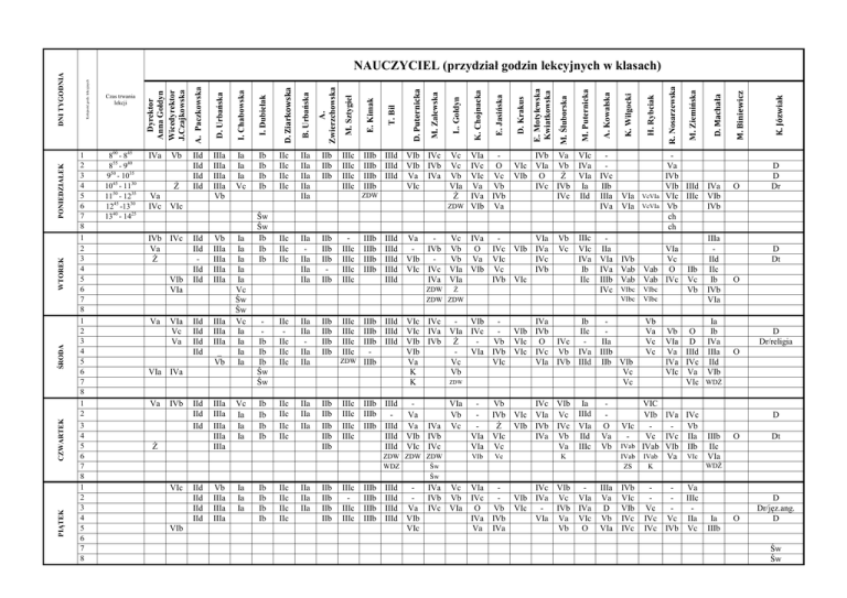 PIĄTEK CZWARTEK ŚRODA 3 4 5 6 7 8 1 2 3 4 5 6 7 8 VIb VIa VIa Va IIa IIa IIa IIa IIa IIId IIId IIId VIb IVc VIb IVb Va IVa VIc ZDW VIa Vc Va IId IId IId IId IId IId IId IId Vb IIIa IIIa IIIa IIIa IIIa IIIa IIIa _ Vb Ia Ia Ia Ia Ia Vc Św Św Vc Ia Ia Ia Ia IVa IVb IId IId IId Ż IIIa IIIa IIIa IIIa IIIa Vc Ia Ia Ia Św Św Ib Ib Ib IIc IIc IIc IIa IIa IIa IIa IIb IIb IIb IIb IIIc IIIc IIIc IIIc IIIb IIIb IIIb IIIb IIId IIId IIId IIId IIId Va IVb VIb VIc IVc IVa VIb IId IId IId IId Vb IIIa IIIa IIIa Ia Ia Ia Vc IVa VIa Vb O IVc VIb IVa Vb Va VIc IVc VIa VIb Vc IVb VIa IVb VIc Vb Vc ZDW Ż ZDW ZDW Ib Ib Ib Św Św IIc IIc IIc IIc Ib Ib Ib Ib IIc IIc IIc IIc IIa IIa IIa IIa IIa IIa IIa IIb IIb IIb IIb IIb IIb IIb IIb IIb IIIc IIIc IIIc IIIc IIIb IIIb IIIb ZDW IIIb IIIc IIIc IIIc IIIc IIIb IIIb IIIb IIId IIId IIId IIId IIId IIId IIId VIc IVc VIc IVa VIb IVb VIb Va K K Va Va IVa VIb IVb VIc IVc VIb IVa Ib VIa IVc VIb IVb IIc Ż Vb VIc O IVc VIa IVb VIc IVc Vb IVa Vc VIc VIa IVb IIId Vb ZDW VIa Vb Vc Ib Ib Ib Ib IIc IIc IIc IIc IIa IIa IIa IIb IIb IIb IIb IIIc IIIc IIIc IIIb IIIb IIIb IIIb IIId IIId IIId IIId IVa IVb Va IVc VIb VIc Vb IVc VIb Ia IVb VIc VIa Vc IIId Ż VIb IVb IVc VIa VIa VIc IVa Vb IId VIa Vc Va IIIc VIb Vc K VIa VIa VIa IVc IVc VIb IVa O Vb VIc IVa IVb VIa Va IVa VIb Vc VIa IVb IVa Va VIc Vb O VcVIa VcVIa IVb Vab Vab VIbc VIbc VIbc VIbc IIa IIIb IIb VIb Vc Vc Vb Va Vc Vc O Va Vb IIb Vc Vb IVa VIb IVb IIIa IId IIc Ib IVb VIa Ia Vb O Ib VIa D IVa Va IIId IIIa IVa IVc IId VIc Va VIb VIc WDŻ VIC VIb IVa IVc VIc Vb Vc IVc IIa IVab IVab VIb IIb IVab IVab Va VIc IIIa IVb Va VIc D VIb Vb IVc VIa IVc K Va IIIc Vc IVc Vc IIa IVc IVb Vc O K. Józwiak M. Biniewicz D. Machała M. Ziemińska R. Nosarzewska Va IVb VIb IIId VIc IIIc Vb ch ch VIa Vc Vab O Vab IVc ZS Vc Vb VIa H. Rybciak K. Wilgocki M. Śluborska Vc Vc Vb VIa Ż ZDW ZDW ZDW WDZ Św Św VIc E. Motylewska Kwiatkowska IIa VIa IVa IIIb IVc D. Krakus IIIc VIc IVa Ib IIc E. Jasińska IVc IIb IIIa IVa K. Chojnacka VIa IVb Va VIc IVc O VIc VIa Vb IVa VIc Vc VIb O Ż VIa Va Vb IVc IVb Ia IVa IVb IVc IId ZDW VIb Va L. Gołdyn M. Zalewska IIIb IIIb IIIb IIIb D. Puternicka IIIc IIIc IIIc IIIc T. Bil A. Zwierzchowska IIb IIb IIb E. Kimak IIc IIc IIc IIc B. Urbańska D. Ziarkowska Ib Ib Ib Ib VIc IVb IVc Va Ż Va Ia Ia Ia Vc A. Kowalska Va IVc IIIa IIIa IIIa IIIa Vb M. Sztygiel Ż I. Dubielak IId IId IId IId Vb I. Chabowska IVa D. Urbańska A. Paczkowska 800 - 845 855 - 940 950 - 1035 1045 - 1130 1150 - 1235 1245 -1330 1340 - 1425 Dyrektor Anna Gołdyn Wicedyrektor J.Czajkowska Kolejność godz. lekcyjnych 1 2 3 4 5 6 7 8 1 2 3 4 5 6 7 8 1 2 3 4 5 6 7 8 1 2 Czas trwania lekcji M. Puternicka WTOREK PONIEDZIAŁEK DNI TYGODNIA NAUCZYCIEL (przydział godzin lekcyjnych w klasach) D D Dr D Dt O D Dr/religia O D IIIb IIc VIa O Dt O D Dr/jęz.ang. D WDŻ Ia IIIb Św Św