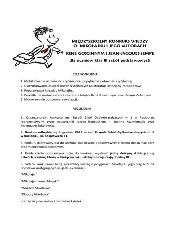 MIĘDZYSZKOLNY KONKURS WIEDZY O MIKOŁAJKU I JEGO AUTORACH RENE GOSCINNYM I JEAN-JACQUES SEMPE dla uczniów klas III szkół podstawowych CELE KONKURSU: 1. Mobilizowanie uczniów do czytania oraz pogłębianie ciekawości czytelniczej. 2. Ukierunkowanie zainteresowań czytelniczych na literaturę dziecięcą i młodzieżową. 3. Popularyzacja książek o Mikołajku. 4. Przybliżenie postaci autora i ilustratora książek René Goscinnego i Jean-Jacques'a Sempé. 5. Motywowanie do zdrowej rywalizacji. REGULAMIN 1. Organizatorem konkursu jest Zespół Szkół Ogólnokształcących nr 1 w Raciborzu reprezentowany przez nauczycielki języka francuskiego – Joannę Kazimierczak oraz Małgorzatę Sokołowską. 2. Konkurs odbędzie się 1 grudnia 2016 w auli Zespołu Szkół Ogólnokształcących nr 1 w Raciborzu, ul. Kasprowicza 11. 3. Konkurs skierowany jest do uczniów klas III szkół podstawowych z terenu miasta Racibórz oraz miejscowości ościennych. 4. Każda szkoła podstawowa może do konkursu wystawić jedną drużynę składającą się z dwóch uczniów, którzy w bieżącym roku szkolnym uczęszczają do klasy III. 5. Zadania konkursowe będą sprawdzały wiedzę o przygodach Mikołajka i jego przyjaciół na podstawie następujących książek i ekranizacji: "Mikołajek" "Mikołajek i inne chłopaki" "Wakacje Mikołajka" "Kłopoty Mikołajka" oraz życiorysów autora i ilustratora książek. 6. Każda drużyna będzie odpowiadała pisemnie i ustnie na pytania. 7. Zwycięzcami konkursu zostaną trzy kolejne drużyny, które uzyskają największą ilość punktów z wszystkich konkurencji. 8. Dla zwycięskich drużyn przewidziano nagrody rzeczowe oraz dyplomy. 9. Zgłoszenia prosimy przesyłać pocztą elektroniczną na adres: [email protected] do 21.11.2016 r. Tu można także uzyskać wszelkie dodatkowe informacje. Zgłoszenie powinno zawierać: imiona i nazwiska uczestników, nazwę i adres szkoły, którą reprezentują, klasę, imię i nazwisko opiekuna oraz jego telefon i/lub adres mailowy do kontaktu. ZAPRASZAMY DO UDZIAŁU