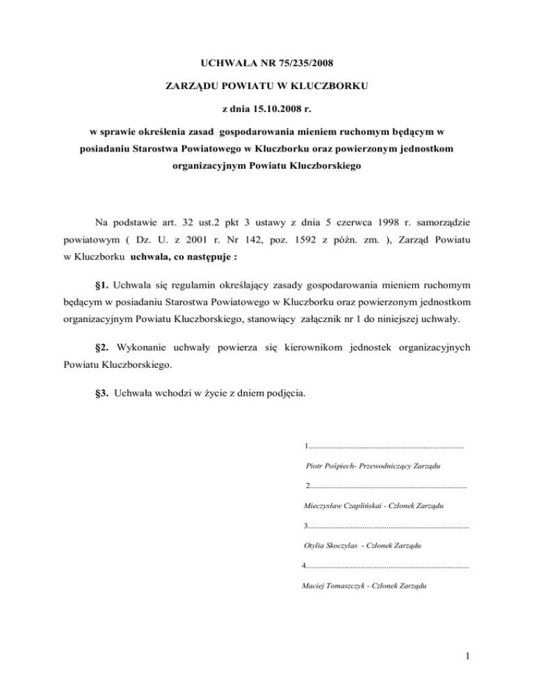 UCHWAŁA NR 75/235/2008 ZARZĄDU POWIATU W KLUCZBORKU z dnia 15.10.2008 r. w sprawie określenia zasad gospodarowania mieniem ruchomym będącym w posiadaniu Starostwa Powiatowego w Kluczborku oraz powierzonym jednostkom organizacyjnym Powiatu Kluczborskiego Na podstawie art. 32 ust.2 pkt 3 ustawy z dnia 5 czerwca 1998 r. samorządzie powiatowym ( Dz. U. z 2001 r. Nr 142, poz. 1592 z późn. zm. ), Zarząd Powiatu w Kluczborku uchwala, co następuje : §1. Uchwala się regulamin określający zasady gospodarowania mieniem ruchomym będącym w posiadaniu Starostwa Powiatowego w Kluczborku oraz powierzonym jednostkom organizacyjnym Powiatu Kluczborskiego, stanowiący załącznik nr 1 do niniejszej uchwały. §2. Wykonanie uchwały powierza się kierownikom jednostek organizacyjnych Powiatu Kluczborskiego. §3. Uchwała wchodzi w życie z dniem podjęcia. 1............................................................................. Piotr Pośpiech- Przewodniczący Zarządu 2.............................................................................. Mieczysław Czaplińskai - Członek Zarządu 3................................................................................ Otylia Skoczylas - Członek Zarządu 4................................................................................. Maciej Tomaszczyk - Członek Zarządu 1 Załącznik do uchwały Nr 75/235/2008 Zarządu Powiatu w Kluczborku z dnia 15.10.2008 r. Regulamin określający zasady gospodarowania mieniem ruchomym będącym w posiadaniu Starostwa Powiatowego w Kluczborku oraz powierzonym jednostkom organizacyjnym Powiatu Kluczborskiego. § 1. 1. Kierownik jednostki organizacyjnej Powiatu Kluczborskiego, w przypadku stwierdzenia, (w toku bieżącej działalności jednostki albo w trakcie inwentaryzacji ), że któreś ze składników majątku ruchomego, nie są wykorzystywane w realizacji zadań jednostki, sporządza wykaz zbędnych składników majątku ruchomego, które nie nadają się do dalszego użytku ze względu na : 1) zły stan techniczny lub niemożność współpracy ze sprzętem typowym , 2) posiadają wady lub uszkodzenia, 3 ) zagrażają bezpieczeństwu użytkowników lub najbliższego otoczenia, 4) całkowicie utraciły wartość użytkową, 5) które są technicznie przestarzałe, 2. Kierownik jednostki powołuje komisję , która w celu oceny przydatności składników mienia ruchomego przedstawia propozycje dotyczące dalszego użytkowania albo zakwalifikowania tych składników do kategorii majątku zużytego lub zbędnego z przeznaczeniem do zagospodarowania w sposób określony w § 6 regulaminu. 3. W skład komisji są powoływane co najmniej trzy osoby spośród pracowników jednostki. 4. Komisja sporządza protokół przeprowadzonej oceny składników majątku ruchomego. 5. Do protokołu, o którym mowa w ust. 4, komisja załącza wykaz zużytych i zbędnych składników majątku ruchomego z propozycją sposobu zagospodarowania tych składników. § 2.1.Przed wybraniem sposobu zagospodarowania składników majątku ruchomego kierownik jednostki ustala rynkową wartość tych składników. 2. Wartość rynkową, o której mowa w ust. 1 określa się na podstawie przeciętnych cen stosowanych w obrocie rzeczami tego samego rodzaju i gatunku z uwzględnieniem ich stanu i stopnia zużycia. 2 § 3. 1. O zakwalifikowaniu składnika majątku ruchomego do kategorii majątku zbędnego lub zużytego oraz o sposobie jego zagospodarowania decyduje kierownik jednostki. 2. Jednostka zamieszcza na swojej stronie internetowej albo na stronie organu nadzorującego w przypadku gdy jednostka nie posiada takiej strony, wykaz zbędnych i zużytych składników majątku ruchomego. § 4. 1. Zbędne lub zużyte składniki majątku ruchomego powierzonego jednostce mogą być przedmiotem sprzedaży, oddania w najem lub dzierżawę, nieodpłatnego przekazania innej jednostce oraz darowizny. 2.Zbywanie składników majątku ruchomego o wartości przekraczającej kwotę 3 000 euro przeliczoną na PLN według kursu średniego ogłoszonego przez Narodowy Bank Polski w dniu jej określenia, może nastąpić po uzyskaniu zgody Zarządu Powiatu w Kluczborku. § 5. Zbywanie majątku ruchomego następuje w formie : 1) aukcji - uzyskanie najwyższej ceny, 2) przetargu pisemnego - wybór najlepszej oferty, 3) publicznego zaproszenia do rokowań - jeżeli składniki mienia mają cechy sprzętu specjalistycznego lub krąg nabywców jest ograniczony. § 6. 1. Aukcję, przetarg albo rokowania, organizuje i przeprowadza jednostka organizacyjna. 2. Czynności związane z przeprowadzeniem wybranej formy zbycia wykonuje komisja przetargowa w składzie co najmniej 3-osobowym powołana przez kierownika jednostki spośród pracowników jednostki. § 7.1 Cenę wywoławczą ustala się w wysokości nie niższej niż rynkowa wartość składnika majątku ruchomego. 2. Sprzedaż nie może nastąpić za cenę niższą od ceny wywoławczej. § 8. 1. Przedmiotem przetargu albo aukcji może być jeden lub więcej składników majątku ruchomego. 2. W ramach jednego postępowania przetargowego można przeprowadzić jedną lub więcej aukcji. § 9.1. Jednostka zamieszcza ogłoszenie o przetargu albo aukcji, w którym podaje termin przeprowadzenia przetargu albo aukcji. 2. Między datą ogłoszenia o przetargu albo aukcji a terminem składania ofert albo aukcji powinno upłynąć co najmniej 14 dni. 3. W jednym ogłoszeniu można zamieścić informację o więcej niż jednym przetargu albo aukcji. 3 § 10. Ogłoszenie o przetargu albo aukcji określa w szczególności: 1) nazwę i siedzibę jednostki; 2) miejsce i termin przeprowadzenia przetargu albo aukcji; 3) miejsce i termin, w którym można obejrzeć sprzedawane składniki majątku ruchomego; 4) rodzaj, typy i ilość sprzedawanych składników majątku ruchomego; 5) wysokość wadium oraz termin i miejsce jego wniesienia; 6) w przypadku aukcji - wywoławczą cenę sprzedaży oraz minimalną wysokoś