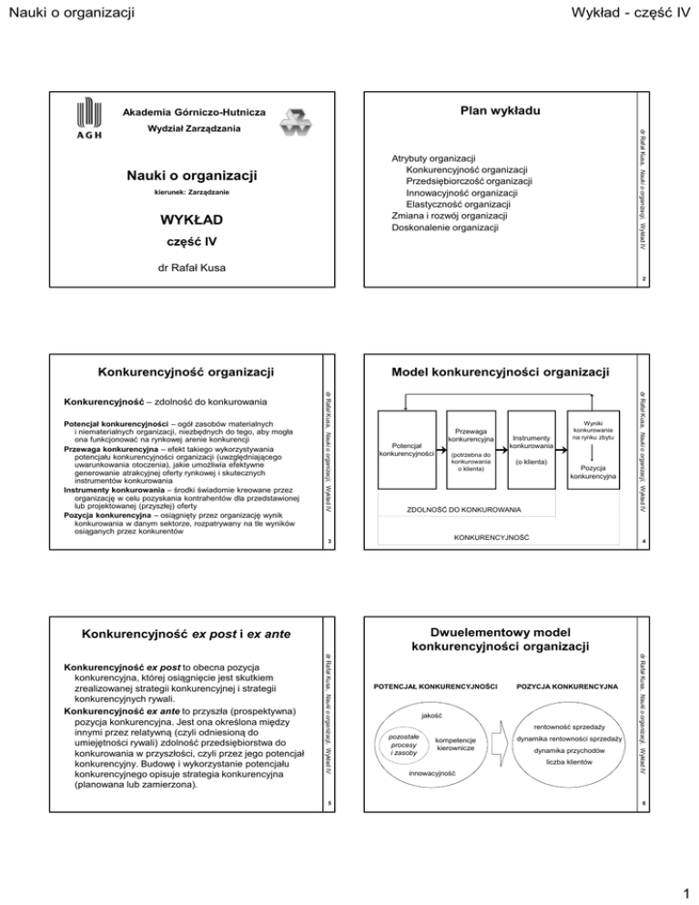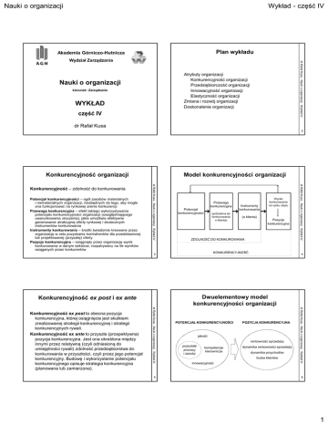 Nauki o organizacji Wykład - część IV Plan wykładu Akademia Górniczo-Hutnicza dr Rafał Kusa, Nauki o organizacji, Wykład IV Wydział Zarządzania Atrybuty organizacji Konkurencyjność organizacji Przedsiębiorczość organizacji Innowacyjność organizacji Elastyczność organizacji Zmiana i rozwój organizacji Doskonalenie organizacji Nauki o organizacji kierunek: Zarządzanie WYKŁAD część IV dr Rafał Kusa 2 Konkurencyjność organizacji Przewaga konkurencyjna Potencjał konkurencyjności (potrzebna do konkurowania o klienta) Wyniki konkurowania na rynku zbytu (o klienta) Pozycja konkurencyjna ZDOLNOŚĆ DO KONKUROWANIA KONKURENCYJNOŚĆ 3 4 Dwuelementowy model konkurencyjności organizacji Konkurencyjność ex post i ex ante 5 POTENCJAŁ KONKURENCYJNOŚCI POZYCJA KONKURENCYJNA jakość rentowność sprzedaży pozostałe procesy i zasoby kompetencje kierownicze dynamika rentowności sprzedaży dynamika przychodów liczba klientów innowacyjność dr Rafał Kusa, Nauki o organizacji, Wykład IV dr Rafał Kusa, Nauki o organizacji, Wykład IV Konkurencyjność ex post to obecna pozycja konkurencyjna, której osiągnięcie jest skutkiem zrealizowanej strategii konkurencyjnej i strategii konkurencyjnych rywali. Konkurencyjność ex ante to przyszła (prospektywna) pozycja konkurencyjna. Jest ona określona między innymi przez relatywną (czyli odniesioną do umiejętności rywali) zdolność przedsiębiorstwa do konkurowania w przyszłości, czyli przez jego potencjał konkurencyjny. Budowę i wykorzystanie potencjału konkurencyjnego opisuje strategia konkurencyjna (planowana lub zamierzona). Instrumenty konkurowania dr Rafał Kusa, Nauki o organizacji, Wykład IV Potencjał konkurencyjności – ogół zasobów materialnych i niematerialnych organizacji, niezbędnych do tego, aby mogła ona funkcjonować na rynkowej arenie konkurencji Przewaga konkurencyjna – efekt takiego wykorzystywania potencjału konkurencyjności organizacji (uwzględniającego uwarunkowania otoczenia), jakie umożliwia efektywne generowanie atrakcyjnej oferty rynkowej i skutecznych instrumentów konkurowania Instrumenty konkurowania – środki świadomie kreowane przez organizację w celu pozyskania kontrahentów dla przedstawionej lub projektowanej (przyszłej) oferty Pozycja konkurencyjna – osiągnięty przez organizację wynik konkurowania w danym sektorze, rozpatrywany na tle wyników osiąganych przez konkurentów dr Rafał Kusa, Nauki o organizacji, Wykład IV Konkurencyjność – zdolność do konkurowania Model konkurencyjności organizacji 6 1 Nauki o organizacji Wykład - część IV Przedsiębiorczość Proces przedsiębiorczości [H.Stevenson, HBS] Przedsiębiorczość wyraża się w czujności na możliwe nowe, wartościowe cele i możliwe nowe, dostępne zasoby, a przedsiębiorcze zachowanie polega na dostosowaniu środków realizacji obranych przez siebie celów do zmieniających się warunków działania [I.Kirzner] Identyfikacja szans/potrzeb i sposobów ich wykorzystania/zaspokojenia Administrowanie Prowadzenie działalności Planowanie i ocena ryzyka Inicjowanie działalności (dobór zasobów, wdrażanie struktur, operacji i procesów 7 8 Przedsiębiorczość Proces przedsiębiorczości 9 Przedsiębiorczość – prowadzenie działalności gospodarczej na własny rachunek na małą skalę ( drobna przedsiębiorczość) por.: B. Berger, Kultura przedsiębiorczości, Oficyna Literatów „Rój”, Warszawa, 1994, s. 16 Przedsiębiorczość jako cecha (przedsiębiorcy i przedsiębiorstwa) – gotowość i zdolność do podejmowania ryzyka, rozwiązywania w sposób twórczy i nowatorski powstałych problemów, umiejętność rozpoznawania i wykorzystywania pojawiających się szans i okazji oraz elastycznego przystosowania się do warunków rynkowych [por. S. Rudolf (red.), Przedsiębiorczość i twórcze …, UŁ 2002, s.29] Przedsiębiorczość jako sposób zarządzania – zdolność i umiejętność zorganizowania czynników wytwórczych i zarządzania nimi oraz uruchomienie nowych dziedzin działalności na bazie autentycznych innowacji lub ich twórczego naśladownictwa [por. M. Pietraszewski, Szansa dla przedsiębiorczych, 2002, s.16] 10 Przedsiębiorczość jako postawa W działalności gospodarczej Prowadzonej na własny rachunek W działalności społecznej Wykonywanej na rzecz pracodawcy przedsiębiorczość społeczna intra przedsiębiorczość Na dużą skalę Na małą skalę dr Rafał Kusa, Nauki o organizacji, Wykład IV Przedsiębiorczość – prowadzenie działalności gospodarczej na własny rachunek dr Rafał Kusa, Nauki o organizacji, Wykład IV Przedsiębiorczość – jeden z aspektów działalności gospodarczej [por. M. Pietraszewski, Szansa dla przedsiębiorczych, 2002, s.11] Poziomy przedsiębiorczości Przedsiębiorczość Przedsiębiorczość – postawa Przedsiębiorczość jako funkcja (kategoria) ekonomiczna – nowatorstwo, znajdowanie bardziej skutecznych sposobów działania na rynku, dających wyższą użyteczność produktów i usług oraz większą efektywność gospodarowania dr Rafał Kusa, Nauki o organizacji, Wykład IV Inicjowanie działalności obejmuje m.in. dobór zasobów, wdrażanie struktur, operacji i procesów dr Rafał Kusa, Nauki o organizacji, Wykład IV Przedsiębiorczość – proces obejmujący identyfikację rynkowych szans i potrzeb oraz sposobów ich wykorzystania i zaspokojenia, planowanie działalności wraz z oceną ryzyka, inicjowanie działalności oraz jej prowadzenie. dr Rafał Kusa, Nauki o organizacji, Wykład IV Przedsiębiorczość to pogoń za rynkową szansą, bez względu na aktualnie dysponowane zasoby dr Rafał Kusa, Nauki o organizacji, Wykład IV Przedsiębiorczość – proces planowania, organizowania i prowadzania działalności gospodarczej oraz podejmowania związanego z nią ryzyka [R.Griffin] drobna przedsiębiorczość 11 12 2 Nauki o organizacji Wykład - część IV Kulturowe uwarunkowania p