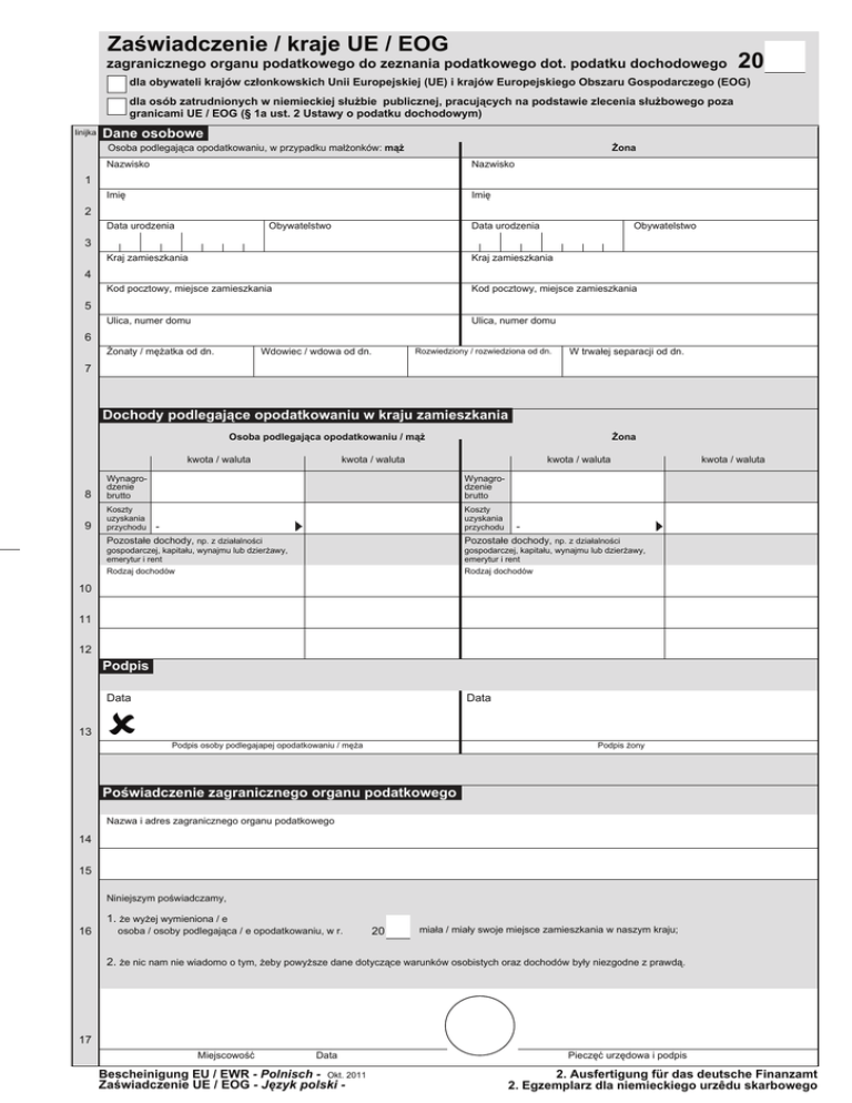 Za wiadczenie / kraje UE / EOG zagranicznego organu podatkowego do zeznania podatkowego dot. podatku dochodowego 20 dla obywateli krajów cz"onkowskich Unii Europejskiej (UE) i krajów Europejskiego Obszaru Gospodarczego (EOG) dla osób zatrudnionych w niemieckiej s"u$bie publicznej, pracuj#cych na podstawie zlecenia s"u$bowego poza granicami UE / EOG (§ 1a ust. 2 Ustawy o podatku dochodowym) linijka Dane osobowe %ona Osoba podlegaj ca opodatkowaniu, w przypadku ma!"onków: m#$ Nazwisko Nazwisko Imi# Imi# 1 2 Data urodzenia Data urodzenia Obywatelstwo Obywatelstwo 3 Kraj zamieszkania Kraj zamieszkania Kod pocztowy, miejsce zamieszkania Kod pocztowy, miejsce zamieszkania Ulica, numer domu Ulica, numer domu 4 5 6 $onaty / m#"atka od dn. Rozwiedziony / rozwiedziona od dn. Wdowiec / wdowa od dn. W trwa!ej separacji od dn. 7 Dochody podlegaj#ce opodatkowaniu w kraju zamieszkania Osoba podlegaj#ca opodatkowaniu / m#$ kwota / waluta %ona kwota / waluta kwota / waluta 8 Wynagrodzenie brutto Wynagrodzenie brutto 9 Koszty uzyskania przychodu Koszty uzyskania przychodu - kwota / waluta - Pozosta!e dochody, np. z dzia!alno%ci Pozosta!e dochody, np. z dzia!alno%ci gospodarczej, kapita!u, wynajmu lub dzier"awy, emerytur i rent gospodarczej, kapita!u, wynajmu lub dzier"awy, emerytur i rent Rodzaj dochodów Rodzaj dochodów 10 11 12 8 Podpis Data 13 Data Podpis osoby podlegajapej opodatkowaniu / m#"a Podpis "ony Po wiadczenie zagranicznego organu podatkowego Nazwa i adres zagranicznego organu podatkowego 14 15 Niniejszym po%wiadczamy, 1. "e wy"ej wymieniona / e 16 osoba / osoby podlegaj ca / e opodatkowaniu, w r. 20 mia!a / mia!y swoje miejsce zamieszkania w naszym kraju; 2. "e nic nam nie wiadomo o tym, "eby powy"sze dane dotycz ce warunków osobistych oraz dochodów by!y niezgodne z prawd . 17 Miejscowo%& Data Bescheinigung EU / EWR - Polnisch - Okt. 2011 Za wiadczenie UE / EOG - J zyk polski - Piecz#& urz#dowa i podpis 2. Ausfertigung für das deutsche Finanzamt 2. Egzemplarz dla niemieckiego urzêdu skarbowego