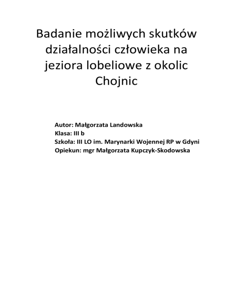 Badanie możliwych skutków działalności człowieka na jeziora lobeliowe z okolic Chojnic Autor: Małgorzata Landowska Klasa: III b Szkoła: III LO im. Marynarki Wojennej RP w Gdyni Opiekun: mgr Małgorzata Kupczyk-Skodowska Streszczenie: W dniach od 21.07.2015r. do 04.08.2015r. prowadzono obserwacje terenowe czterech jezior lobeliowych z okolic Chojnic, województwo pomorskie. (Badane obiekty przestawia Ryc.1.) Badano frekwencję oraz procentowe pokrycie transektów przez wybrane zespoły i zbiorowiska roślinne. Oprócz tego przeprowadzono analizę chemiczną wody pod kątem wybranych parametrów. Uzyskane wyniki świadczą o stosunkowo dobrym stanie jezior Wielkiego Gacna i Okonia Dużego. Jezioro Sierzywk podlega silnej eutrofizacji, której źródłem jest spływ powierzchniowy z otaczających jezioro pól oraz z pastwiska, wciąż jednak Sierzywk nie utracił całkowicie charakteru jeziora lobeliowego. Stan jeziora Kłodzko Małe świadczy o jego postępującej eutrofizacji, której źródłem może być działalność człowieka. Wstęp: Tematem mojej pracy są skutki antropogenicznego wpływu na jeziora lobeliowe, ponieważ chcę zwrócić uwagę na rangę problemu, jakim jest zanikanie naturalnego charakteru tych jezior oraz na potrzebę i znaczenie ich ochrony. Jezioro lobeliowe definiowane jest jako miękkowodny, oligo- lub mezotroficzny zbiornik wodny odznaczający się obecnością charakterystycznych gatunków roślin [3]. Główne zagrożenie tych siedlisk stanowią zatem nadmierna eutrofizacja i dystrofizacja[8,9]. Oddziaływaniem sprzyjającym postępującej eutrofizacji jest antropopresja[9]. A B C D Ryc.1. Widok jezior: Wlk. Gacno (A), Duży Okoń (B), Sierzywk (C) i Kłodzko Małe (D). 1 Materiał i metody: Obserwacje terenowe prowadzono w dniach od 21.07.2015r. do 04.08.2015r., na terenie czterech jezior lobeliowych. Dwa z nich: jezioro położone w PN„ Bory Tucholskie”- Wielkie Gacno (53°47'37"N 17°33'25"E) oraz jezioro położone w obrębie obszaru Natura 2000 [9] - Duży Okoń (53°43'16"N 17°25'40"E) zostały przyjęte w pracy jako wzorcowe jeziora lobeliowe. Natomiast jezioro stanowiące własność prywatną - Sierzywk (54°1'16"N 17°27'43"E) oraz jezioro Kłodzko Małe (53°44'10"N 17°21'56"E) na podstawie dostępnych danych [8,9] zaklasyfikowano jako zbiorniki antropogenicznie zmienione. Na każdym z jezior wyznaczono transekt o długości 200m i szerokości 2m, obejmujący obszar przylegający do linii brzegowej jeziora. Prowadząc obserwacje posługiwano się plastikową kratą, stosując miarę pokrywania powierzchni zajmowanej przez dany zespół roślinny w kwadracie 1mx1m. Do oceny powierzchni zajmowanej przez daną fitocenozę zastosowano skalę o następujących zakresach: 0%, 0-5%, 5-40%, 40-60%, 60-80%, 80-100%. Badane zespoły i zbiorowiska roślinne to: (elementy wytłuszczone stanowią identyfikatory fitosocjologiczne jezior lobeliowych [wg9]): Isoëto-Lobelietum dortmannae – zespół poryblinu jeziornego i lobelii jeziornej, Myriophylletum, alterniflori – zespół wywłócznika skrętoległego i brzeżycy jednokwiatowej, Luronietum natantis – zespół elismy wodnej, Ranunculo-Juncetum bulbosi – zespół jaskra leżącego i situ drobnego, Zbiorowisko ze Sparganium angustifolium (jeżogłówką pośrednią), Sparganietum minimi – zespół jeżogłówki najmniejszej, Calletum palustris – zespół czermieni błotnej, NupharoNymphaeetum albae – zespół grążela żółtego i grzybieni białych. Przy oznaczaniu zespołów i zbiorowisk roślinnych posługiwano się „Przewodnikiem do oznaczania zbiorowisk roślinnych Polski” Władysława Matuszkiewicza (2002) oraz Tomem II „Poradnika ochrony siedlisk i gatunków” dostępnym na stronie programu Natura 2000, częścią zatytułowaną: „siedlisko 3110 - jeziora lobeliowe”. Dnia 04.08 pobrano 3 próbki wody nadosadowej, każda o objętości 1dm3/jezioro celem przeprowadzenia analizy fizykochemicznej wody. W Tabeli 1. przedstawiono badane parametry oraz metody ich oznaczania: Tabela 1. Analiza fizykochemiczna wody Badany parametr Urządzenie/odczynnik/metoda pH, potencjał pH-metr stacjonarny z wbudowaną oksydacyjno-redukcyjny elektrodą typu redoks przewodnictwo elektrolityczne, TDS konduktometr barwa skala platynowo-kobaltowa ogólny węgiel organiczny (OWO) spektrofotometr zawartość Ca2+ odczynnik EDTA, NH2OHxHCl, kalces, NaOH (metoda wersenianowa) 2 Próbki do analizy pobierano losowo, w najgłębszym miejscu transektu, ok. 20 cm nad dnem, w odległości ok. 1,5m od linii brzegowej. Dzień po poborze, dzięki uprzejmości pracowników Katedry Ekologii Roślin Uniwersytetu Gdańskiego, autorka pracy poddała je podstawowemu badaniu analitycznemu w laboratorium ww. placówki. Próbki wody nie były w żaden sposób utrwalane chemicznie, do momentu wykonania ostatnich pomiarów (tj. do 08.09) były przechowywane w warunkach chłodniczych (4°C). Frekwencja zespołów, o jakiej mowa w części wyników, to procentowy udział kwadratów z obecnością danego zespołu do całkowitej liczby kwadratów badanej powierzchni danego jeziora (400)[1,5]. Pokrycie procentowe jest to natomiast suma % powierzchni zajmowanych przez dany zespół roślinny w kwadratach 1mx1m podzielona przez całkowitą liczbę kwadratów transektu, w których dany zespół jest obserwowany [5]. Ze względu na zastosowanie skali % innej niż popularna skala Braun-Blanqueta, na wykresach 3,4 zaznaczono min i max wartości pokrycia procentowego dla przyjętej skali. Nie obliczano wartości pokrycia % dla zespołów o frekwencji <1%, ze względu na niewielki wpływ na interpretację otrzymanych wyników. Wykresy 1-4 wykonano przy pomocy programu Excel. Wyniki: Wyniki badań laboratoryjnych wody zestawiono w Tabeli 2: Tabela 2. Średnie wartości wybranych parametrów dla próbek wody z jezior: Wlk. Gacno, Kłodzko Małe, Duży Okoń i Sierzywk Jezioro/ Parametr Wlk. Gacno Kłodzko M. D. Okoń Sierzywk 