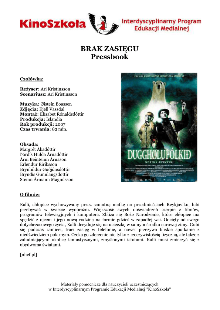BRAK ZASIĘGU Pressbook Czołówka: Reżyser: Ari Kristinsson Scenariusz: Ari Kristinsson Muzyka: Øistein Boassen Zdjęcia: Kjell Vassdal Montaż: Elísabet Rónaldsdóttir Produkcja: Islandia Rok produkcji: 2007 Czas trwania: 82 min. Obsada: Margrét Ákadóttir Þórdís Hulda Árnadóttir Árni Beinteinn Árnason Erlendur Eiríksson Brynhildur Guðjónsdóttir Bryndís Gunnlaugsdottír Steinn Ármann Magnússon O filmie: Kalli, chłopiec wychowywany przez samotną matkę na przedmieściach Reykjaviku, lubi przebywać w świecie wyobraźni. Większość swych doświadczeń czerpie z filmów, programów telewizyjnych i komputera. Zbliża się Boże Narodzenie, które chłopiec ma spędzić z ojcem i jego nową rodziną na farmie gdzieś w zapadłej wsi. Odcięty od swego dotychczasowego życia, Kalli decyduje się na ucieczkę w samym środku surowej zimy. Gubi się podczas zamieci, traci zasięg w telefonie, a nawet przeżywa bliskie spotkanie z niedźwiedziem polarnym. Czeka go zderzenie nie tylko z rzeczywistością fizyczną, ale także z zaludniającymi okolicę fantastycznymi, zmyślonymi istotami. Kalli musi zmierzyć się z obydwoma światami. [nhef.pl] Materiały pomocnicze dla nauczycieli uczestniczących w Interdyscyplinarnym Programie Edukacji Medialnej "KinoSzkoła" Recenzja: Film reprezentuje dość dobrze rozwinięty w Skandynawii nurt kinematografii dziecięcej. Dostrzeżony przez organizatorów Międzynarodowego Festiwalu Filmów dla Dzieci i Młodzieży ALE KINO! w Poznaniu oraz włączony do ogólnokrajowego projektu NOWE HORYZONTY Edukacji Filmowej. Opowieść jest właściwie bardzo prosta i można ją bez większych pominięć streścić w kilku zdaniach. Oto poznajemy chłopca o imieniu Kalli, wychowywanego przez samotną matkę w nowoczesnym, kosmopolitycznym Reykjaviku. Chłopiec jest uzależniony od wszystkich możliwych zdobyczy techniki i wygód, jakie ma do zaoferowania współczesność. Z tym większą zgrozą przyjmuje wizję spędzenia świąt u ojca na położonej gdzieś na północy wyspy farmie. Z daleka od miejskiego zgiełku i poza zasięgiem sieci komórkowej panuje zupełnie inna atmosfera. Tam wierzy się w duchy, załatwia sprawy niezałatwione w przeszłości, każdy kamień na swoją historię i swoje życie. Nowoczesność przegrywa tam w walce z tradycją. Film opowiada oczywiście o przeżyciach Kalliego. Rozczarowanie brakiem Internetu, zasięgu a wreszcie i prądu, poczucie zagrożenia i ogromna niechęć do przyrodniej siostry, która - jak twierdzi - potrafi kontaktować się z zaświatami - na początku budzą u niego totalny sprzeciw. Z czasem jednak dochodzi w nim do przemiany. Historie o duchach przestają go przerażać, podobnie brak zabawek. Godzi się z siostrą i razem postanawiają rozwiązać zagadkę tajemniczego wypadku sprzed lat, kiedy pod lawiną zginęło w nieznanych okolicznościach wielu ludzi. Wydaje się jednak, że dużo ważniejszy przekaz (przynajmniej dla starszych widzów) zawiera się w tle całego filmu. Wynika z niego bardzo kompletny obraz Islandii - z jednej strony wyspy otwartej na świat, wykorzystującej nowoczesne technologie, przyzwyczajonej wygód i dóbr materialnych, z drugiej - pełnej wierzeń w to, co nadprzyrodzone, przywiązanej do tradycji, natury i szanującej pamięć o przeszłości. I wcale nie jest to podział na miasto i wieś. Islandczycy na całej wyspie w typowy dla siebie sposób łączą obie te skrajności. I wszystko byłoby dobrze, gdyby nie ten nieislandzki niedźwiedź polarny! http://uw.islandia.pl/nova/?showme=nonetwork Karol Kwiatkowski, [uw.islandia.pl] Materiały pomocnicze dla nauczycieli uczestniczących w Interdyscyplinarnym Programie Edukacji Medialnej "KinoSzkoła"