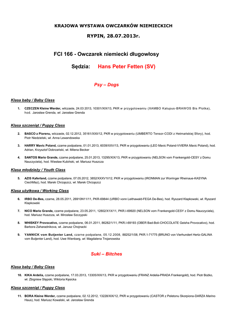 KRAJOWA WYSTAWA OWCZARKÓW NIEMIECKICH RYPIN, 28.07.2013r. FCI 166 - Owczarek niemiecki długowłosy Sędzia: Hans Peter Fetten (SV) Psy – Dogs Klasa baby / Baby Class 1. CZECZEN Kleine Werder, wilczaste, 24.03 2013, 10301/XIX/13, PKR w przygotowaniu (XAMBO Kalupus -BRAW OS Bis Plotka), hod. Jarosław Grenda, wł. Jarosław Grenda Klasa szczeniąt / Puppy Class 2. BASCO z Piorenu, wiiczaste, 02.12.2012, 35161/XXII/12, PKR w przygotowaniu (UMBERTO Tensor-CODI z Hetmańskiej Sfory), hod. Piotr Niedzielski, wł. Anna Lewandowska 3. HARRY Mavic Poland, czarne podpalane, 01.01.2013, 6039/XXV/13, PKR w przygotowaniu (LEO Mavic Poland-VVIERA Mavic Poland), hod. Adrian, Krzysztof Dobrzański, wł. Milena Becker 4. SANTOS Mario Grande, czarne podpalane, 25.01.2013, 13295/XIX/13, PKR w przygotowaniu (NELSON vom Frankengold-CESY z Domu Nauczyciela), hod. Wiesław Kubiński, wł. Mariusz Huszcza Klasa młodzieży / Youth Class 5. AZIS Kaferland, czarne podpalane, 07.05.2012, 3852/XXXV1I/12, PKR w przygotowaniu (IRONMAN zur Worringer Rheinaue-KASYNA CiechMaz), hod. Marek Chrząszcz, wł. Marek Chrząszcz Klasa użytkowa / Working Class 6. IRBO De-Bes, czarne, 28.05.2011, 26910N11/11, PKR-69844 (URBO vonn Leithawald-FEGA De-Bes), hod. Ryszard Klapkowski, wł. Ryszard Klapkowski 7. NICO Mario Grande, czarne podpalane, 23.05.2011, 12802/X1X/11, PKR.I-69920 (NELSON vom Frankengold-CESY z Domu Nauczyciela), hod. Mariusz Huszcza, wł. Mirosław Szczypski 8. WHISKEY Provocativo, czarne podpalane, 06.01.2011, 86282/1/11, PKR.I-69193 (OBER Bad-Boli-CHOCOLATE Geisha Provocativo), hod. Barbora Zaharadnikova, wł. Janusz Chojnacki 9. YANNICK vom Butjenter Land, czarne podpalane, 05.12.2008, 88252/1/08, PKR.1-71775 (BRUNO von Vierhundert Hertz-GALINA vom Butjenter Land), hod. Uwe Wienbarg, wł. Magdalena Trojanowska Suki – Bitches Klasa baby / Baby Class 10. KIKA Ardelia, czarne podpalane, 17.03.2013, 13305/XIX/13, PKR w przygotowaniu (FRANZ Ardelia-PRADA Frankengold), hod. Piotr Bożko, wł. Zbigniew Stępski, Wiktoria Kęsicka Klasa szczeniąt / Puppy Class 11. BORA Kleine Werder, czarne podpalane, 02.12.2012, 13228/XIX/12, PKR w przygotowaniu (CASTOR z Peletonu Skorpiona-DARZA Marino Haus), hod. Mariusz Kowalski, wł. Jarosław Grenda 12. HERRA Mavic Poland, czarne podpalane, 01.01.2013, 6044/XXV/13, PKR w przygotowaniu (LEO Mavic Poland-WIERA Mavic Poland), hod. Adrian, Krzysztof Dobrzański, wł. Milena Becker Klasa młodzieży / Youth Class 13. AGVA Jamos, czarne podpalane, 14.05.2012, 5954/XXV/12, PKR.I70769 (ORION Mavic Poland-SEA Mavic Poland), hod. Franciszek Dobrzański, wł. Milena Becker 14. ARIA Secundo Set, czarne podpalane, 03.03.2012, 9322NI/12, PKR.I70755 (FABIAN von der Grafschaft Mark-OKSA Ewita Adamus), hod. Łukasz Marczukiewicz, wł. Łukasz Marczukiewicz 15. XIRA z Drozda Piasków, czarne podpalane, 28.05.2012, 9470N1/12, PKR w przygotowaniu (WIRUS z Drozda Piasków-MEGI z Drozda Piasków), hod. Marek Drozdowski, wł. Bogdan Strojny Klasa juniorów / Junior Class 16. DUMA vom Trojangold, czarne podpalane, 19.10.2011, 86217/1/11, PKR.I-69215 (ZOTTEL vom Frankengold-YACKI vom Butjenter Land), hod. Magdalena Trojanowska, wł. Magdalena Trojanowska Klasa otwarta / Open Class 17. HO ND A z Ag i r u Boh emi a, cza rn e p o dp a la n e, 18. 06.2011, 3645/XXXI/11, PKR.I-69276 (NELSON von Frankengold-XINI z Agiru Bohemia), hod. Michał Sasak, wł. Jarosław Kołsut Klasa użytkowa / Working Class 18. Ulmich Team CONI PT1-IP01 czarne podpalane 15.05.2009 14271/XXI/09, PKR.I-65449 (DIAS AUS WATTENSCHE1D-LUKA z Ziemi Łukowskiej), hod. Michał Rozwora, wł. Zdzisław Wojcieszek 19. RICKIE von der Piste Trophe, czarne podpalane, 15.12.2007, 84906/1/07, PKR.I-67287 (VITO von der Piste Trophe-VIANA vom Fichtenschlag), hod. Erich Bosi, wł. Janusz Chojnacki 20. YACKI vom Butjenter Land, czarne podpalane, 05.12.2008, 8512011/08, PKR.I-67681 (BRUNO von Vierhundert Hertz-GALINA vom Butjenter Land), hod. Uwe Wienbarg, wł. Magdalena Trojanowska FCI 166 - Owczarek niemiecki krótkowłosy Sędzia: Hans Peter Fetten (SV) Psy – Dogs Klasa baby / Baby Class 21. ARMIN z Drozda Piasków, czarne podpalane, 23.03.2013, 9520N1/13, PKR w przygotowaniu (FAUSTOO Dlha Roven -VERWA z Drozda Piasków), hod. Marek Drozdowski, wł. Marek Drozdowski 22. BRUTUS Sekundo Set, czarne podpalane, 18.02.2013, 9570N1/13, PKR w przygotowaniu (BRUNO z Krywlan-OXA Evita Adamus), hod. Łukasz Marczukiewicz, wł. Łukasz Marczukiewicz 23. DAGO Imberfal, czarne podpalane, 17.02.2013, 8878611113, PKR w przygotowaniu (ENRICO vom Klostermoor-YADE Hexenland), hod. Przemek Pałuba, wł. Przemek Pałuba 24. DORAN Imberfal, czarne podpalane, 17.02.2013, 8890511113, PKR w przygotowaniu (ENRICO vom Klostermoor-YADE Hexenland), hod. Przemek Pałuba, wł. Przemek Pałuba 25. MAX z Domu Żyrków, czarne podpalane, 31.01.2013, 11774N/13, PKR w przygotowaniu (TROJ vom Hutberg-TARA z Domu Żyrków), hod. Józef Zyrek, wł. Józef Żyrek 26. MENTOS z Domu żyrków, czarne podpalane, 31.01.2013, 11776N113, PKR w przygotowaniu (TROJ vom Hutberg-TARA z Domu Żyrków), hod. Józef Żyrek, wł. Józef Żyrek Klasa szczeniąt / Puppy Class 27. LEO z Domu Żyrków, czarne podpalane, 21.12.2012, 11743N/12, PKR w przygotowaniu (ILIANO vom Fichtenschlag-ETNA z Jurajskiego Źródła), hod. Józef Żyrek, wł. Józef Żyrek 28. MESSI Złotnicki Gród, czarne, 03.01.2013, 47822/12/13, PKR w przygotowaniu (ILIANO vom Hchtenschlag-NADA vom Brunnenstrase), hod. Marek Konkolewski, wł. Jan Szymański 29. ORRUS De-Bes, cza rne,. 30 .12.201 3, 4199 1N11/12, PKR w przygotowaniu (ZICO von der Wannsee-ZINA De-Bes), hod. Ryszard Klapkowski, wł. Ryszard Klapkowski Klasa młodzików / Puppy Class 30. DUX Asarko Lordana, czarne podpalane, 14.10.2012, 34936/XXII/12, PKR.1-71590 (PARKOS vom PENDLER-TEQUILA Asarko Lordana), hod. Grzegorz Okrasa, wł. Piotr Baran Klasa młodzieży / Youth Class 31. BROS z Weselskiej Zagrody, czarne podpalane, 10.04.2012, 21409/XII/12, PKR.I -7226