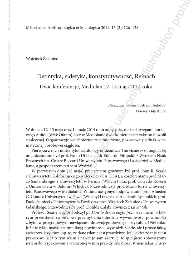 This copy is for personal use on ly - Deontyka, eidetyka, konstytutywność, Reinach Dwie konferencje, Mediolan 12–14 maja 2014 roku „Dicar, qua violens obstrepit Aufidus” Horacy, Ody III, 30 se lu is c op y is for pe rso na W dniach 12–13 maja oraz 14 maja 2014 roku odbyły się, nie nad brzegami burzliwego Aufidu (dziś: Ofanto), lecz w Mediolanie dwie konferencje z zakresu filozofii społecznej. Organizacyjno-technicznie zupełnie różne, pozostawały jednak w tematycznej i osobowej ciągłości. Pierwsza z nich nosiła tytuł „Ontology of deontics: The »isness« of ought”. Jej organizatorami byli prof. Paolo Di Lucia i dr Edoardo Fittipaldi z Wydziału Nauk Prawnych im. Cesare Beccarii Uniwersytetu Państwowego (La Statale) w Mediolanie, a gospodarzem ten sam Wydział. W pierwszym dniu (12 maja) prelegentem głównym był prof. John R. Searle z Uniwersytetu Kalifornijskiego w Berkeley (CA, USA), a koreferentami prof. Marco Santambrogio z Uniwersytetu w Parmie (Włochy) oraz prof. Corrado Roversi z Uniwersytetu w Bolonii (Włochy). Przewodniczył prof. Mario Jori z Uniwersytetu Państwowego w Mediolanie. W dniu następnym odpowiednio: prof. Amedeo G. Conte z Uniwersytetu w Pawii (Włochy) i rzymskiej Akademii Rysiookich, prof. Paolo Spinicci z Uniwersytetu w Pawii oraz prof. Wojciech Żełaniec z Uniwersytetu Gdańskiego. Przewodniczyła prof. Clotilde Calabi, również z La Statale. Profesor Searle wygłosił odczyt pt. How to derive ought from is revisited, w którym przedstawił swoje nowe przemyślenia odnośnie wywodliwości powinności z bytu, w programowym nawiązaniu do swojego sławnego artykułu z 1964 roku. Już nie tylko instytucje implikują powinności, wywodził Searle, ale i proste fakty, zwłaszcza językowe, np. to, że dane zdanie jest prawdziwe. Jeśli jakieś zdanie z jest prawdziwe, a ja o tym wiem i nawet je sam asertuję, to ipso facto zobowiązany jestem do respektowania wyrażonej w nim prawdy. Ale może istnieje jakaś „insty- Th This copy is for personal use only - distribution prohibited. This copy is for personal use only - distribution prohibited. - ibu tio np roh i dis tr Wojciech Żełaniec - This copy is for personal use only - distribution prohibited. - Miscellanea Anthropologica et Sociologica 2014, 15 (2): 126–128 ibu tio np roh i 127 is c op y is for pe rso na lu se on ly - dis tr tucja asercji” i rzeczony obowiązek istnieje tylko w jej ramach, tj. zachodzi tylko dopóty, dopóki ktoś ma ochotę w niej uczestniczyć, nie jest więc obowiązkiem moralnym sensu stricto? A może też obowiązek ten zachodzi wyłącznie na płaszczyźnie metajęzykowej, a już nie na płaszczyźnie przedmiotowej, tj. sprowadza się do relacji wynikania między zdaniami typu „dokonałem asercji zdania z” i zdaniami typu „jestem zobowiązany do respektowania prawdy wyrażonej w zdaniu z”. Czy w ogóle obowiązek prawdziwie moralny, nie instytucjonalny i/lub metajęzykowy, da się wywieść, zdaniem Searle’a, z rzeczywistości, jaką jest? Te i inne wątpliwości podnosili w swoich referatach prof. Santambrogio i Roversi. Profesor Searle pozostał nieugięty: sławetna przepaść między bytem a powinnością jest w dużym stopniu pozorna. Następnego dnia wystąpił profesor Conte z odczytem How to derive is from ought, w którym przedstawił główne zręby swojej doktryny reguł konstytutywnych (Żełaniec 2013) (takie reguły/normy przez sam fakt swego istnienia generują pewne byty, mianowicie idealne typy rodzajów praktyk społecznych, w tym sensie byt daje się wywieść z powinności). Reguły takie nie dają się natomiast wywieść z (obserwacji) odnośnych praktyk społecznych, co zakwestionował w swoim koreferacie, powołując się na Wittgensteina, prof. Spinicci1. W tym sensie powinność ciągle nie jest wywiedlna z bytu. Pytanie tylko, czy reguły konstytutywne można uznać za wyrażające jakąkolwiek powinność i czy do takowej nie przynależy w sposób istotny osoba, oddająca się danej praktyce — pytał prof. Spinicci. Profesor Żełaniec natomiast zauważył, że w odniesieniu do wielu stanów rzeczy możliwe jest rozumowanie abdukcyjne (nie: dedukcyjne) od „jest” do „powinien”, a także na odwrót, w tym sensie, że jeżeli coś zachodzi, to prawdopodobnie albo jest dozwolone, albo nakazane, a jeśli coś nakazane, zakazane lub dozwolone, to prawdopodobnie gdzieś zachodzi lub zaszło. Profesor Żełaniec przypomniał też stosowny fragment znanego wiersza Morgensterna, gdzie podmiot liryczny wnioskuje, że skoro coś jest zabronione, to tego też nie ma. Ze spontanicznym koreferatem wystąpił też prof. Searle, jeszcze raz śpiewając chwałę języka i jego mocy stwarzania intencjonalnych i deontycznych stanów rzeczy. Momentami prof. Searle pobrzmiewał jak francuski neostrukturalista. Druga konferencja odbyła się 14 maja na Wydziale Prawa również państwowego Uniwersytetu Bicocca. Gospodarzem był Instytut Systemów Prawnych, a organizatorem dr Lorenzo Passerini-Glazel z tego właśnie instytutu. Obrady otworzyła prof. Patrizia Borsellino, dyrektor tegoż instytutu, a przewodniczyli im wspomniani profesorowie Conte i Di Lucia. Celem tej konferencji, zatytułowanej „Costitutività ed eidetica del diritto”, była dyskusja dwu książek: Francesci De Vecchi (red.), Eidetica del diritto e ontologia sociale. Il realismo di Adolf Reinach/Eidetics of Law and Social Ontology. Adolf Reinach, the Realist i Create to Rule. Studies on Constitutive Rules Wojciecha Th This copy is for personal use This copy is for personal use only - distribution prohibited. This copy is for personal use only - distribution prohibited. This copy is for personal use only - distribution prohibited. - Deontyka, eidetyka, konstytutywność, Reinach… 1 Tezę tę próbuje argumentatywnie podważyć również gdański student prof. Żełańca, Paweł Pawłowski. ibu tio np roh i y is for pe rso na lu se on ly - dis tr Żeła
