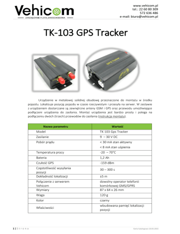 www.vehicom.pl tel.: 22 60 80 309 572 636 486 e-mail: [email protected] TK-103 GPS Tracker Urządzenie w metalowej solidnej obudowę przeznaczone do montażu w środku pojazdu. Lokalizuje pozycję pojazdu w czasie rzeczywistym i przesyła na serwer. W zestawie z urządzeniem dostarczane są zewnętrzne anteny GSM i GPS oraz przewodu umożliwiające podłączeni urządzenia do zasilania. Montaż urządzenia jest bardzo prosty i polega na podłączeniu dwóch (trzech) przewodów do zasilania (instrukcja montażu). Nazwa parametru Wartość Model TK 103 Gps Tracker Zasilanie 9 – 30 V DC Pobór prądu < 30 mA stan aktywny < 8 mA stan uśpienia 1|S t r o n a Temperatura pracy -20 – 70°C Bateria 1,2 Ah Czułość GPS -159 dBm Częstotliwość wysyłania pozycji Dokładność lokalizacji 30 – 300 s Połączenie z serwerem Vehicom Wymiary dowolny operator telefonii komórkowej GMS/GPRS 87 x 64 x 26 mm Waga 120 g Kolor czarny Właściwości wbudowana pamięć lokalizacji pozycji ±5 m Karta katalogowa 10.03.2015 www.vehicom.pl tel.: 22 60 80 309 572 636 486 e-mail: [email protected] SINOCASTEL IDD-213GL Urządzenie podłączane jest do złącza diagnostycznego dostępnego w każdym samochodzie. Podłączenie urządzenia do złącz diagnostycznego OBDII pozwala odczytywać z komputera pokładowego stan pojazdu tj. zużycie paliwa, monitorowanie prędkości obrotowej, napięcia na akumulatorze, kodów błędów kontrolki „CheckEngine”. Urządzenie może być podłączane bezpośrednie do złącza diagnostycznego lub za pomocą płaskiego przewodu (instrukcja montażu). Nazwa parametru Wartość Model IDD-213GL Zasilanie 9 – 36 VDC Pobór prądu < 40 mA Temperatura pracy -30 – 85°C Bateria 3,7 V/100 mAh Czułość GPS -160 dBm Częstotliwość wysyłania pozycji Dokładność lokalizacji 20 – 300 s ±5 m CEP Połączenie z serwerem Vehicom Wymiary dowolny operator telefonii komórkowej GSM/GPRS 63 x 50 x 28 mm Waga 50 g Kolor czarny Właściwości 2|S t r o n a monitoring zużycia paliwa z dokładnością 0,1 L pomiar prędkości obrotowej silnika odczytanie kodu błędu kontrolki „CheckEngine” Karta katalogowa 10.03.2015 www.vehicom.pl tel.: 22 60 80 309 572 636 486 e-mail: [email protected] SINOCASTEL IDD-212GL Urządzenie podłączane jest do złącza diagnostycznego dostępnego w każdym samochodzie. Podłączenie urządzenia do złącz diagnostycznego OBDII pozwala odczytywać z komputera pokładowego stan pojazdu tj. zużycie paliwa, monitorowanie prędkości obrotowej, napięcia na akumulatorze, kodów błędów kontrolki „CheckEngine”. Urządzenie może być podłączane bezpośrednie do złącza diagnostycznego lub za pomocą płaskiego przewodu (instrukcja montażu). Dodatkowo do urządzenia można podłączyć czytnik RFiD (pokazany na rysunku z lewej strony), który służy identyfikacji kierowcy w systemie rejestracji tras. Nazwa parametru Wartość Model IDD-212GL Zasilanie 9 – 36 V DC Pobór prądu < 40 mA Temperatura pracy -30 – 70°C Bateria 3,7 V/100 mAh Czułość GPS -160 dBm Częstotliwość wysyłania pozycji Dokładność lokalizacji 20 – 300 s Połączenie z serwerem Vehicom Wymiary dowolny operator telefonii komórkowej GSM/GPRS 50 x 55 x 28 mm Waga 50 g Kolor czarny ±5 m CEP Właściwości 3|S t r o n a monitoring zużycia paliwa z dokładnością 0,1 L pomiar prędkości obrotowej silnika odczytanie kodu błędu kontrolki „CheckEngine” identyfikacja kierowcy za pomocą kart RFiD Karta katalogowa 10.03.2015