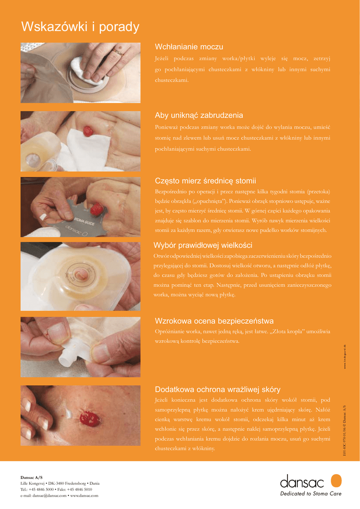 Wskazówki i porady Wchłanianie moczu Jeżeli podczas zmiany worka/płytki wyleje się mocz, zetrzyj go pochłaniającymi chusteczkami z włókniny lub innymi suchymi chusteczkami. Aby uniknąć zabrudzenia Ponieważ podczas zmiany worka może dojść do wylania moczu, umieść stomię nad zlewem lub usuń mocz chusteczkami z włókniny lub innymi pochłaniającymi suchymi chusteczkami. Często mierz średnicę stomii Bezpośrednio po operacji i przez następne kilka tygodni stomia (przetoka) będzie obrzękła („opuchnięta”). Ponieważ obrzęk stopniowo ustępuje, ważne jest, by często mierzyć średnicę stomii. W górnej części każdego opakowania znajduje się szablon do mierzenia stomii. Wyrób nawyk mierzenia wielkości stomii za każdym razem, gdy otwierasz nowe pudełko worków stomijnych. Wybór prawidłowej wielkości Otwór odpowiedniej wielkości zapobiega zaczerwienieniu skóry bezpośrednio przylegającej do stomii. Dostosuj wielkość otworu, a następnie odłóż płytkę, do czasu gdy będziesz gotów do założenia. Po ustąpieniu obrzęku stomii można pominąć ten etap. Następnie, przed usunięciem zanieczyszczonego worka, można wyciąć nową płytkę. Wzrokowa ocena bezpieczeństwa Opróżnianie worka, nawet jedną ręką, jest łatwe. „Złota kropla” umożliwia Dodatkowa ochrona wrażliwej skóry Jeżeli konieczna jest dodatkowa ochrona skóry wokół stomii, pod samoprzylepną płytkę można nałożyć krem ujędrniający skórę. Nałóż cienką warstwę kremu wokół stomii, odczekaj kilka minut aż krem wchłonie się przez skórę, a następnie naklej samoprzylepną płytkę. Jeżeli podczas wchłaniania kremu dojdzie do rozlania moczu, usuń go suchymi chusteczkami z włókniny. Dansac A/S Lille Kongevej • DK-3480 Fredensborg • Dania Tel.: +45 4846 5000 • Faks: +45 4846 5010 e-mail: [email protected] • www.dansac.com Dedicated to Stoma Care E01-83C-970 01/06 © Dansac A/S w w w. l i n d e g a a r d . d k wzrokową kontrolę bezpieczeństwa. -p Pielęgnacja urostomii w domu Zakładanie dwuczęściowego worka urostomijnego Zakładanie dwuczęściowego worka urostomijnego Konieczne akcesoria: a) Worek na odpady b) Suche chusteczki do przemywania i osuszania c)Ciepła woda do przemywania d) Nowa płytka i worek e) Nożyczki do docięcia płytki (jeśli konieczne) f) Ewentualnie inne konieczne akcesoria Ważne. Przed rozpoczęciem pielęgnacji urostomii przygotuj i zgromadź cały niezbędny sprzęt stomijny. Najwygodniejsze może być przeprowadzenie zabiegu rano, przed posiłkiem. 4 1 Ostrożnie zdejmij zużytą płytkę i worek. Pamiętaj, by najpierw opróżnić worek. Aby dodatkowo zabezpieczyć się przed zabrudzeniem, za pasek ubrania można włożyć plastikową torebkę. 5 Jeżeli to konieczne, zmierz rozmiar stomii, korzystając z szablonu. 8 Osusz skórę czystymi, suchymi, niestrzępiącymi się chusteczkami. Ważne. Przed założeniem nowej płytki skóra wokół stomii powinna być całkowicie sucha. 12 Załóż worek na płytkę i zatrzaśnij łącznik. Jeżeli twoja stomia ma nieregularny lub owalny kształt, dotnij kształt otworu w płytce małymi, ostrymi nożyczkami lub palcem poszerz otwór do rozmiarów odpowiadających średnicy stomii. Pamiętaj. Płytka musi dokładnie obejmować stomię, bez nadmiernego ucisku ani drażnienia jej powierzchni. 9 Zdejmij osłonkę bezpośrednio przed założeniem samoprzylepnej płytki. 13 Przyciskaj palcami wokół mocowania, by szczelnie złączyć worek z płytką. Urostomia Po chirurgicznym usunięciu pęcherza moczowego konieczna jest inna metoda magazynowania i oddawania moczu. Jeżeli chirurg zadecyduje o wykonaniu wstawki z jelita cienkiego, wykorzysta fragment jelita do wytworzenia nowej drogi odpływu moczu. Z jednym końcem wstawki łączy się moczowody. Drugi koniec, wyłoniony przez otwór w ścianie brzucha, określa się jako urostomii. Urostomia służy do wydalania moczu z organizmu. Stomia ma czerwoną barwę i jest wilgotna. Ponieważ nie zawiera zakończeń nerwowych, jest pozbawiona czucia. Mocz stale spływa do specjalnego worka urostomijnego. 2 Rozprostuj skórę brzucha, przyciskając jedną ręką, a następnie ostrożnie zdejmij samoprzylepną płytkę. 6 Zwilż w letniej wodzie kilka chusteczek z włókniny. 10 Załóż i dociśnij płytkę samoprzylepną centralnie nad otworem stomii. Uciskaj płytkę od środka na zewnątrz wokół stomii, aż nabierzesz pewności, że płytka ściśle, bezpiecznie przylega do skóry. 14 Ponownie sprawdź, czy worek został bezpiecznie połączony z pierścieniem płytki. 3 Wyrzuć zabrudzony worek i płytkę samoprzylepną. 7 Starannie przemyj stomię i otaczającą skórę. 11 Upewnij się, że kranik worka jest zamknięty. 15 Zadanie wykonane!
