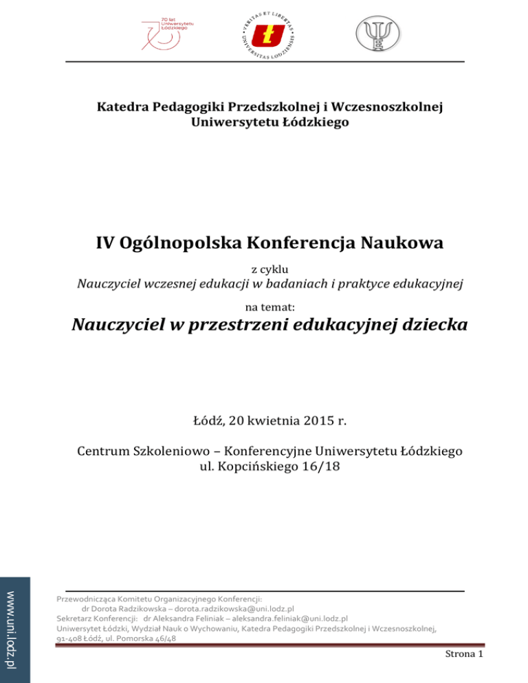 Katedra Pedagogiki Przedszkolnej i Wczesnoszkolnej Uniwersytetu Łódzkiego IV Ogólnopolska Konferencja Naukowa z cyklu Nauczyciel wczesnej edukacji w badaniach i praktyce edukacyjnej na temat: Nauczyciel w przestrzeni edukacyjnej dziecka Łódź, 20 kwietnia 2015 r. Centrum Szkoleniowo – Konferencyjne Uniwersytetu Łódzkiego ul. Kopcińskiego 16/18 www.uni.lodz.pl Przewodnicząca Komitetu Organizacyjnego Konferencji: dr Dorota Radzikowska – [email protected] Sekretarz Konferencji: dr Aleksandra Feliniak – [email protected] Uniwersytet Łódzki, Wydział Nauk o Wychowaniu, Katedra Pedagogiki Przedszkolnej i Wczesnoszkolnej, 91-408 Łódź, ul. Pomorska 46/48 Strona 1 Konferencja pod Honorowym Patronatem: Prezydent Miasta Łodzi Hanny Zdanowskiej i Jego Magnificencji Rektor UŁ prof. dr hab. Włodzimierza Nykiela Komitet Naukowy Konferencji Przewodnicząca: prof. nadzw. dr hab. Wiesława Leżańska Kierownik Katedry Pedagogiki Przedszkolnej i Wczesnoszkolnej UŁ dr hab. Jolanta Andrzejewska - UMCS w Lublinie dr hab. prof. APS Józefa Bałachowicz – APS Warszawa prof. nadzw. dr hab. Jolanta Bonar - Uniwersytet Łódzki dr hab. prof. US Urszula Chęcińska – Uniwersytet Szczeciński dr hab. prof. UW Małgorzata Karwowska- Struczyk – Uniwersytet Warszawski dr hab. Mirosław Kisiel – Uniwersytet Śląski w Katowicach dr hab. prof. EUH-E Jolanta Kruk – Elbląska Uczelnia Humanistyczno Ekonomiczna dr hab. Krystyna Lubomirska – Uniwersytet Warszawski prof. nadzw. dr hab. Irena Szewczyk-Kowalewska – Uniwersytet Łódzki prof. nadzw. dr hab. Monika Wiśniewska-Kin – Uniwersytet Łódzki Komitet Organizacyjny Konferencji Przewodnicząca: dr Dorota Radzikowska Sekretarz: dr Aleksandra Feliniak dr Elżbieta Płóciennik mgr Marta Michalska www.uni.lodz.pl Przewodnicząca Komitetu Organizacyjnego Konferencji: dr Dorota Radzikowska – [email protected] Sekretarz Konferencji: dr Aleksandra Feliniak – [email protected] Uniwersytet Łódzki, Wydział Nauk o Wychowaniu, Katedra Pedagogiki Przedszkolnej i Wczesnoszkolnej, 91-408 Łódź, ul. Pomorska 46/48 Strona 2 PROGRAM KONFERENCJI 8.00 – 9.00 Rejestracja uczestników 9.00 – 9.30 Otwarcie konferencji Wystąpienie prof. nadzw. dr hab. Wiesławy Leżańskiej, Kierownika Katedry Pedagogiki Przedszkolnej i Wczesnoszkolnej WNoW UŁ: Powitania uczestniczących w Konferencji Gości Wystąpienie prof. nadzw. dr hab. Danuty Urbaniak - Zając, Dziekana Wydziału Nauk o Wychowaniu UŁ 9.30 – 11.00 Pierwsza część obrad plenarnych Przewodniczą: dr hab. prof. APS Józefa Bałachowicz prof. nadzw. dr hab. Wiesława Leżańska Wystąpienia: 1. dr hab. prof. APS Józefa Bałachowicz: Nauczyciel wczesnej edukacji. Od pedagogii adaptacyjnej do pedagogii „zdechłej myszy” 2. dr hab. prof. US Urszula Chęcińska: Idea universitas magistrorum et scholarum we wczesnej edukacji. Refleksja „ogarniająca” według K. Jaspersa 3. prof. nadzw. dr hab. Grażyna Poraj: Podmiotowe determinanty funkcjonowania w roli zawodowej nauczycieli na różnych poziomach edukacji szkolnej 4. dr hab. Jolanta Andrzejewska: Zadanie nauczyciela – zdziwić i zaciekawić dziecko w procesie uczenia się 11.00 – 11.45 Brunch 11.45 – 13.15 Druga część obrad plenarnych Przewodniczą: dr hab. prof. US Urszula Chęcińska prof. nadzw. dr hab. Jolanta Bonar Wystąpienia: 1. dr hab. prof. EUH-E Jolanta Kruk: Krytyczna filozofia techniczna jako paradygmat współczesnej metodyki nauczania 2. prof. nadzw. dr hab. Monika Wiśniewska-Kin: Dziecko jako podmiot działań edukacyjnych 3. dr hab. prof. UW Małgorzata Karwowska-Struczyk i mgr Olga Wysłowska: CLASS – narzędzie obserwacyjne jakości interakcji dorosły – dziecko w żłobku i przedszkolu – główne założenia teoretyczne, pozyskiwanie danych i ich interpretacja 4. dr Elżbieta Płóciennik: Współczesne wyzwania społeczne a warunki rozwijania mądrości na poziomie wczesnej edukacji 13.15 – 13.30 13.30 – 16.30 Przerwa kawowa Obrady w sekcjach tematycznych www.uni.lodz.pl Przewodnicząca Komitetu Organizacyjnego Konferencji: dr Dorota Radzikowska – [email protected] Sekretarz Konferencji: dr Aleksandra Feliniak – [email protected] Uniwersytet Łódzki, Wydział Nauk o Wychowaniu, Katedra Pedagogiki Przedszkolnej i Wczesnoszkolnej, 91-408 Łódź, ul. Pomorska 46/48 Strona 3 Sekcja I. Nauczyciel wczesnej edukacji w aspekcie oczekiwań społecznych i profesjonalnych Przewodniczą: dr hab. Jolanta Andrzejewska i dr Anna Tyl 13.30 –15.00 Wystąpienia: 1. prof. nadzw. dr hab. Wiesława Leżańska: Staż nauczycielski przestrzenią rozwijania kompetencji 2. dr hab. Krystyna Lubomirska i dr Agnieszka Kapuścińska: Jakość pobytu dziecka w żłobku i przedszkolu w opinii rodziców i profesjonalistów 3. dr Dagna Czerwonka: Kompetencje nauczyciela edukacji wczesnoszkolnej wobec oczekiwań XXI wieku 4. dr Aleksandra Feliniak i mgr Joanna Poselt: Oczekiwania społeczne wobec nauczyciela przedszkola - raport z badań 5. dr Katarzyna Nadachewicz: Oczekiwania rodziców oraz uczniów klas I-III szkoły podstawowej w stosunku do nauczyciela 6. dr Małgorzata Sławińska: Ideał nauczyciela w wypowiedziach studentów pedagogiki a współczesne koncepcje profesjonalizmu nauczycielskiego 7. dr Anna Tyl: Determinanty statusu zawodowego nauczyciela edukacji wczesnoszkolnej 8. dr Olga Zamecka-Zalas: Nauczyciel i uczeń wczesnej edukacji w warunkach zmian społecznych i edukacyjnych 9. mgr Estera Kucińska: Action Research – Refleksyjny pedagog w praktyce na podstawie systemu kształcenia studentów studiów magisterskich w Wielkiej Brytanii 15.00 – 15.15 Przerwa kawowa 15.15 – 16.30 Wystąpienia: 1. prof. dr hab. Svietlana Łoboda: Warunki rozwoju twórczości pedagogicznej przyszłego nauczyciela – wykorzystanie czasopism pedagogicznych 2. dr Ewa Żmijewska: Nauczyciel edukacji wczesnoszkolnej kreatorem dialogu międzykulturowego 3. dr Izabela Kiełtyk-Zaborowska: Nauczyciel – mój autorytet 