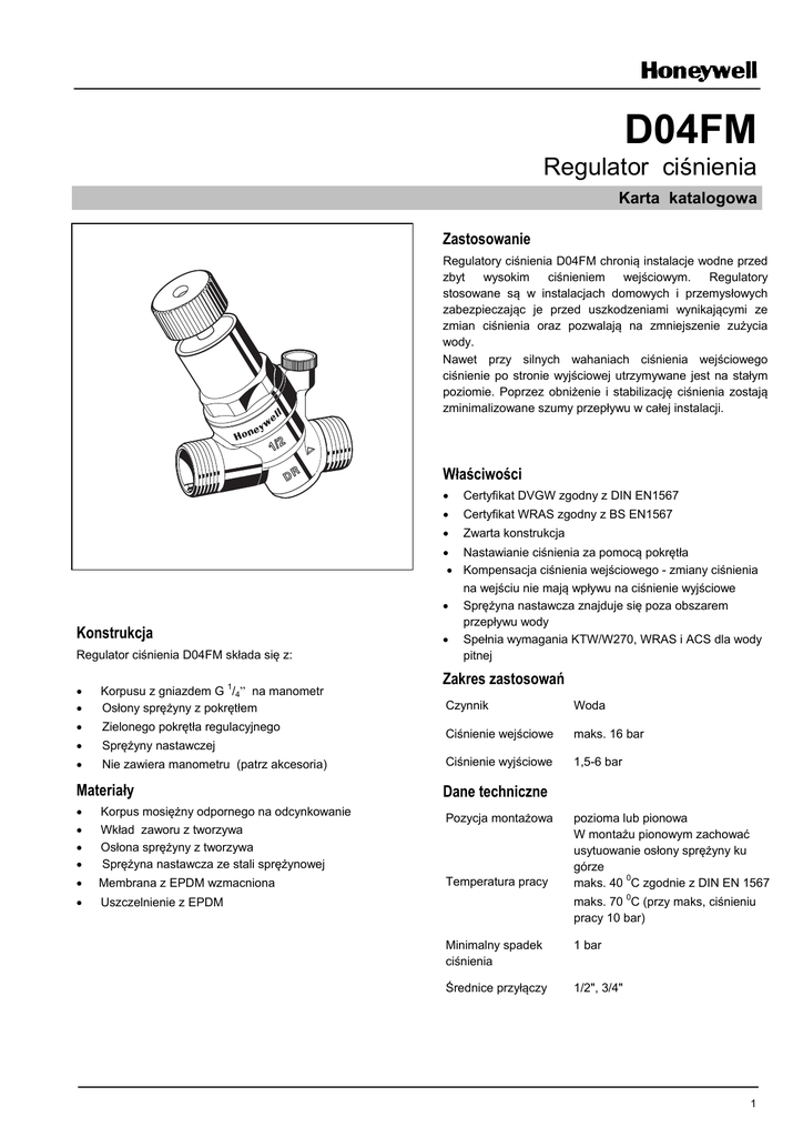 D04FM Regulator ciśnienia Karta katalogowa Zastosowanie Regulatory ciśnienia D04FM chronią instalacje wodne przed zbyt wysokim ciśnieniem wejściowym. Regulatory stosowane są w instalacjach domowych i przemysłowych zabezpieczając je przed uszkodzeniami wynikającymi ze zmian ciśnienia oraz pozwalają na zmniejszenie zużycia wody. Nawet przy silnych wahaniach ciśnienia wejściowego ciśnienie po stronie wyjściowej utrzymywane jest na stałym poziomie. Poprzez obniżenie i stabilizację ciśnienia zostają zminimalizowane szumy przepływu w całej instalacji. Właściwości Konstrukcja Regulator ciśnienia D04FM składa się z: Korpusu z gniazdem G 1/4” na manometr Osłony sprężyny z pokrętłem Zielonego pokrętła regulacyjnego Sprężyny nastawczej Nie zawiera manometru (patrz akcesoria) Materiały Korpus mosiężny odpornego na odcynkowanie Wkład zaworu z tworzywa Osłona sprężyny z tworzywa Sprężyna nastawcza ze stali sprężynowej Membrana z EPDM wzmacniona Uszczelnienie z EPDM Certyfikat DVGW zgodny z DIN EN1567 Certyfikat WRAS zgodny z BS EN1567 Zwarta konstrukcja Nastawianie ciśnienia za pomocą pokrętła Kompensacja ciśnienia wejściowego - zmiany ciśnienia na wejściu nie mają wpływu na ciśnienie wyjściowe Sprężyna nastawcza znajduje się poza obszarem przepływu wody Spełnia wymagania KTW/W270, WRAS i ACS dla wody pitnej Zakres zastosowań Czynnik Woda Ciśnienie wejściowe maks. 16 bar Ciśnienie wyjściowe 1,5-6 bar Dane techniczne Pozycja montażowa Temperatura pracy pozioma lub pionowa W montażu pionowym zachować usytuowanie osłony sprężyny ku górze maks. 40 0C zgodnie z DIN EN 1567 maks. 70 0C (przy maks, ciśnieniu pracy 10 bar) Minimalny spadek ciśnienia 1 bar Średnice przyłączy 1/2", 3/4" 1 D04FM Regulator ciśnienia Zasada działania Regulator ciśnienia działa na zasadzie równowagi sił działających na membranę: z jednej strony wynikającej z napięcia sprężyny, a z drugiej strony sił parcia od ciśnienia po redukcji. W przypadku występowania zmiennego ciśnienia wejściowego ruchomy wkład zaworu ustawia się w nowe położenie równowagi dla danej nastawy ciśnienia i ilości odbieranej wody (kompensacja ciśnienia wejściowego). W przypadku ustania poboru wody - zawór całkowicie się domyka. Oznaczenie D04FM-... A Wykonanie standardowe z gwintami zewnętrznymi i wewnętrznymi na wlocie i wylocie Wielkość przyłączy Ri 1/2" Ra 3 /4 " 1" Wielkość nominalna DN 15 20 Waga kg 0,29 0,33 Wymiary (mm) L 84 88 h 82,7 82,7 H 106 106 Wartość kvs m3/h 3/4" 1,9 Akcesoria M38K Części zamienne Manometr Obudowa 50 mm, przyłącze dolne gwintowane G1/4". Zakresy: 0 - 4, 0 - 10, 0 - 16 lub 0 - 25 bar. Przy zamówieniu należy podać zakres Nr Opis Wielkość Nr części 1 Wkład zaworu, kompletny 1/2” – 3/4” D04FMA-1/2 2 Korek R1/4” z O-ringiem S06K-1/4 1 2 Honeywell Sp. z o.o. ul. Domaniewska 39B 02-672 Warszawa tel.: 22 606 09 00; faks: 22 606 09 83 www.honeywell.com.pl/automatyka_domow 2 D04FS-k-pl01rMW0414