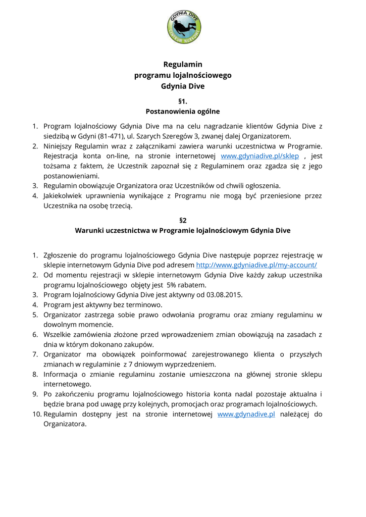 Regulamin programu lojalnościowego Gdynia Dive §1. Postanowienia ogólne 1. Program lojalnościowy Gdynia Dive ma na celu nagradzanie klientów Gdynia Dive z siedzibą w Gdyni (81-471), ul. Szarych Szeregów 3, zwanej dalej Organizatorem. 2. Niniejszy Regulamin wraz z załącznikami zawiera warunki uczestnictwa w Programie. Rejestracja konta on-line, na stronie internetowej www.gdyniadive.pl/sklep , jest tożsama z faktem, że Uczestnik zapoznał się z Regulaminem oraz zgadza się z jego postanowieniami. 3. Regulamin obowiązuje Organizatora oraz Uczestników od chwili ogłoszenia. 4. Jakiekolwiek uprawnienia wynikające z Programu nie mogą być przeniesione przez Uczestnika na osobę trzecią. §2 Warunki uczestnictwa w Programie lojalnościowym Gdynia Dive 1. Zgłoszenie do programu lojalnościowego Gdynia Dive następuje poprzez rejestrację w sklepie internetowym Gdynia Dive pod adresem http://www.gdyniadive.pl/my-account/ 2. Od momentu rejestracji w sklepie internetowym Gdynia Dive każdy zakup uczestnika programu lojalnościowego objęty jest 5% rabatem. 3. Program lojalnościowy Gdynia Dive jest aktywny od 03.08.2015. 4. Program jest aktywny bez terminowo. 5. Organizator zastrzega sobie prawo odwołania programu oraz zmiany regulaminu w dowolnym momencie. 6. Wszelkie zamówienia złożone przed wprowadzeniem zmian obowiązują na zasadach z dnia w którym dokonano zakupów. 7. Organizator ma obowiązek poinformować zarejestrowanego klienta o przyszłych zmianach w regulaminie z 7 dniowym wyprzedzeniem. 8. Informacja o zmianie regulaminu zostanie umieszczona na głównej stronie sklepu internetowego. 9. Po zakończeniu programu lojalnościowego historia konta nadal pozostaje aktualna i będzie brana pod uwagę przy kolejnych, promocjach oraz programach lojalnościowych. 10. Regulamin dostępny jest na stronie internetowej www.gdynadive.pl należącej do Organizatora. §3. Rejestracja 1. Zgłoszenie w formie on-line następuje poprzez rejestrację w serwisie internetowym pod adresem http://www.gdyniadive.pl/my-account/ 2. Rejestracja w sklepie internetowym Gdynia Dive oznacza wyrażenie zgody na przetwarzanie danych osobowych do celów marketingowych przez firmę Gdynia Dive Sp. z o.o. zgodnie z Ustawą z dnia 29.08.1997 r. o ochronie danych osobowych (Dz. U. z 2002 r. Nr 101, poz. 926 z późn. zm.) §5 Warunki przyznawania rabatu na zakupy w sklepie internetowym Gdynia Dive 1. 5% rabat na zakupy w sklepie internetowym Gdynia Dive przyznawany jest na zakup wszystkich produktów z wyłączeniem: butli nurkowych, produktów w promocji , materiałów szkoleniowych oraz gadżetów PADI. 2. W szczególnych przypadkach organizator zastrzega sobie prawo do wyłączenia poszczególnych produktów z programu lojalnościowego. Informacja taka zawarta będzie w opisie produktu. 3. Prawo ustalania wysokości rabatu za dokonaną transakcję oraz rodzaju produktów objętych Programem przysługuje wyłącznie Organizatorowi. 4. Rabat obejmuje tylko Uczestników, którzy są zarejestrowani w sklepie internetowym Gdynia Dive. 5. Z okazji promocji, posiadacz konta w sklepie internetowym Gdynia Dive może otrzymać dodatkowy rabat uprawniający go do jednorazowych zakupów z upustem cenowym. 6. Organizator może przyznać specjalny rabat indywidualny Posiadaczowi aktywnego konta internetowego, który w ostatnich 4 miesiącach dokonał dowolnego zakupu w sklepie internetowym Gdynia Dive pod adresem www.gdyniadive.pl/sklep należącej do Organizatora. Rabat ten przyznawany jest na zasadach i w wysokości ustalonej przez Organizatora. 7. Rabaty w sklepie internetowym Gdynia Dive obowiązują wyłącznie w okresie od 03.08.15 do odwołania. 8. Rabaty nie podlegają wymianie na gotówkę. Nie można ich odstępować osobom trzecim. 9. Rabat przyznawany za pomocą programu lojalnościowego nie łączy się z innymi promocjami chyba, że została zamieszczona wyraźna informacja o takiej możliwości w innym programie rabatowym. 10. Przy okazji wyjątkowych akcji marketingowych i handlowych przeprowadzanych w sklepie internetowym Gdynia Dive prowadzonym przez Organizatora pod adresem www.gdyniadive.pl/sklep przy zakupie określonych produktów, mogą być przyznawane dodatkowe rabaty. 11. Organizator może przyznać posiadaczom konta internetowego w sklepie Gdynia Dive specjalne upominki i bezpłatne usługi w Centrum Nurkowym Gdynia Dive należącym do Organizatora. §6. Zakończenie uczestnictwa w programie 1. Konto w sklepie internetowym Gdynia Dive funkcjonuje na podanych powyżej warunkach od 03.08.2015r do odwołania. 2. Usunięcie konta internetowego Uczestnika następuje w przypadku gdy: a) Uczestnik zażądał zaprzestania przetwarzania danych osobowych lub zgłosił sprzeciw w zakresie ich przetwarzania. b) Uczestnik wyraził żądanie usunięcia konta bez podania przyczyny. 3. Warunkiem wystąpienia Uczestnika z Programu jest zwrócenie się z prośbą o usunięcie konta do administratora poprzez wysłanie emaila na adres : [email protected] 4. W przypadku, gdy Uczestnik Programu nie dokonał zakupu dłużej niż 3 lata w sklepie internetowym Gdynia Dive prowadzonym przez Organizatora pod adresem internetowym: www.gdyniadive.pl, Organizator ma prawo do wykreślenia danych Uczestnika z bazy danych Organizatora. Wykreślenie danych Uczestnika z bazy danych Organizatora powoduje skasowanie i utratę rabatu. §7. Przetwarzanie Danych Osobowych 1. We wniosku zgłoszeniowym Uczestnik Programu wyraża dobrowolną zgodę na przetwarzanie swoich danych osobowych przez administratora zbioru danych Gdynia Dive z siedzibą w Gdyni (81-417), ul. Szarych Szeregów 3, w celach handlowych i marketingowych, a także na otrzymywanie ofert produktów i usług Gdynia Dive. Wszystkie dane osobowe są chronione zgodnie z Ustawą z dnia 29.08.1997 r. o ochronie danych osobowych (Dz.U. 2002 r. Nr 101 poz. 926 z późn. zm.) 2. Uczestnik Programu, zgodnie z powołaną powyżej Ustawą, ma prawo wglądu do swoich da