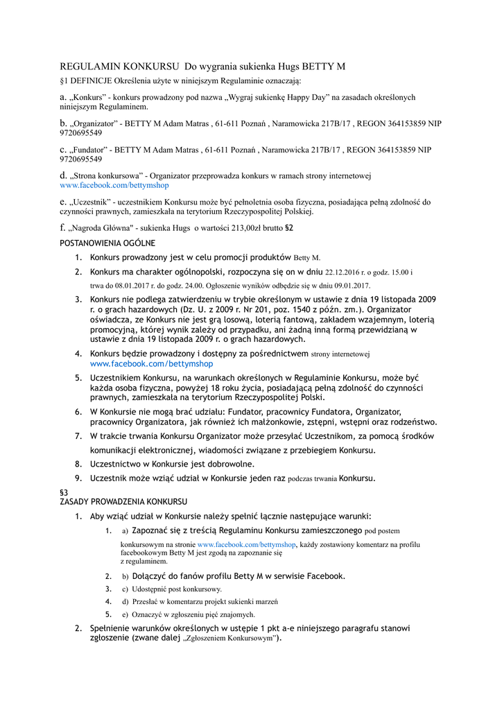 REGULAMIN KONKURSU Do wygrania sukienka Hugs BETTY M §1 DEFINICJE Określenia użyte w niniejszym Regulaminie oznaczają: a. „Konkurs” - konkurs prowadzony pod nazwa „Wygraj sukienkę Happy Day” na zasadach określonych niniejszym Regulaminem. b. „Organizator” - BETTY M Adam Matras , 61-611 Poznań , Naramowicka 217B/17 , REGON 364153859 NIP 9720695549 c. „Fundator” - BETTY M Adam Matras , 61-611 Poznań , Naramowicka 217B/17 , REGON 364153859 NIP 9720695549 d. „Strona konkursowa” - Organizator przeprowadza konkurs w ramach strony internetowej www.facebook.com/bettymshop e. „Uczestnik” - uczestnikiem Konkursu może być pełnoletnia osoba fizyczna, posiadająca pełną zdolność do czynności prawnych, zamieszkała na terytorium Rzeczypospolitej Polskiej. f. „Nagroda Główna" - sukienka Hugs o wartości 213,00zł brutto §2 POSTANOWIENIA OGÓLNE 1. Konkurs prowadzony jest w celu promocji produktów Betty M. 2. Konkurs ma charakter ogólnopolski, rozpoczyna się on w dniu 22.12.2016 r. o godz. 15.00 i trwa do 08.01.2017 r. do godz. 24.00. Ogłoszenie wyników odbędzie się w dniu 09.01.2017. 3. Konkurs nie podlega zatwierdzeniu w trybie określonym w ustawie z dnia 19 listopada 2009 r. o grach hazardowych (Dz. U. z 2009 r. Nr 201, poz. 1540 z późn. zm.). Organizator oświadcza, ze Konkurs nie jest grą losową, loterią fantową, zakładem wzajemnym, loterią promocyjną, której wynik zależy od przypadku, ani żadną inną formą przewidzianą w ustawie z dnia 19 listopada 2009 r. o grach hazardowych. 4. Konkurs będzie prowadzony i dostępny za pośrednictwem strony internetowej www.facebook.com/bettymshop 5. Uczestnikiem Konkursu, na warunkach określonych w Regulaminie Konkursu, może być każda osoba fizyczna, powyżej 18 roku życia, posiadającą pełną zdolność do czynności prawnych, zamieszkała na terytorium Rzeczypospolitej Polski. 6. W Konkursie nie mogą brać udziału: Fundator, pracownicy Fundatora, Organizator, pracownicy Organizatora, jak również ich małżonkowie, zstępni, wstępni oraz rodzeństwo. 7. W trakcie trwania Konkursu Organizator może przesyłać Uczestnikom, za pomocą środków komunikacji elektronicznej, wiadomości związane z przebiegiem Konkursu. 8. Uczestnictwo w Konkursie jest dobrowolne. 9. Uczestnik może wziąć udział w Konkursie jeden raz podczas trwania Konkursu. §3 ZASADY PROWADZENIA KONKURSU 1. Aby wziąć udział w Konkursie należy spełnić łącznie następujące warunki: 1. a) Zapoznać się z treścią Regulaminu Konkursu zamieszczonego pod postem konkursowym na stronie www.facebook.com/bettymshop, każdy zostawiony komentarz na profilu facebookowym Betty M jest zgodą na zapoznanie się z regulaminem. 2. b) Dołączyć do fanów profilu Betty M w serwisie Facebook. 3. c) Udostępnić post konkursowy. 4. d) Przesłać w komentarzu projekt sukienki marzeń 5. e) Oznaczyć w zgłoszeniu pięć znajomych. 2. Spełnienie warunków określonych w ustępie 1 pkt a-e niniejszego paragrafu stanowi zgłoszenie (zwane dalej „Zgłoszeniem Konkursowym”). 3. Po wyznaczonym czasie trwania Konkursu, Komisja Konkursowa wybierze jedno zgłoszenie – komentarz w postaci projektu , które zbierze najwięcej polubieni i nagrodzi Nagrodą Główną. 4. Nadesłane Zgłoszenia Konkursowe nie mogą zawierać treści wulgarnych, obraźliwych lub naruszających dobra osobiste innych osób. 5. Zgłoszenia Konkursowe niespełniające wymogów określonych w § 3 ust. 1 lub § 3 ust. 4 nie będą przyjmowane. 6. Uczestnicy Konkursu są zobowiązani do przestrzegania niniejszego Regulaminu. Nieprzestrzeganie Regulaminu może skutkować wykluczeniem Uczestnika z udziału w Konkursie. 7. Uczestnik udzielając odpowiedzi na pytanie udziela niewyłącznej, nieodpłatnej licencji na przetwarzanie lub wykorzystanie tej odpowiedzi przez BETTY M Adam Matras , 61-611 Poznań , Naramowicka 217B/17 , REGON 364153859 NIP 9720695549 w działaniach promocyjnych dotyczących Konkursu, jak również w celu przeprowadzenia i rozstrzygnięcia Konkursu. §4 PRAWA AUTORSKIE 1. Każdy Uczestnik, który udzielił odpowiedzi na pytanie w ramach Konkursu oświadcza, ze jest wyłącznym autorem tego tekstu i posiada pełne prawa majątkowe i osobiste prawa autorskie lub oświadcza, ze posiada wiedze, ze odpowiedź na pytanie w ramach Konkursu nie narusza autorskich praw majątkowych i osobistych osób trzecich. 2. Uczestnik zwolni Organizatora lub Fundatora od wszelkich roszczeń osób trzecich wynikających z faktu, ze autorskie prawa majątkowe i osobiste do nagrodzonej odpowiedzi przenoszone, na Organizatora lub Fundatora na podstawie postanowień Regulaminu, nie przysługiwały Uczestnikowi w dacie wydania nagrody. 3. 3.Uczestnik przekazuje Organizatorowi lub Funadatorowi prawa do używania w celach komercyjnych projekt sukienki bezterminowo. §5 NAGRODY W KONKURSIE I SPOSÓB ICH PRZYZNANIA 1. W ramach Konkursu przewidziane są następujące nagrody: a) Po czasie w którym odbywa się Konkurs (22.12.2016-08.01.2017) powołana przez Organizatora Komisja Konkursowa składająca się z Organizatora oraz przedstawiciela Fundatora (zwana dalej „Komisją Konkursową“) spośród Uczestników wybierze 1 osobę, której komentarz w postaci projektu zbierze najwięcej polubien(zwany dalej „Zwycięzcą Konkursu“). Zwycięzca Konkursu otrzyma Nagrodę Główną w postaci sukienki Hugs o wartości 213,00 złotych brutto.oraz sukienkę uszytą według zwycięskiego projektu b) Do zadań Komisji Konkursowej należy wybór Zwycięzcy Konkursu, jak również stwierdzanie ważności wyników Konkursu oraz dbanie o proces pozyskiwania danych niezbędnych do przekazania nagród Zwycięzcy oraz terminów ich dostarczenia. Zadania Komisji Konkursowej określone w niniejszym ustępie będą wykonywane zgodnie z postanowieniami niniejszego Regulaminu Konkursu oraz zasadami pełnej rzetelności przeprowadzonych czynności. 2. W Konkursie zostanie przyznana 