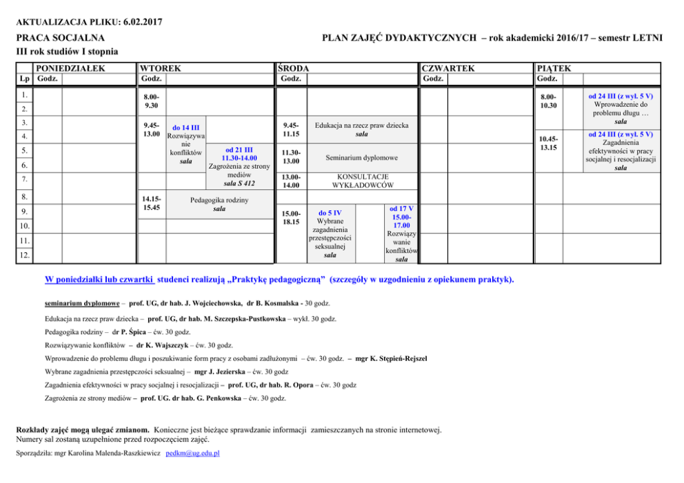 AKTUALIZACJA PLIKU: 6.02.2017 PLAN ZAJĘĆ DYDAKTYCZNYCH – rok akademicki 2016/17 – semestr LETNI PRACA SOCJALNA III rok studiów I stopnia PONIEDZIAŁEK Lp Godz. 1. 2. 3. 4. ŚRODA WTOREK Godz. Godz. 9.4513.00 6. Godz. Godz. 8.0010.30 do 14 III Rozwiązywa nie konfliktów sala 7. 9. PIĄTEK 8.009.30 5. 8. CZWARTEK 14.1515.45 od 21 III 11.30-14.00 Zagrożenia ze strony mediów sala S 412 Pedagogika rodziny sala 10. 9.4511.15 Edukacja na rzecz praw dziecka sala 11.3013.00 Seminarium dyplomowe 13.0014.00 KONSULTACJE WYKŁADOWCÓW 15.0018.15 11. 12. do 5 IV Wybrane zagadnienia przestępczości seksualnej sala od 17 V 15.0017.00 Rozwiązy wanie konfliktów sala W poniedziałki lub czwartki studenci realizują „Praktykę pedagogiczną” (szczegóły w uzgodnieniu z opiekunem praktyk). seminarium dyplomowe – prof. UG, dr hab. J. Wojciechowska, dr B. Kosmalska - 30 godz. Edukacja na rzecz praw dziecka – prof. UG, dr hab. M. Szczepska-Pustkowska – wykł. 30 godz. Pedagogika rodziny – dr P. Śpica – ćw. 30 godz. Rozwiązywanie konfliktów – dr K. Wajszczyk – ćw. 30 godz. Wprowadzenie do problemu długu i poszukiwanie form pracy z osobami zadłużonymi – ćw. 30 godz. – mgr K. Stępień-Rejszel Wybrane zagadnienia przestępczości seksualnej – mgr J. Jezierska – ćw. 30 godz Zagadnienia efektywności w pracy socjalnej i resocjalizacji – prof. UG, dr hab. R. Opora – ćw. 30 godz Zagrożenia ze strony mediów – prof. UG. dr hab. G. Penkowska – ćw. 30 godz. Rozkłady zajęć mogą ulegać zmianom. Konieczne jest bieżące sprawdzanie informacji zamieszczanych na stronie internetowej. Numery sal zostaną uzupełnione przed rozpoczęciem zajęć. Sporządziła: mgr Karolina Malenda-Raszkiewicz [email protected] 10.4513.15 od 24 III (z wył. 5 V) Wprowadzenie do problemu długu … sala od 24 III (z wył. 5 V) Zagadnienia efektywności w pracy socjalnej i resocjalizacji sala