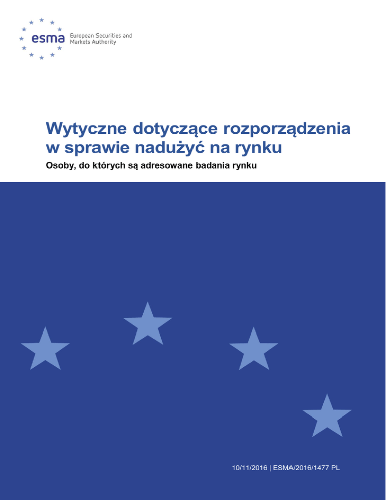 Wytyczne dotyczące rozporządzenia w sprawie nadużyć na rynku Osoby, do których są adresowane badania rynku 10/11/2016 | ESMA/2016/1477 PL Spis treści 1 Zakres ............................................................................................................................ 3 2 Odniesienia, skróty i definicje ......................................................................................... 3 3 Cel ................................................................................................................................. 4 4 Obowiązki dotyczące zgodności z przepisami i sprawozdawczości ................................ 4 5 4.1 Status wytycznych ................................................................................................... 4 4.2 Wymogi dotyczące sprawozdawczości .................................................................... 5 Wytyczne dla osób, do których są adresowane badania rynku ....................................... 5 2 1 Zakres Kto? 1. Niniejsze wytyczne mają zastosowanie do właściwych organów i osób, do których są adresowane badania rynku. Co? 2. Niniejsze wytyczne odnoszą się do czynników, kroków i zapisów, które osoby, do których są adresowane badania rynku, będą musiały uwzględnić i wdrożyć zgodnie z art. 11 ust. 11 rozporządzenia (UE) Parlamentu Europejskiego i Rady nr 596/2014. Kiedy? 3. Niniejsze wytyczne mają zastosowanie od 10/01/2017. 2 Odniesienia, skróty i definicje rozporządzenie w sprawie rozporządzenie Parlamentu Europejskiego i Rady (UE) nr ustanowienia ESMA 1095/2010 z dnia 24 listopada 2010 r. w sprawie ustanowienia Europejskiego Urzędu Nadzoru (Europejskiego Urzędu Nadzoru Giełd i Papierów Wartościowych), zmiany decyzji nr 716/2009/WE i uchylenia decyzji Komisji 2009/77/WE. MSR Osoba, do której jest adresowane badanie rynku DMP Uczestnik rynku ujawniający informacje rozporządzenie w sprawie rozporządzenie Parlamentu Europejskiego i Rady (UE) nr nadużyć na rynku 596/2014 z dnia 16 kwietnia 2014 r. w sprawie nadużyć na rynku (rozporządzenie w sprawie nadużyć na rynku) oraz uchylające dyrektywę 2003/6/WE Parlamentu Europejskiego i Rady i dyrektywy Komisji 2003/124/WE, 2003/125/WE i 2004/72/WE regulacyjne standardy rozporządzenie delegowane Komisji (UE) 2016/960 z dnia techniczne dotyczące badań 17 maja 2016 r. uzupełniające rozporządzenie rynku Parlamentu Europejskiego i Rady (UE) nr 596/2014 w odniesieniu do regulacyjnych standardów technicznych służących określeniu właściwych rozwiązań, systemów i procedur obowiązujących uczestników rynku ujawniających informacje w trakcie badań rynku 3 3 Cel 4. Artykuł 11 ust. 11 rozporządzenia w sprawie nadużyć na rynku stanowi, że ESMA wydaje wytyczne przeznaczone dla osób, do których są skierowane badania rynku, w odniesieniu do: a) czynników, które takie osoby muszą wziąć pod uwagę, gdy w ramach badania rynkowego są im ujawniane informacje, tak aby mogły ocenić, czy dane informacje są informacjami poufnymi; b) kroków, które takie osoby muszą podjąć, gdy ujawniono im informacje poufne, tak aby mogły spełnić wymogi art. 8 i 10 rozporządzenia w sprawie nadużyć na rynku; oraz c) zapisów, które takie osoby muszą przechowywać w celu wykazania, że spełniły wymogi art. 8 i 10 rozporządzenia w sprawie nadużyć na rynku. 5. Celem niniejszych wytycznych jest zapewnienie wspólnego, jednolitego i spójnego podejścia w związku z wymogami wobec osób, do których są adresowane badania rynku. Wytyczne zostały opracowane z myślą o ograniczeniu ogólnego ryzyka rozpowszechnienia informacji poufnych przekazywanych w trakcie badania rynku oraz z myślą o zapewnieniu właściwym organom narzędzi do skutecznego przeprowadzania czynności wyjaśniających w przypadkach podejrzenia nadużyć na rynku. 4 Obowiązki dotyczące sprawozdawczości zgodności z przepisami i 4.1 Status wytycznych 6. Niniejszy dokument zawiera wytyczne wydane na podstawie art. 11 ust. 11 rozporządzenia w sprawie nadużyć na rynku. Właściwe organy i uczestnicy rynku finansowego dokładają wszelkich starań, aby zastosować się do tych wytycznych i zaleceń. 4 4.2 Wymogi dotyczące sprawozdawczości 7. Właściwe organy, do których odnoszą się wytyczne, mają obowiązek powiadomić ESMA, czy stosują się lub czy zamierzają zastosować się do niniejszych wytycznych, podając powody niestosowania się do nich, w ciągu dwóch miesięcy od ich publikacji przez ESMA, wysyłając wiadomość na adres [[email protected]]. W przypadku braku odpowiedzi w powyższym terminie właściwe organy zostaną uznane za niestosujące się do wymogów. Szablon zawiadomienia jest dostępny na stronie internetowej ESMA. 8. Osoby, do których są adresowane badania rynku, nie mają obowiązku zawiadamiania, czy stosują się do niniejszych wytycznych. 5 Wytyczne dla osób, do których są adresowane badania rynku 1. Procedury wewnętrzne i szkolenie pracowników 9. Osoba, do której jest adresowane badanie rynku, powinna ustanowić, wdrożyć i stosować procedury wewnętrzne, które są odpowiednie i proporcjonalne w stosunku do skali, wielkości i charakteru jej działalności, aby: a. zagwarantować dostępność informacji uczestnikowi rynku ujawniającemu informacje w przypadku, gdy osoba, do której jest adresowane badanie rynku, wyznaczy konkretną osobę lub punkt kontaktowy na potrzeby otrzymywania badań rynku; b. zagwarantować wewnętrzne przekazywanie informacji otrzymanych w trakcie badania rynku wyłącznie za pośrednictwem wcześniej wskazanych kanałów raportowania i przy zastosowaniu zasady wiedzy koniecznej; c. zapewnić wyraźne wskazanie i odpowiednie przeszkolenie osoby(osób), pracownika lub organu odpowiedzialnych za ocenę, czy osoba, do której jest adresowane badanie rynku, w wyniku badania rynku jest w posiadaniu informacji poufnych; d. zarządzać przepływem informacji poufnych po