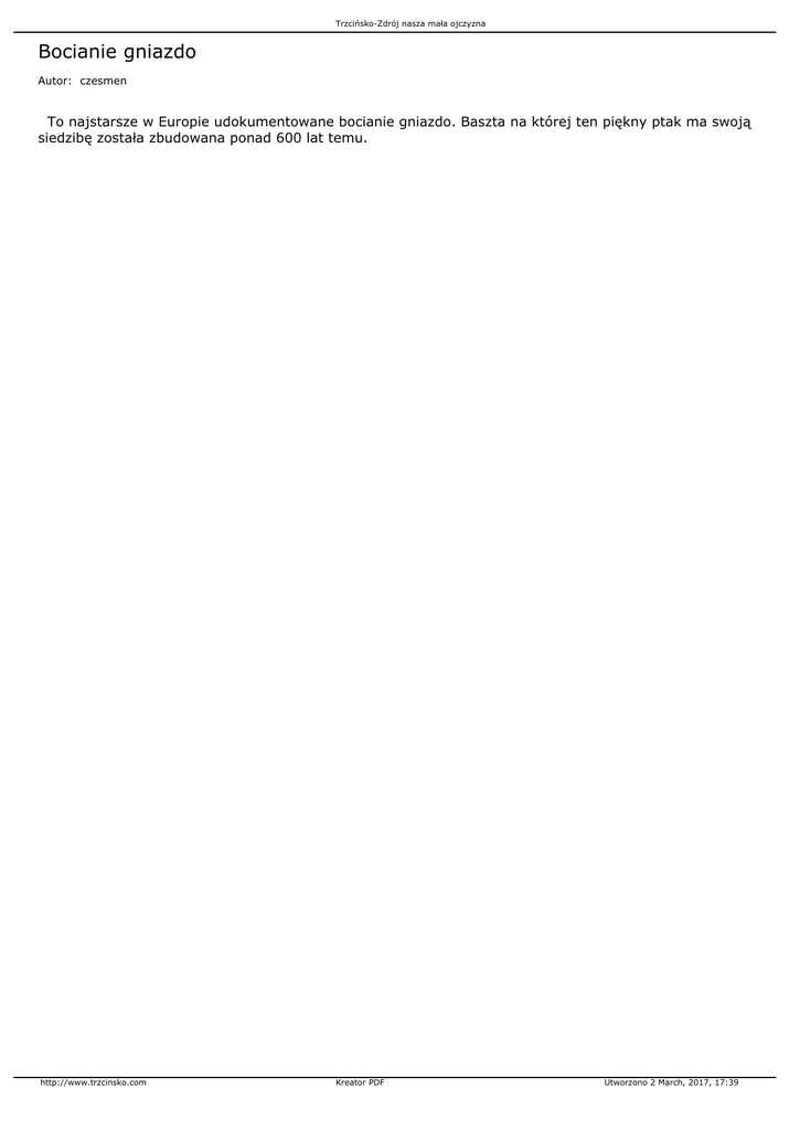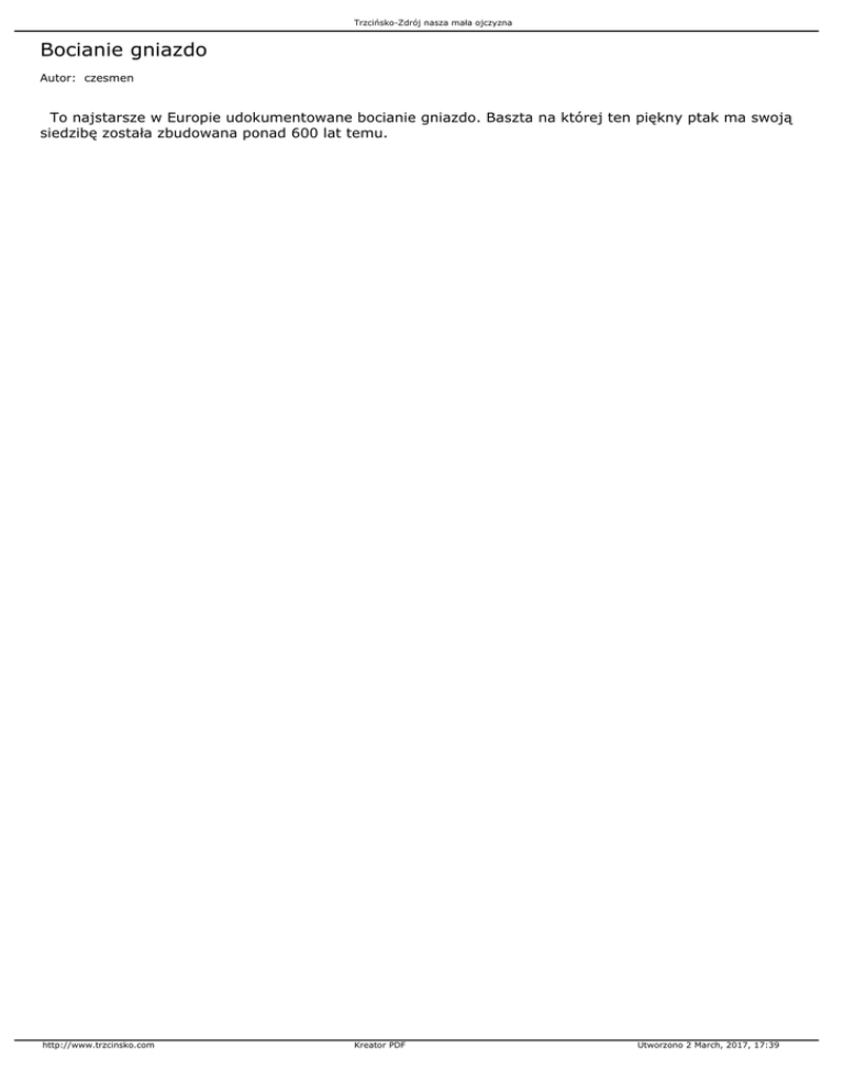Trzcińsko-Zdrój nasza mała ojczyzna Bocianie gniazdo Autor: czesmen To najstarsze w Europie udokumentowane bocianie gniazdo. Baszta na której ten piękny ptak ma swoją siedzibę została zbudowana ponad 600 lat temu. http://www.trzcinsko.com Kreator PDF Utworzono 2 March, 2017, 17:39